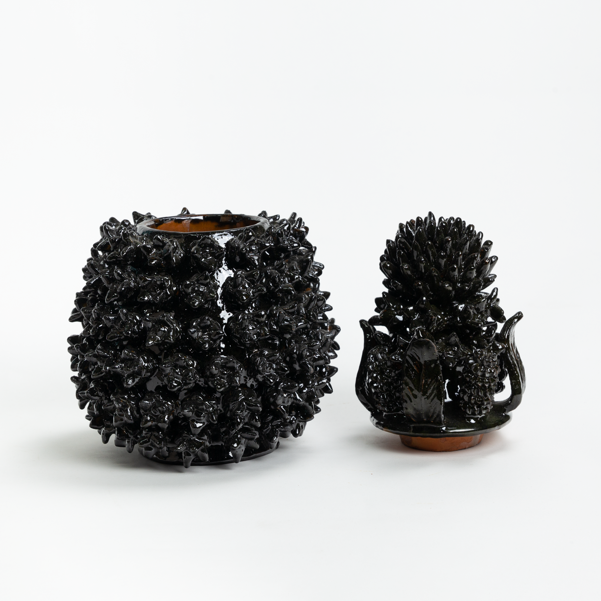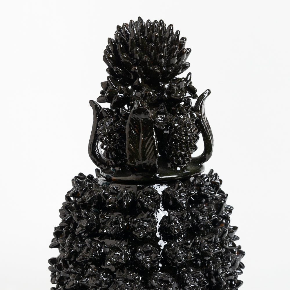 Hand made pineapple vessel, glazed shiny black. Includes Lid.