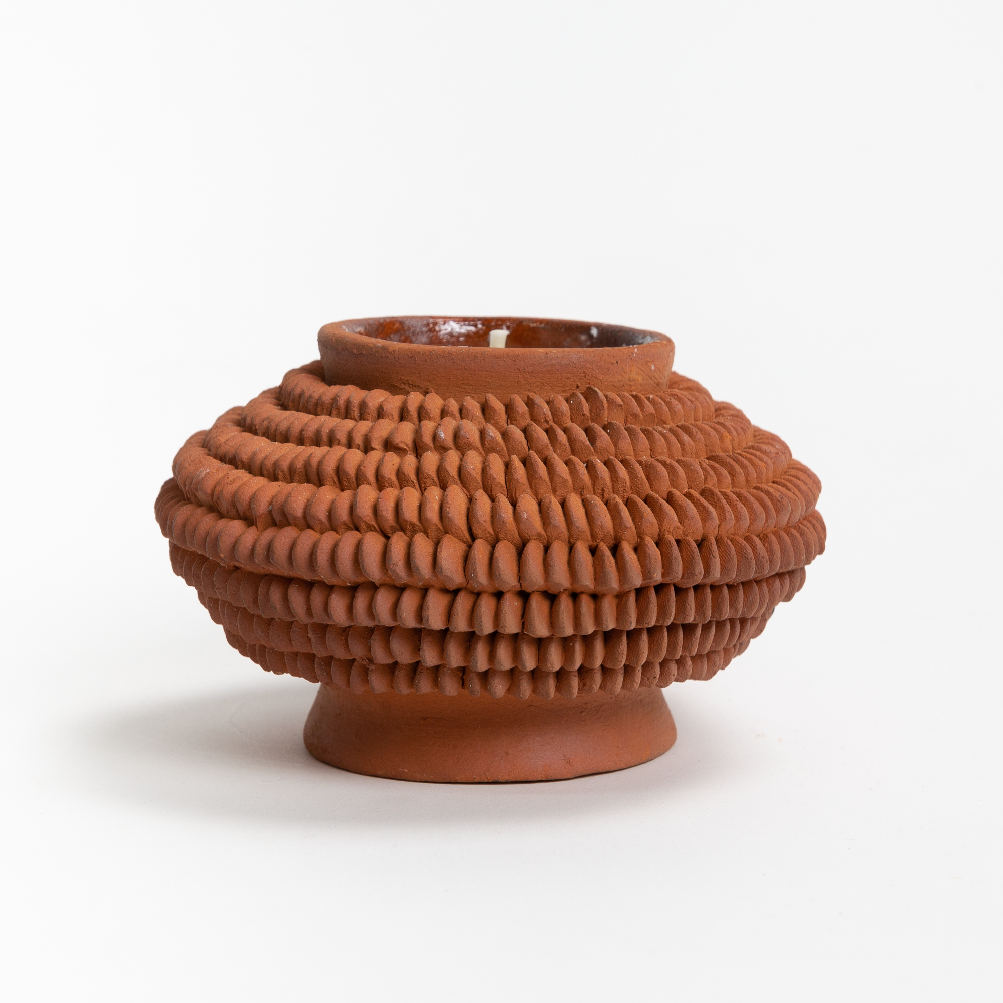 This small clay candle is handmade by artisans in Mexico. The center is filled with a wax candle. Each candle is unique. Handmade in Mexico.