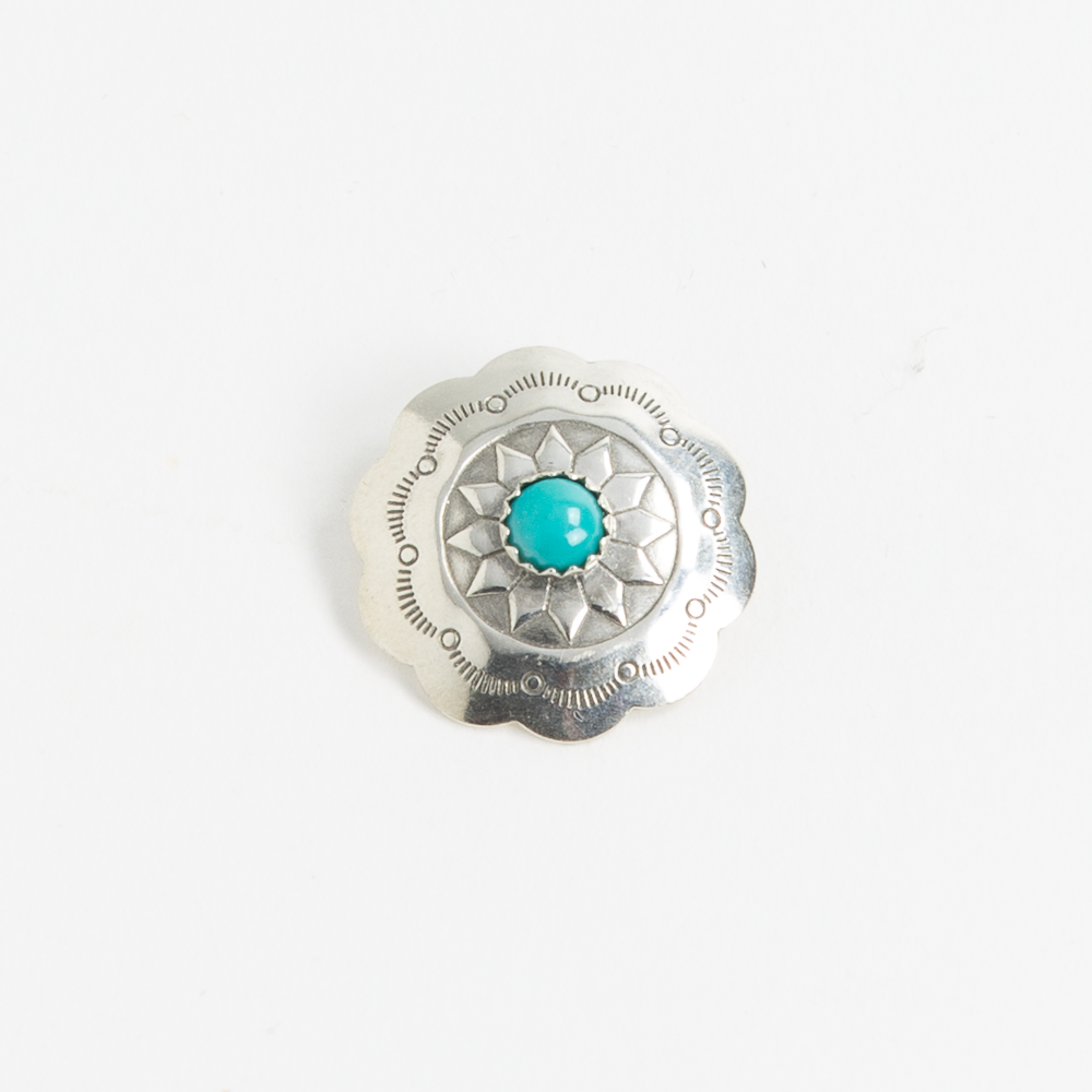 Stunning sterling silver flower concho by our friend Melissa at Rolling Stone Trading Co. This concho features a piece of Kingman Turquoise at its center. Thread any ribbon or leather tie through the loop on the back of the concho.