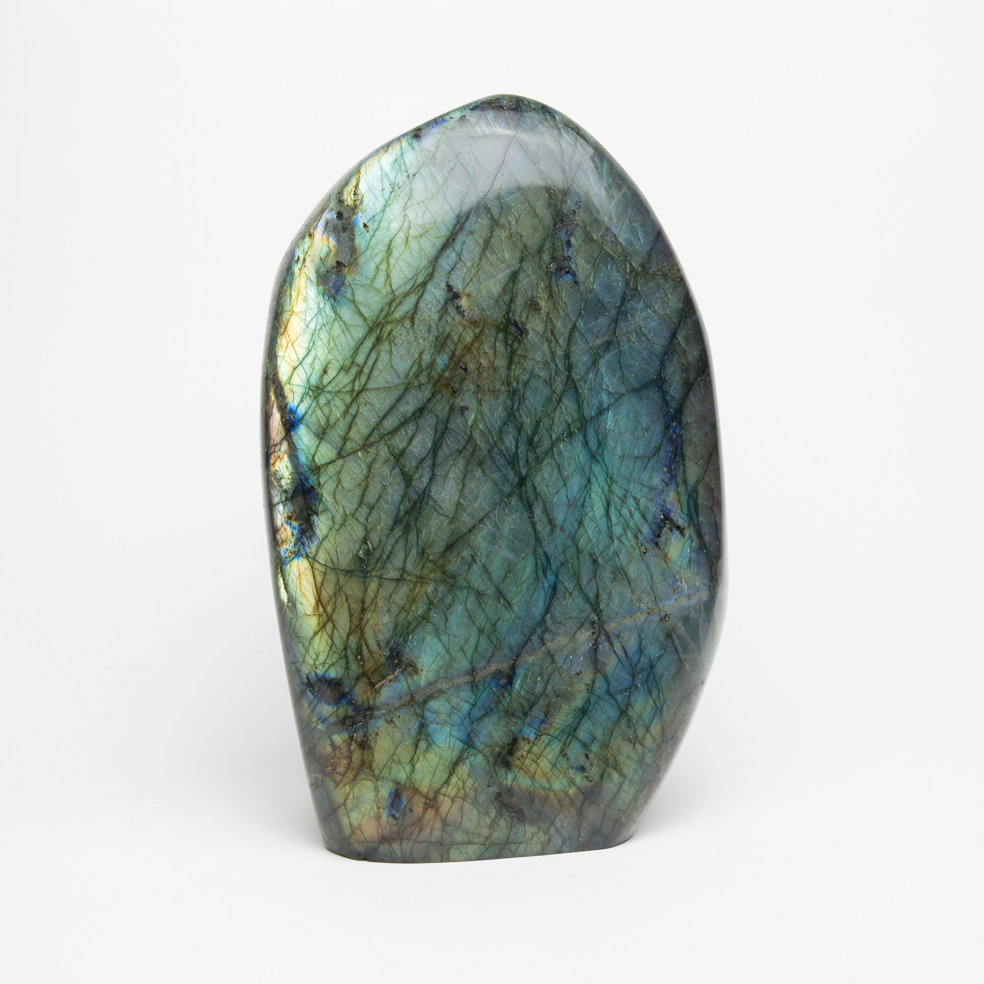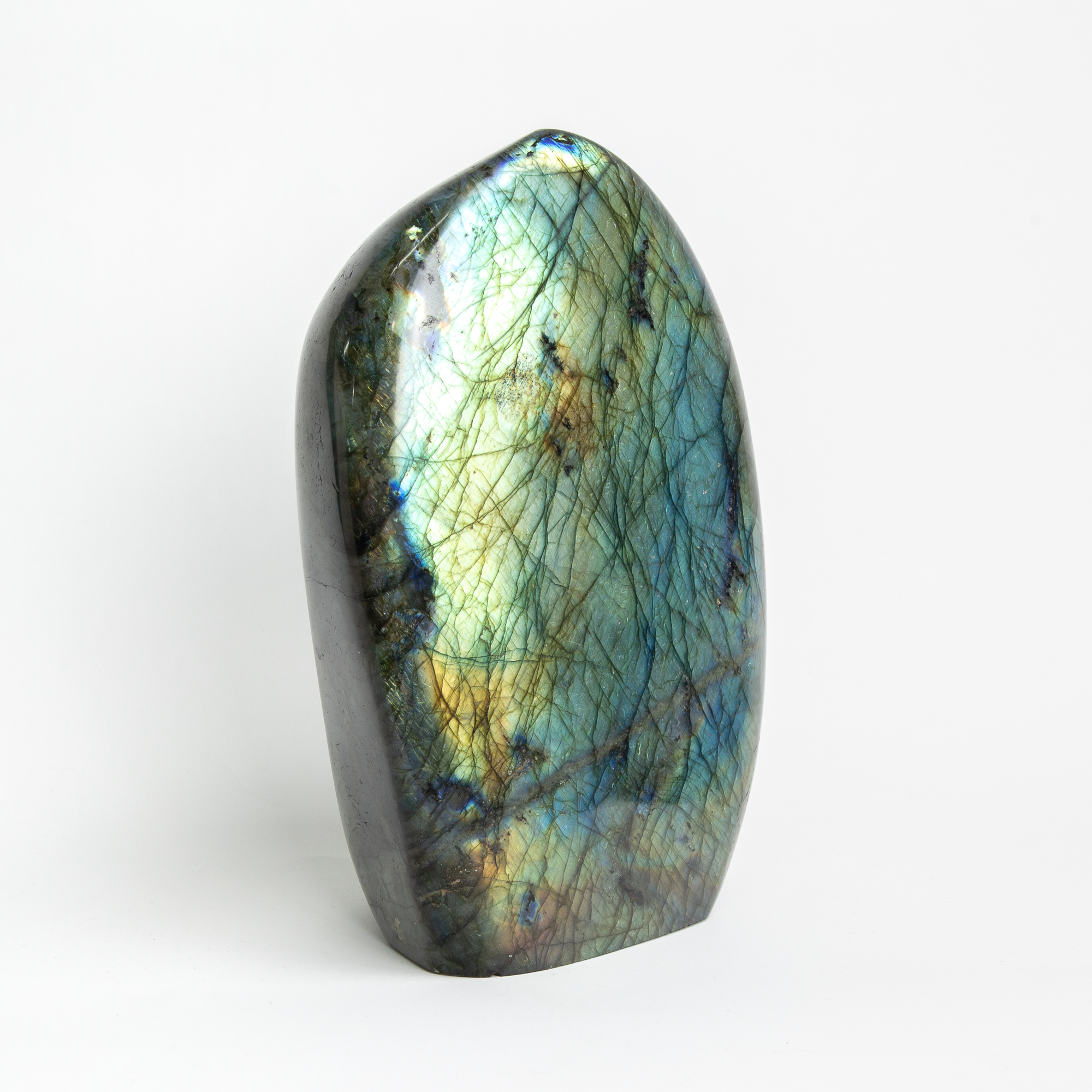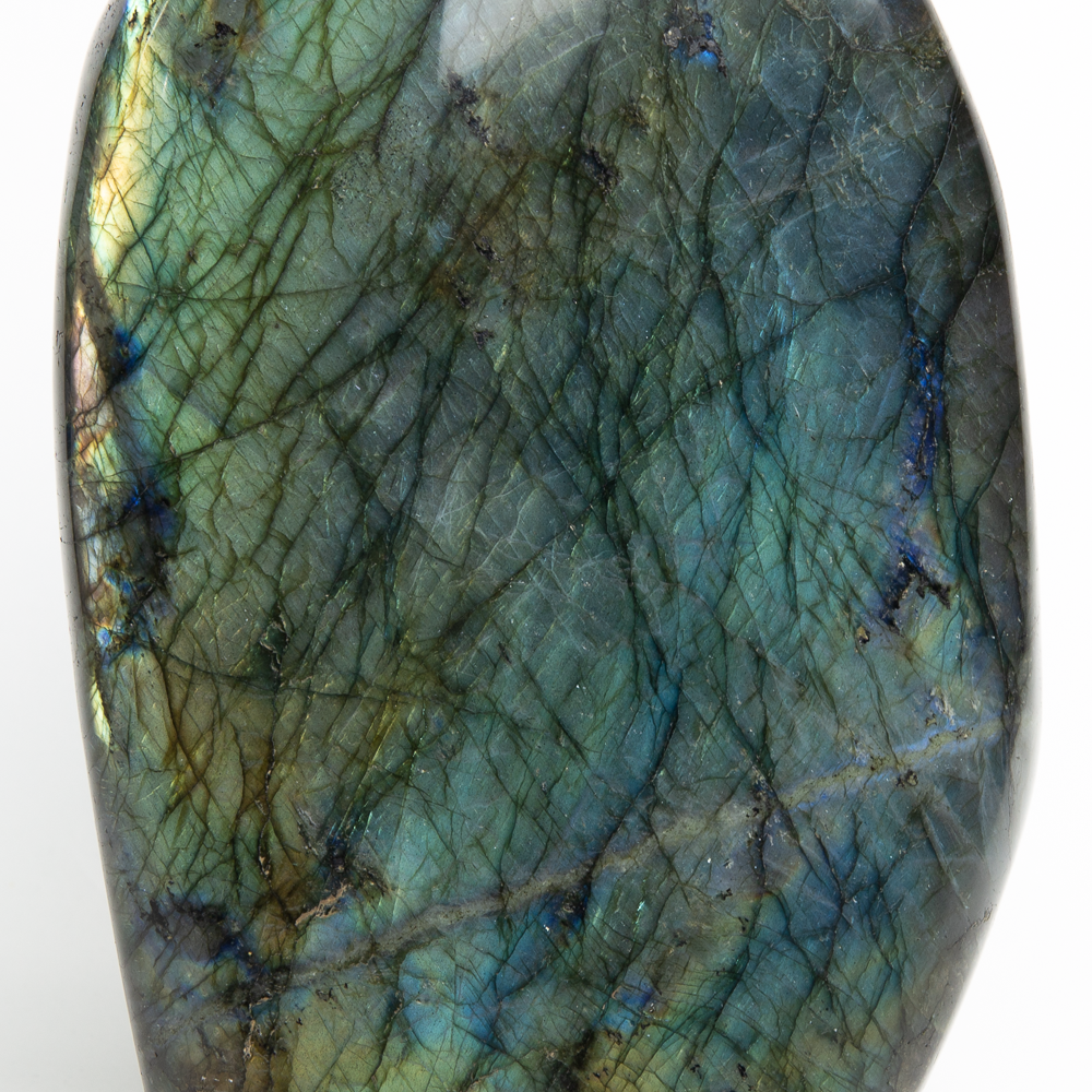 Shift back and forth to illuminate teal blues to golden hues throughout this massive chunk of Labradorite. The light diffracts across the surface of this crystal to reveal a unique property called “labradorescence.” Cut and polished to a high shine.