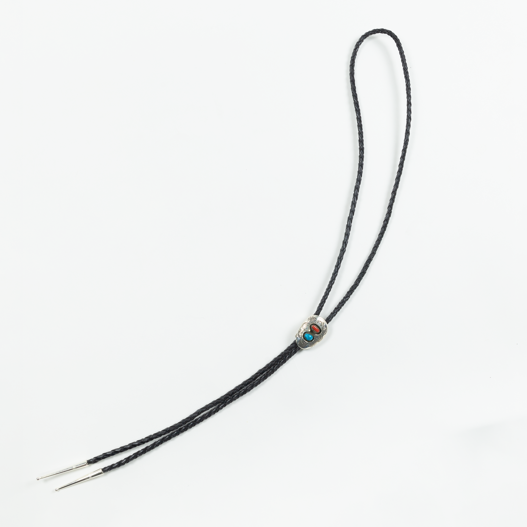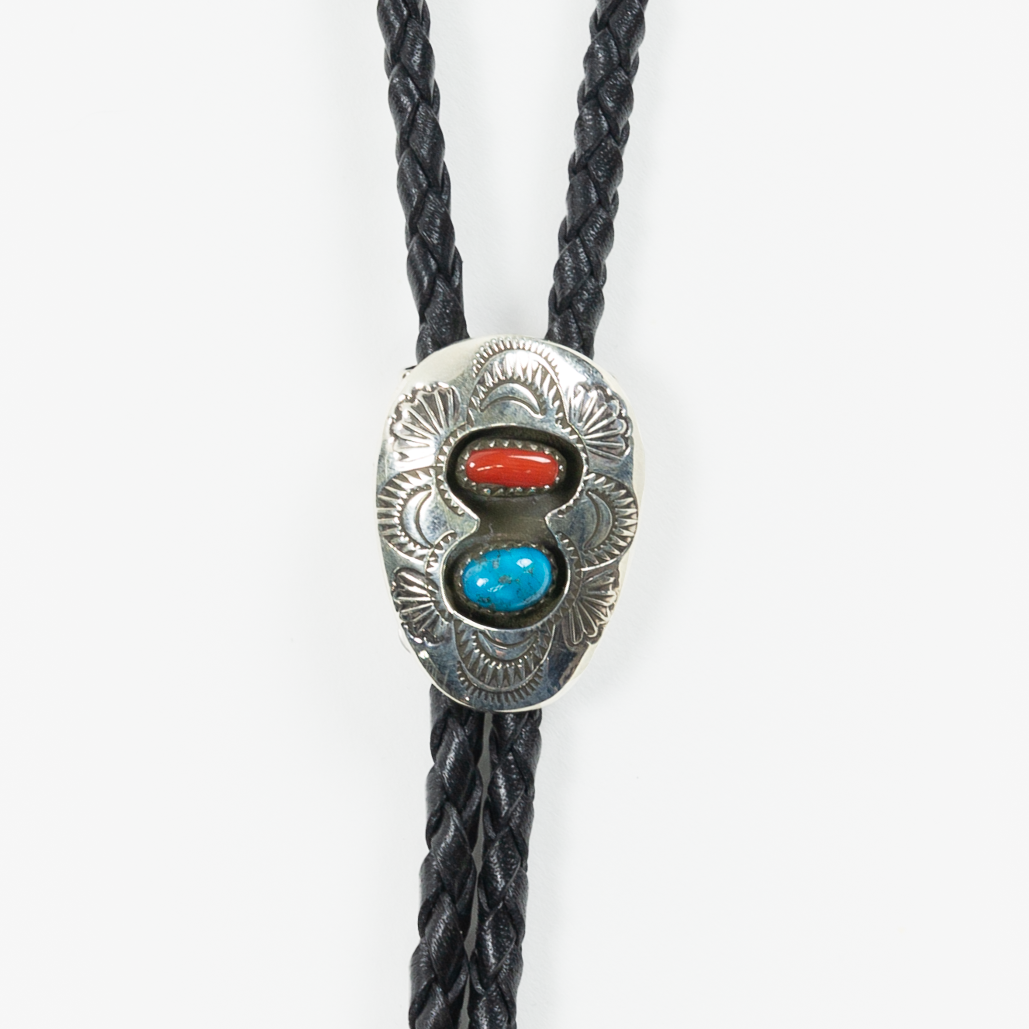 Sterling silver, Turquoise and Coral metal stamped bolo tie. Each is slightly different.