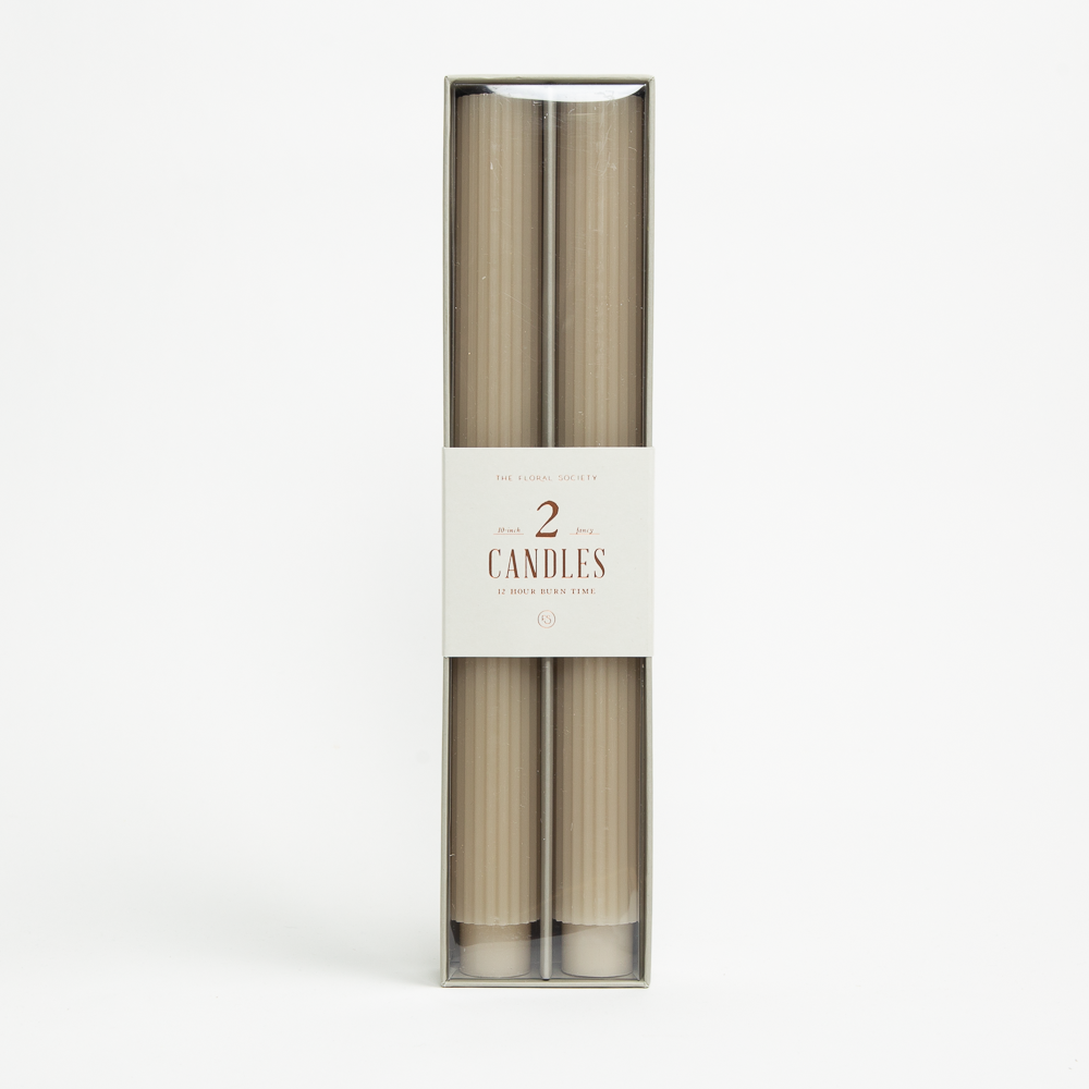 The Fancy Taper Candles are hand-molded and embody a superior depth of color. A cotton wick is used for the cleanest burn, and the base is sized to fit a standard holder. Each candle is crafted to burn for 10 hours. Subtle variations in wax depth and color opacity may occur.