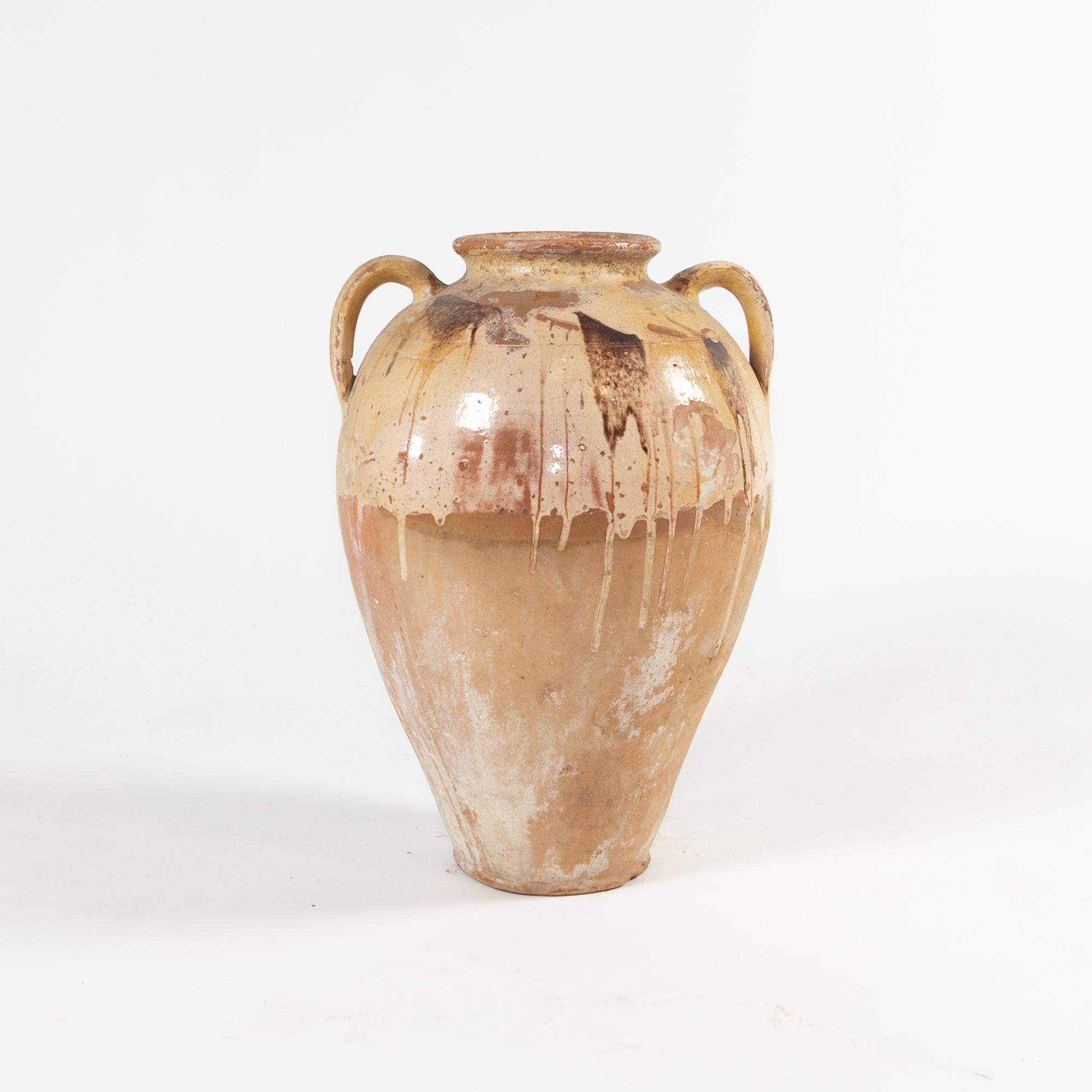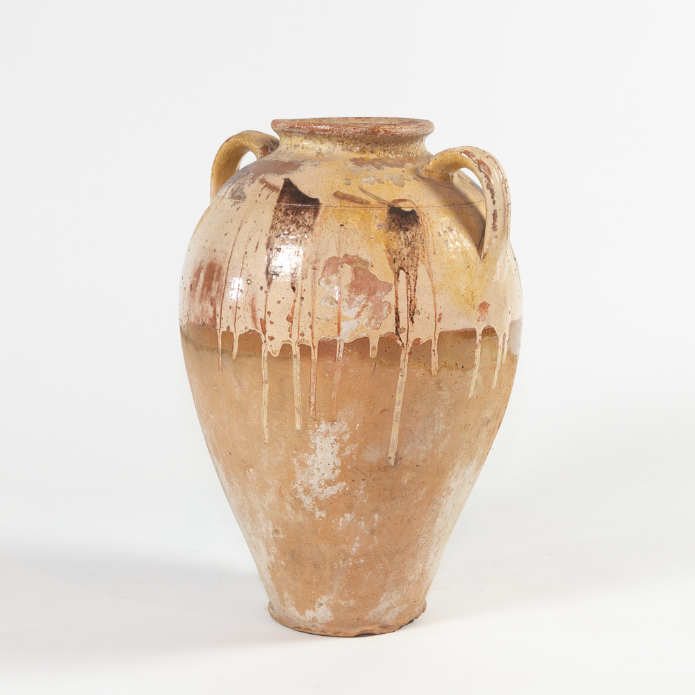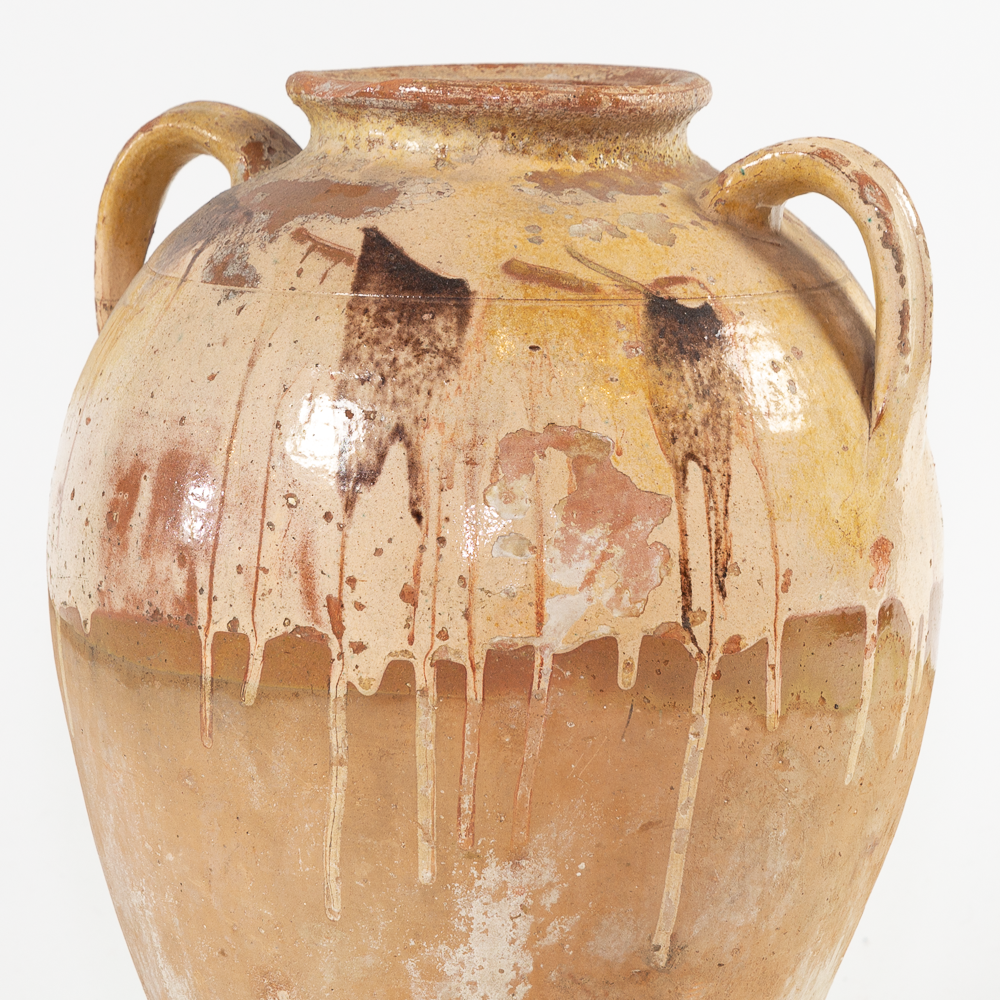Tan clay with cream, brown and yellow glaze drip. Features two in-tact handles, chips and color variation from age. This pot is not water-tight.