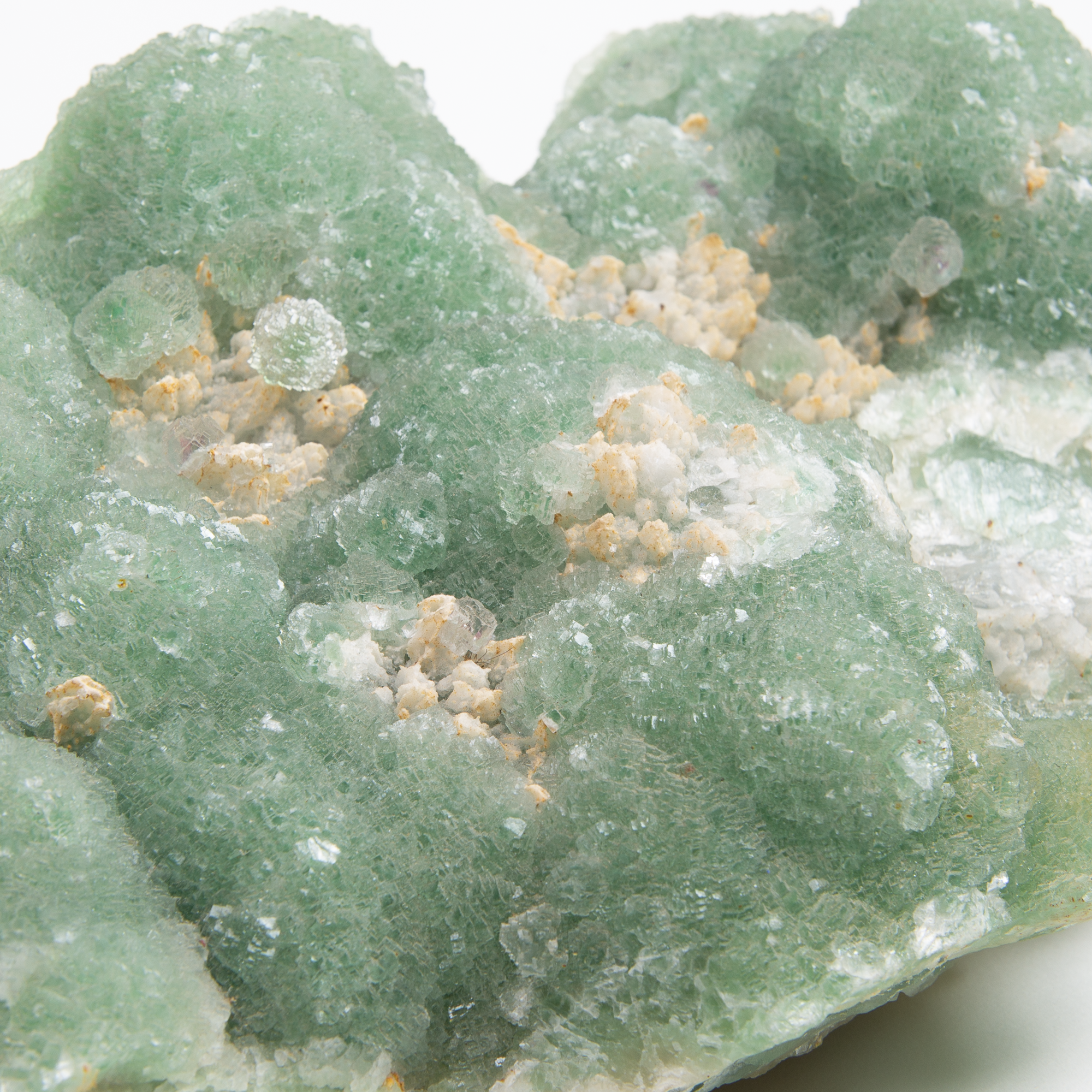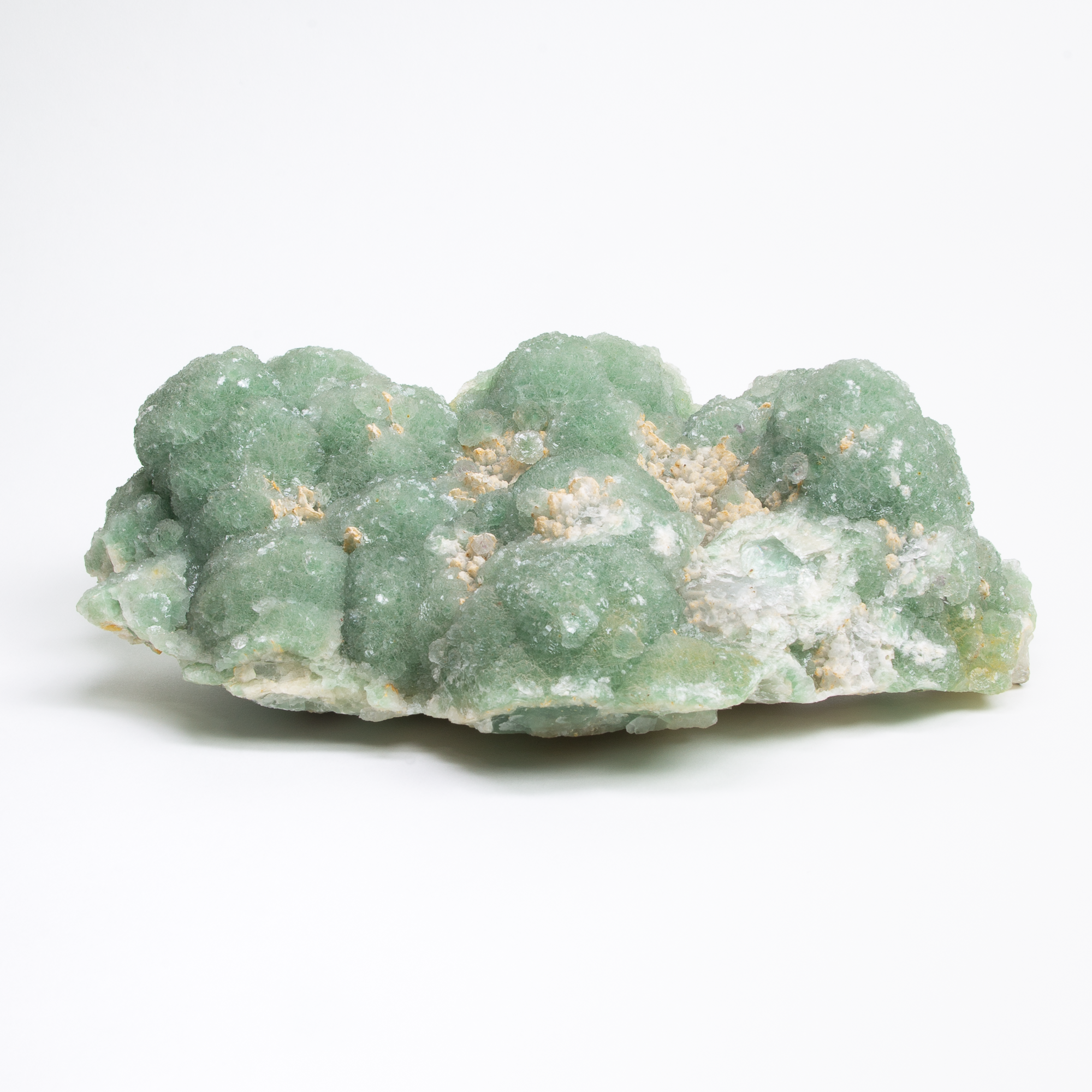 Green fluorite crystal cluster. Smaller crystals on one side, larger clusters on other. Fluorite has a healing energy, and can help balance a busy lifestyle. Use fluorite when planning your to-do list.