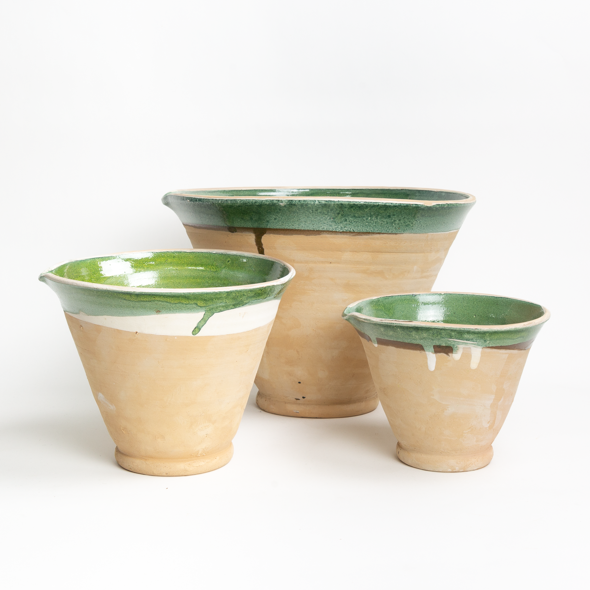 These mixing bowls are handmade with green glazed interior. Color variations from apple green to sage and slight size differences will occur. Sizes are sold separately.