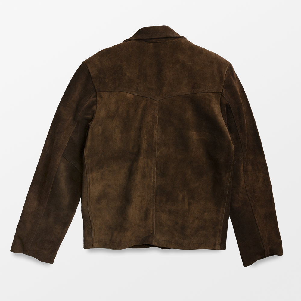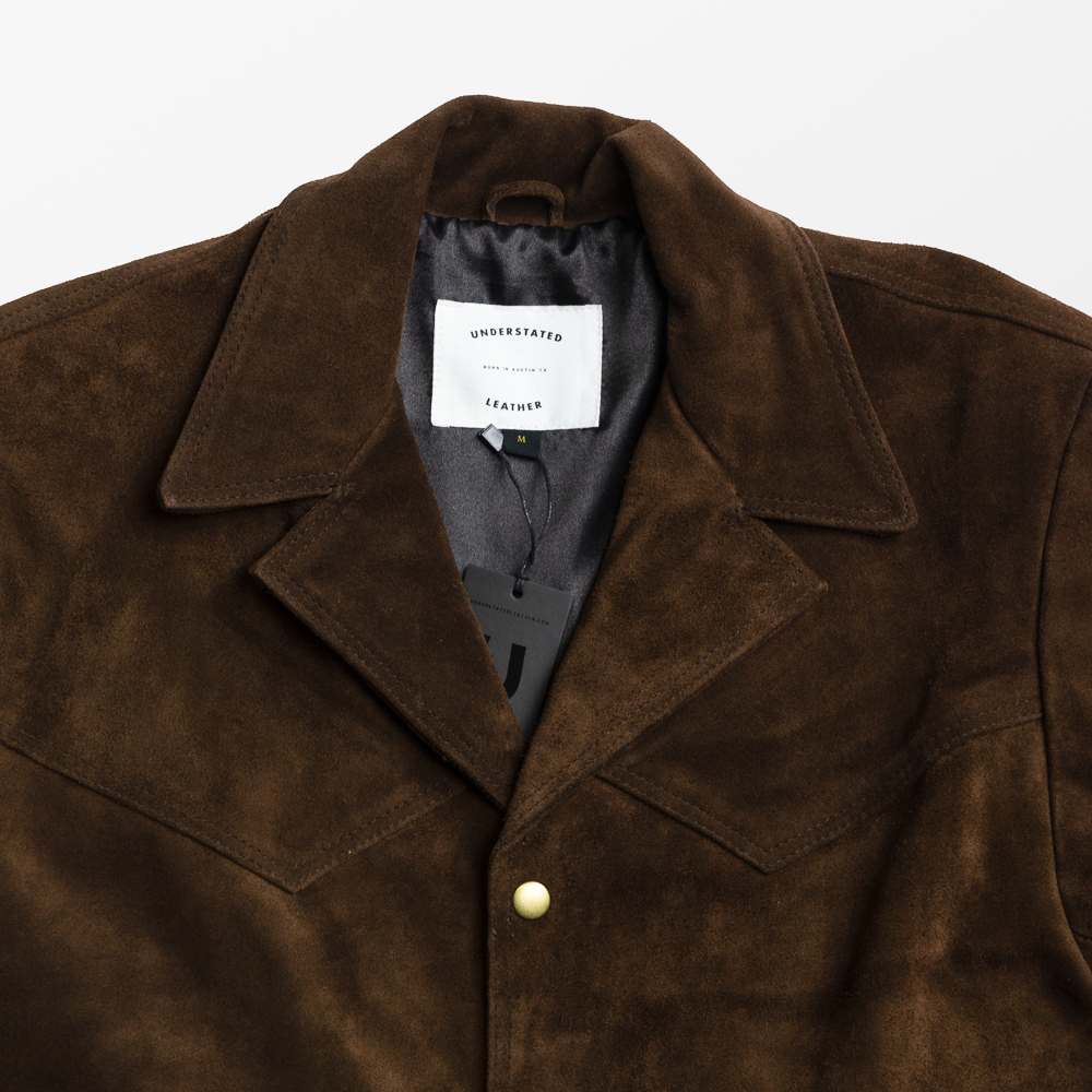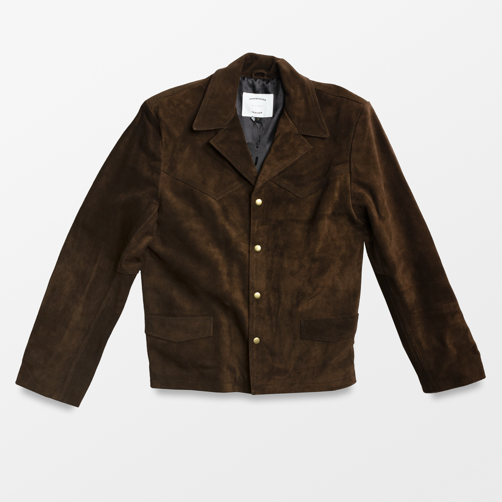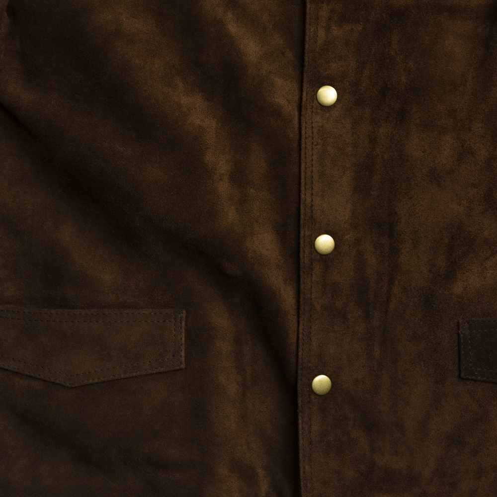 Western chocolate suede leather jacket, featuring classic western collar and brass snap button closures. Made for Maufrais in collaboration with Understated Leather.