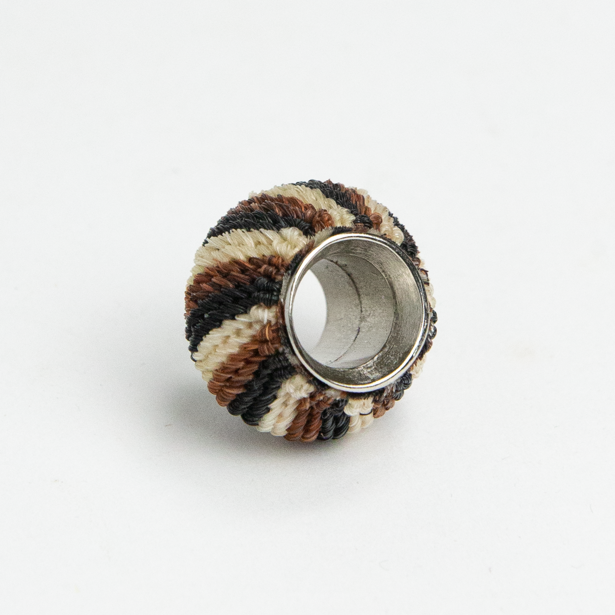 Hitched horsehair bandana slides on silver. Pattern features brown, white and black stripes.