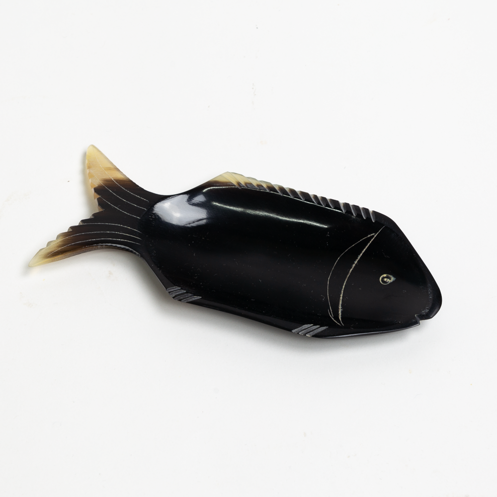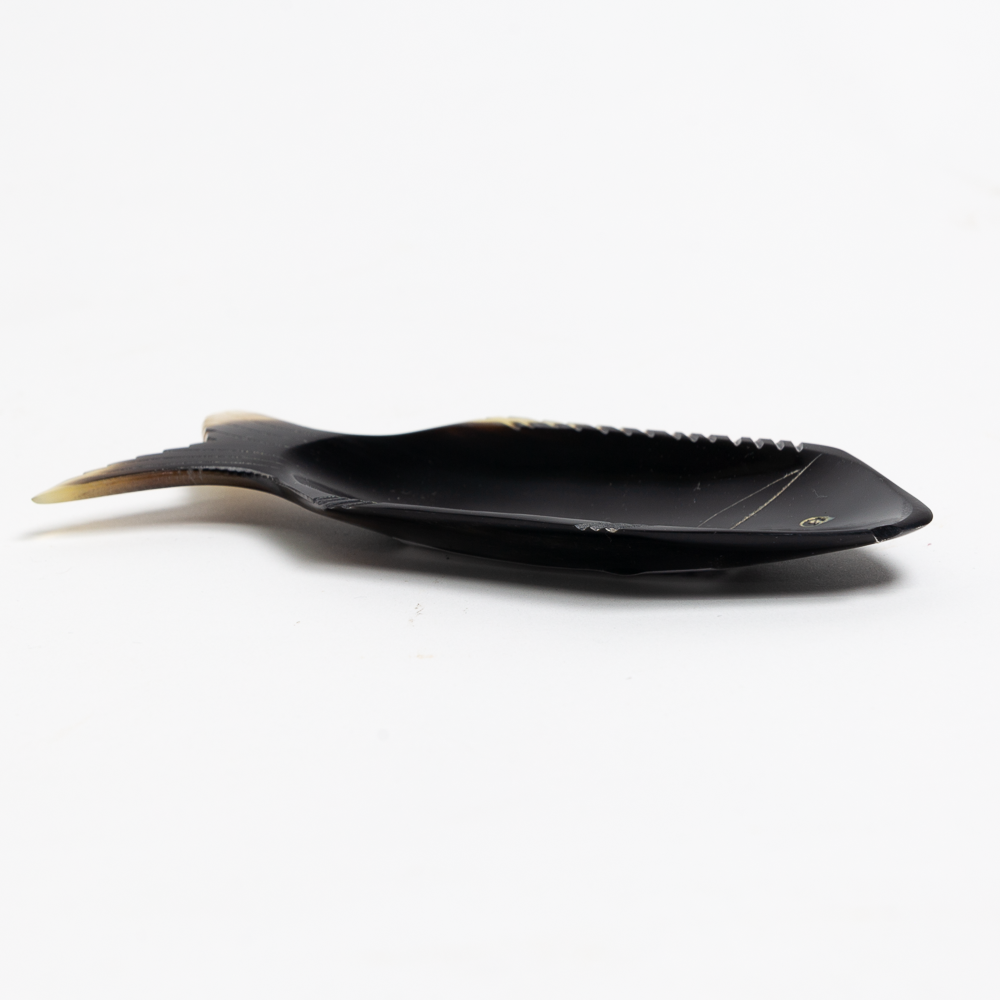 Shallow fish shaped dish made of horn and coated in resin. Each dish is different. Tones vary from tan to deep brown to black. Each individual dish varies in color and pattern.