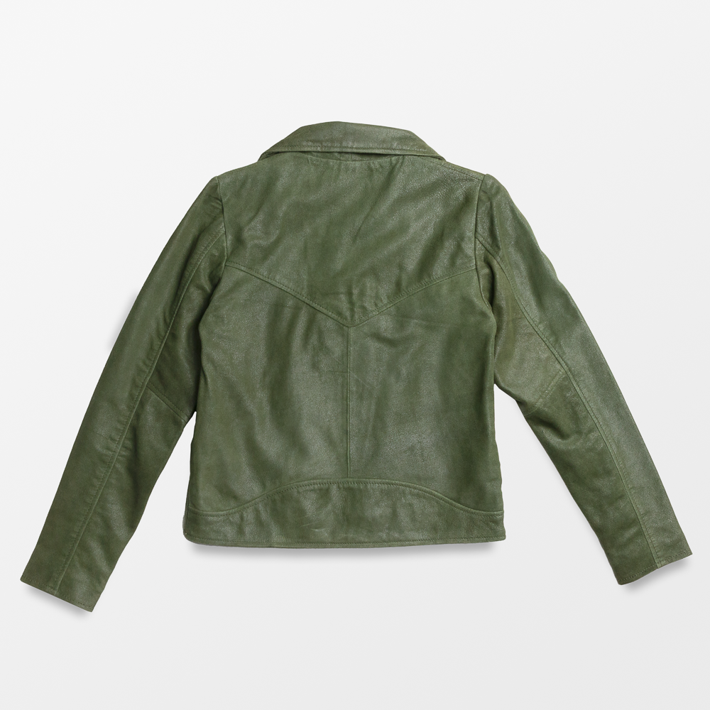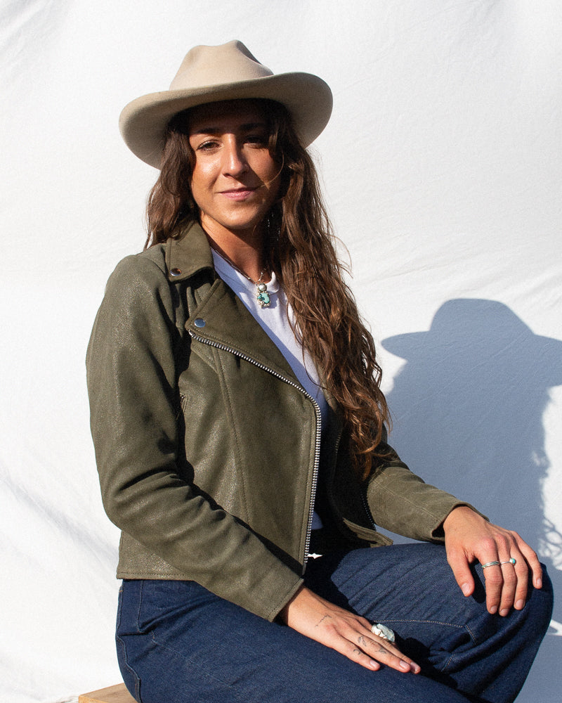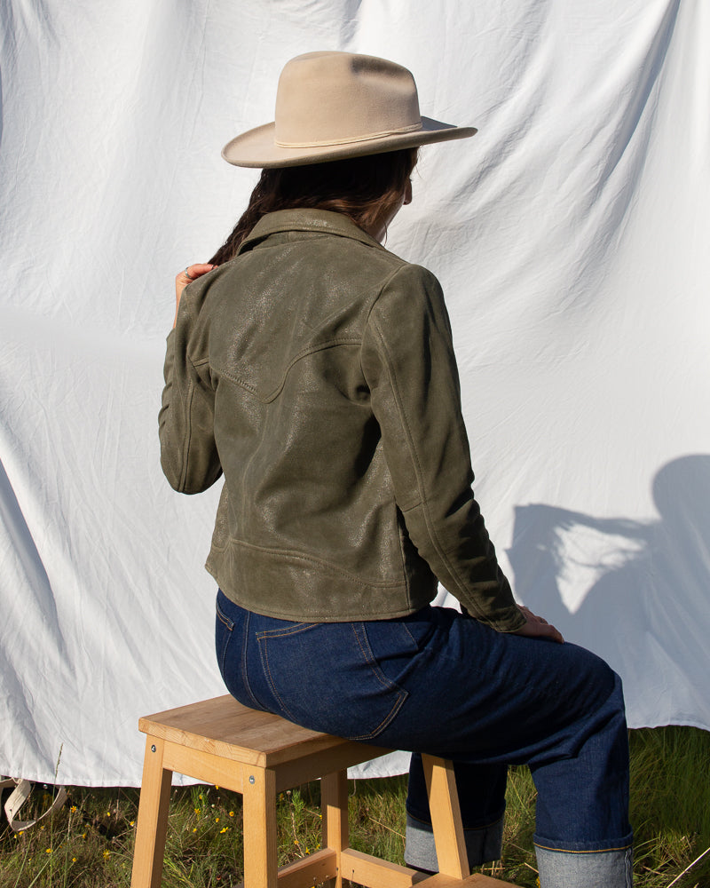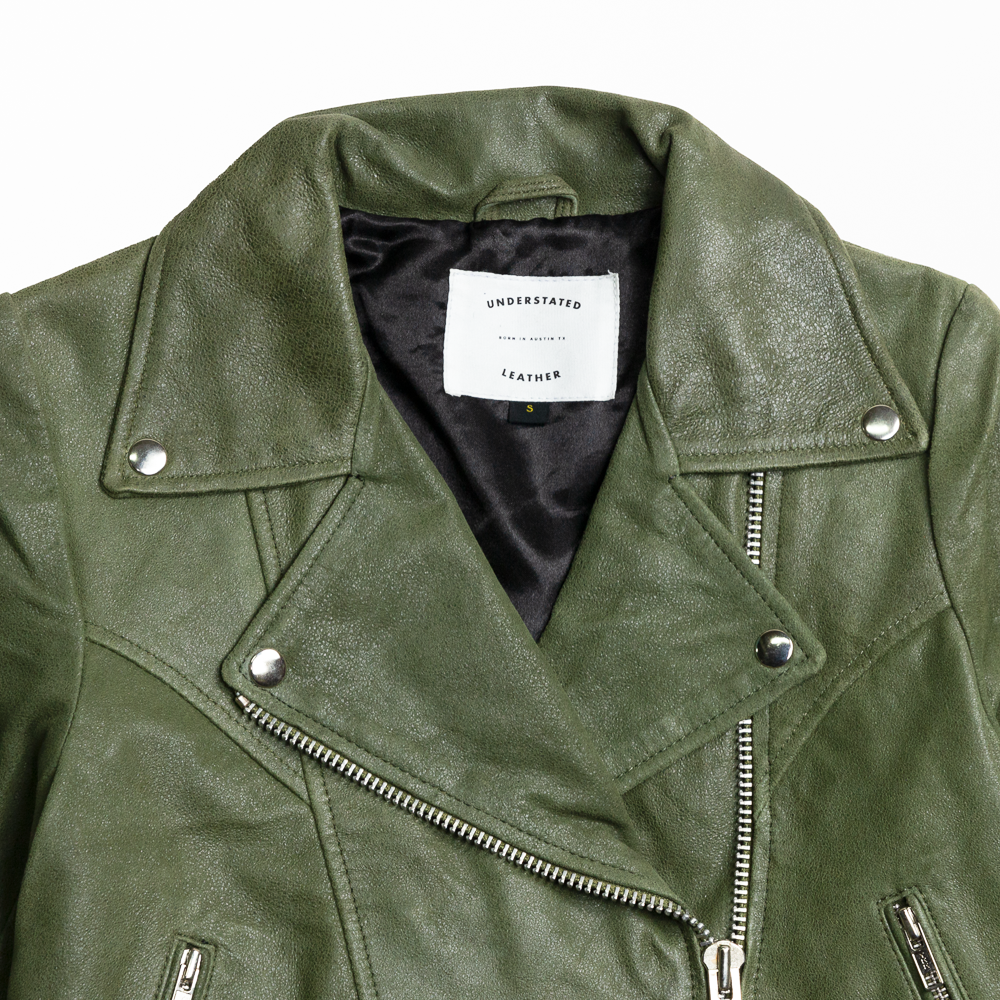 Stay outside the box in our unique pebbled olive goat suede leather moto jacket in collaboration with Understated Leather. With subtle western details and classic moto jacket hardware, this leather jacket moves easily from day to night.