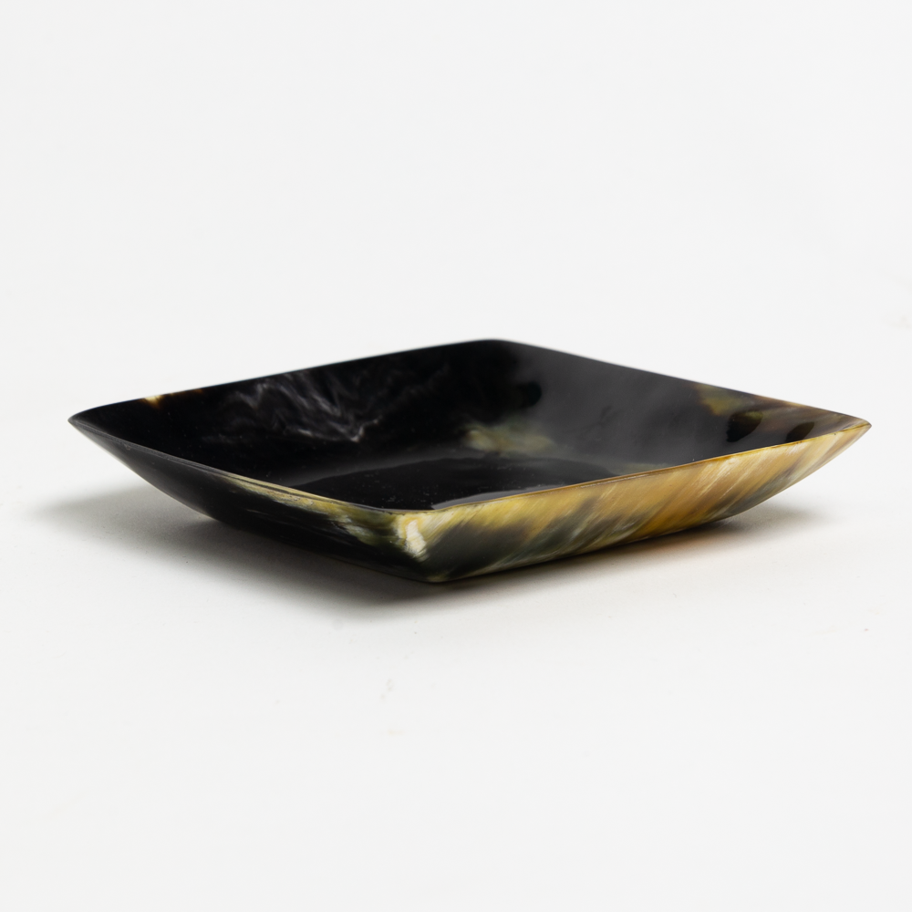 Shallow square dish made of horn and coated in resin. Each dish is different. Tones vary from tan to deep brown to black.
