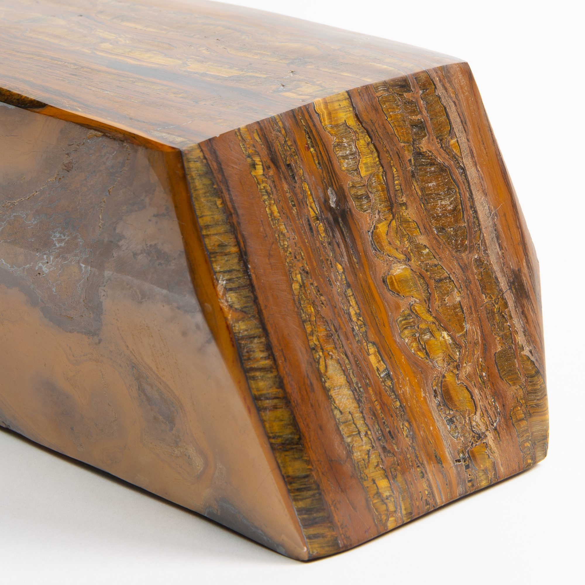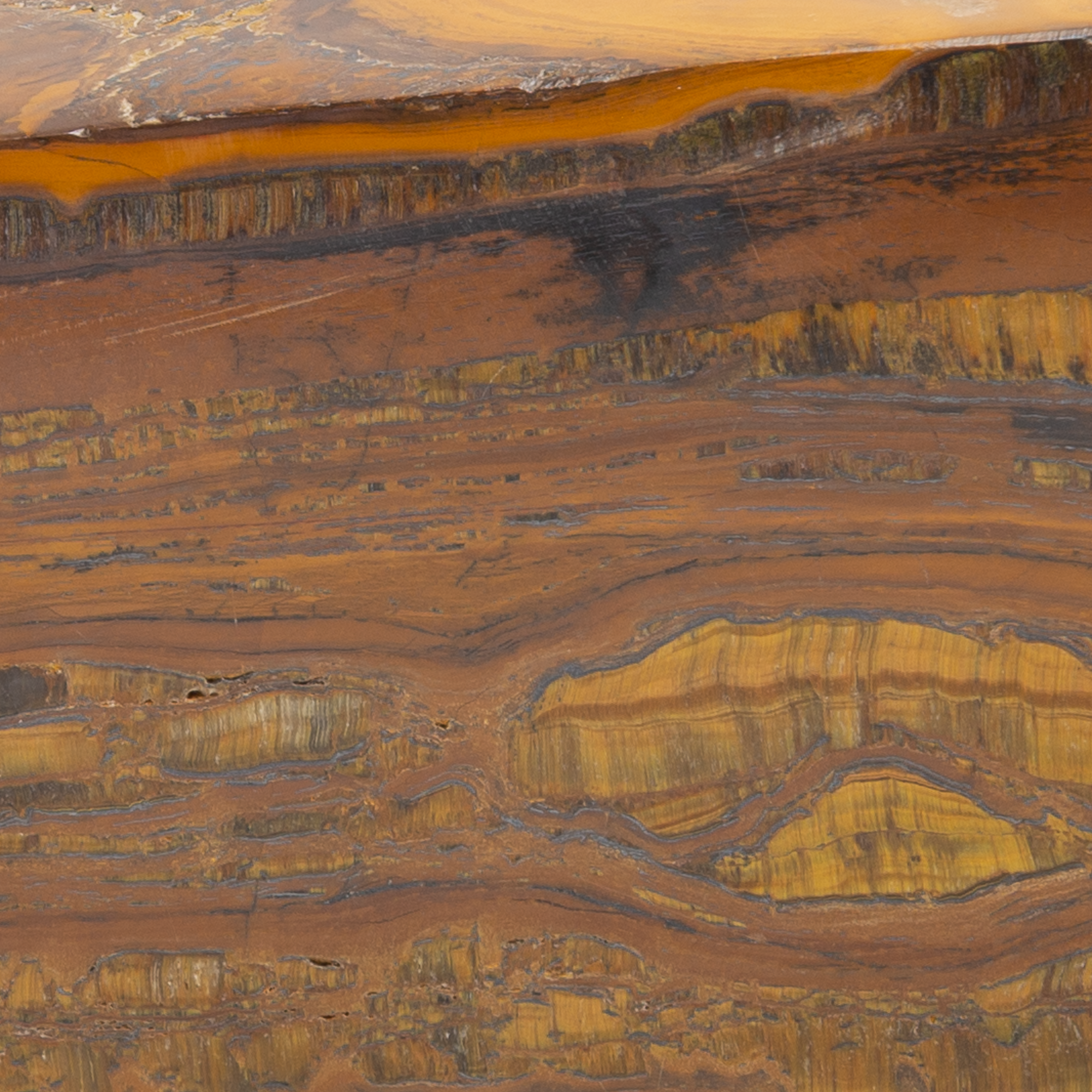 Large brick of tiger's eye featuring light catching banding throughout middle. Gold Tiger’s Eye brings gifts of confidence and self-awareness. It helps us to see and respectfully acknowledge our own wants and needs, as well as those of others.