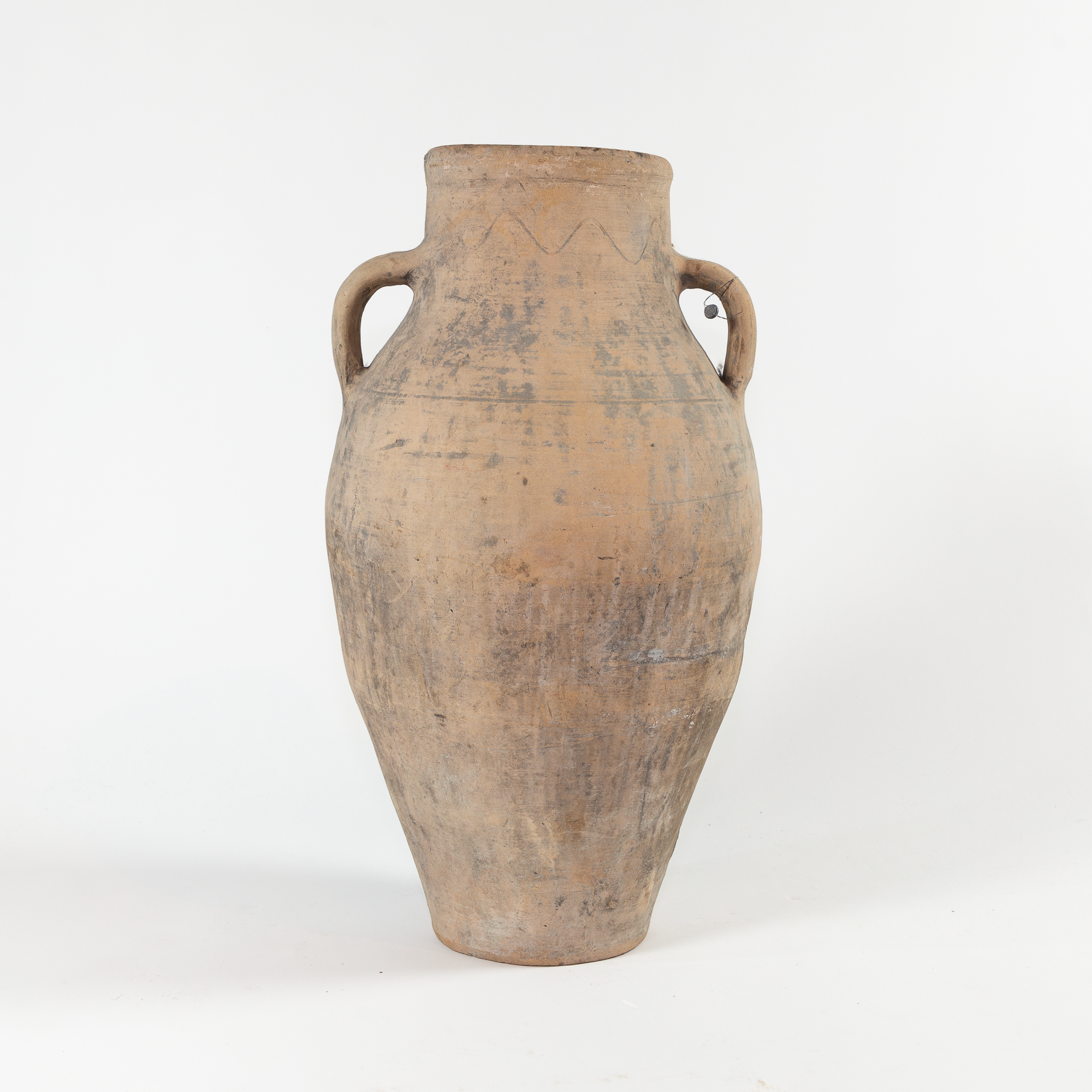 Aged and muted color clay. Features two in-tact handles. This pot is not water-tight.