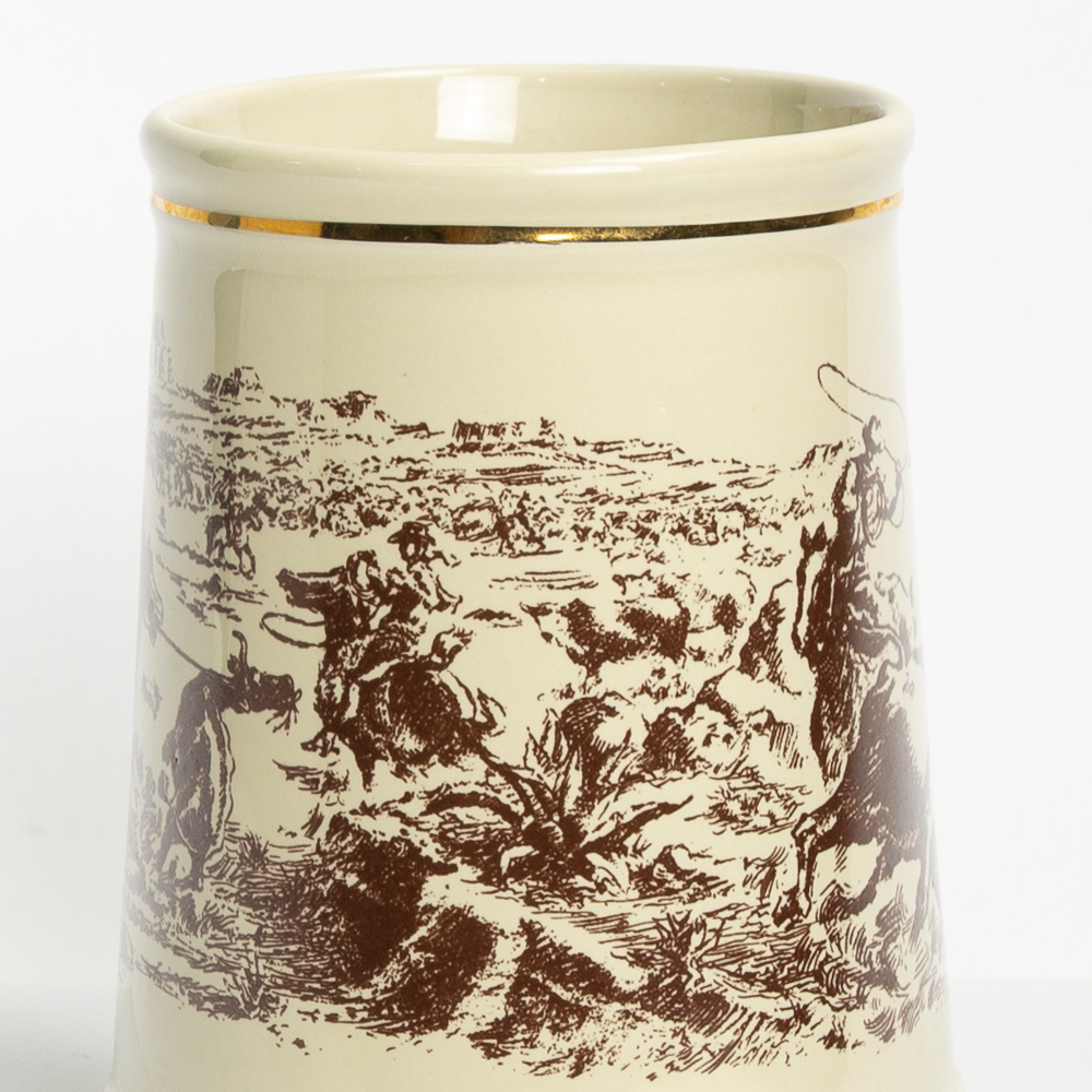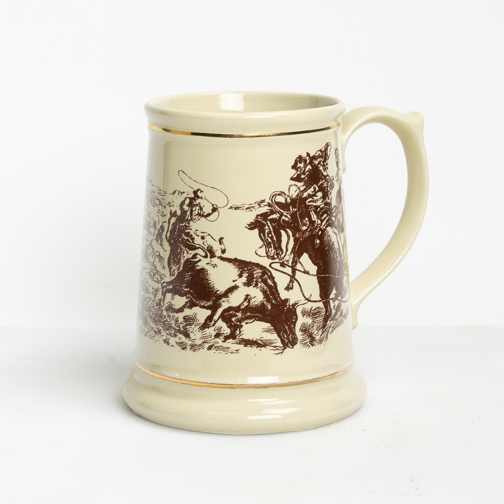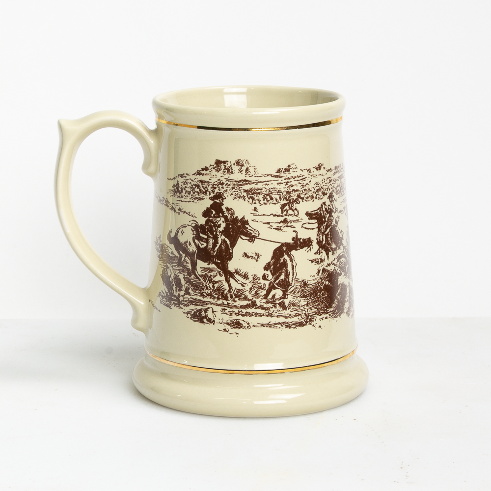 This vintage beer stein sets the scene featuring a western tableau.