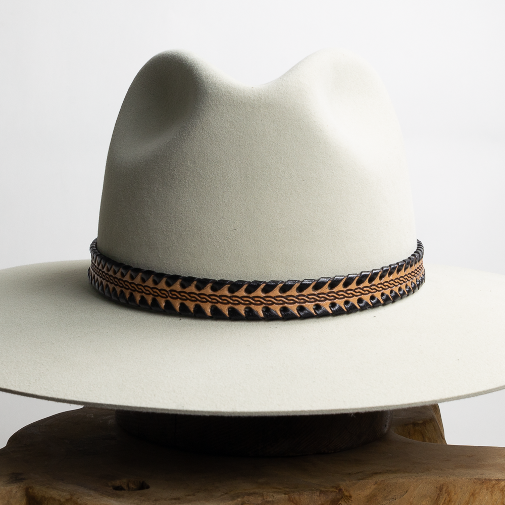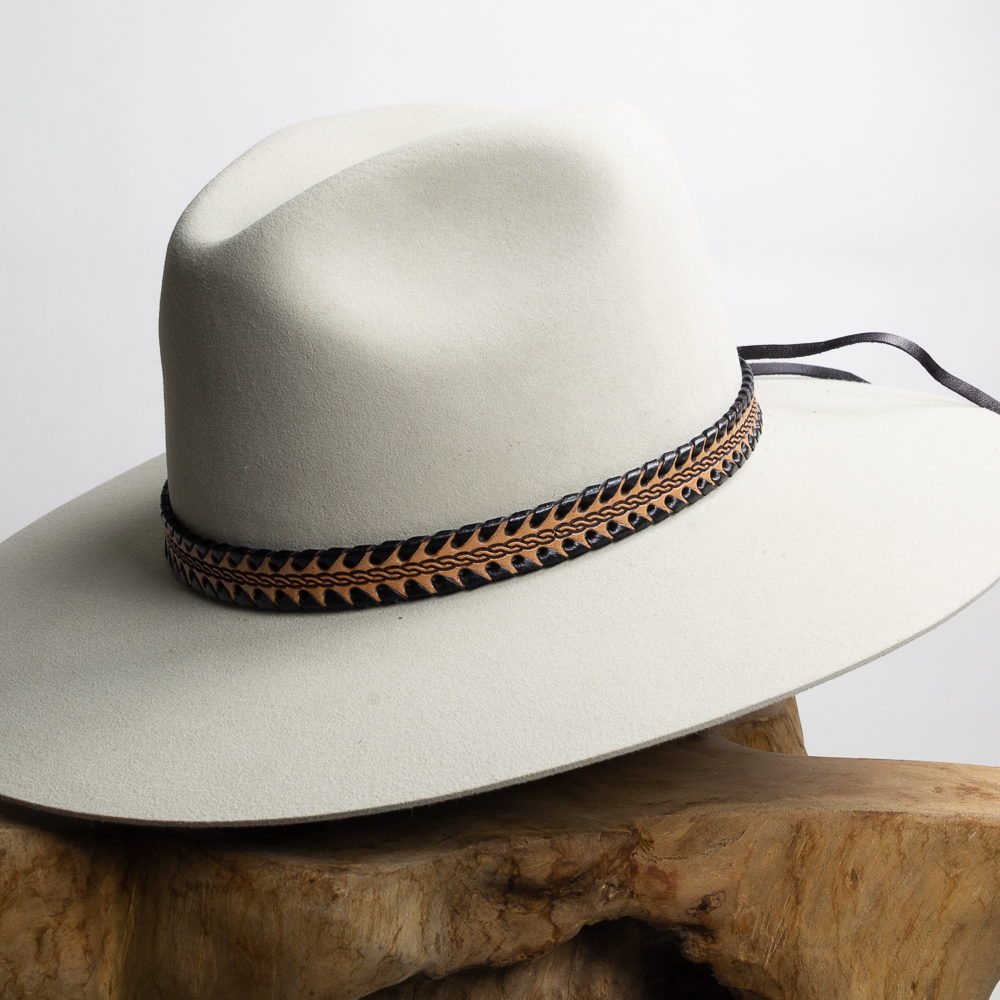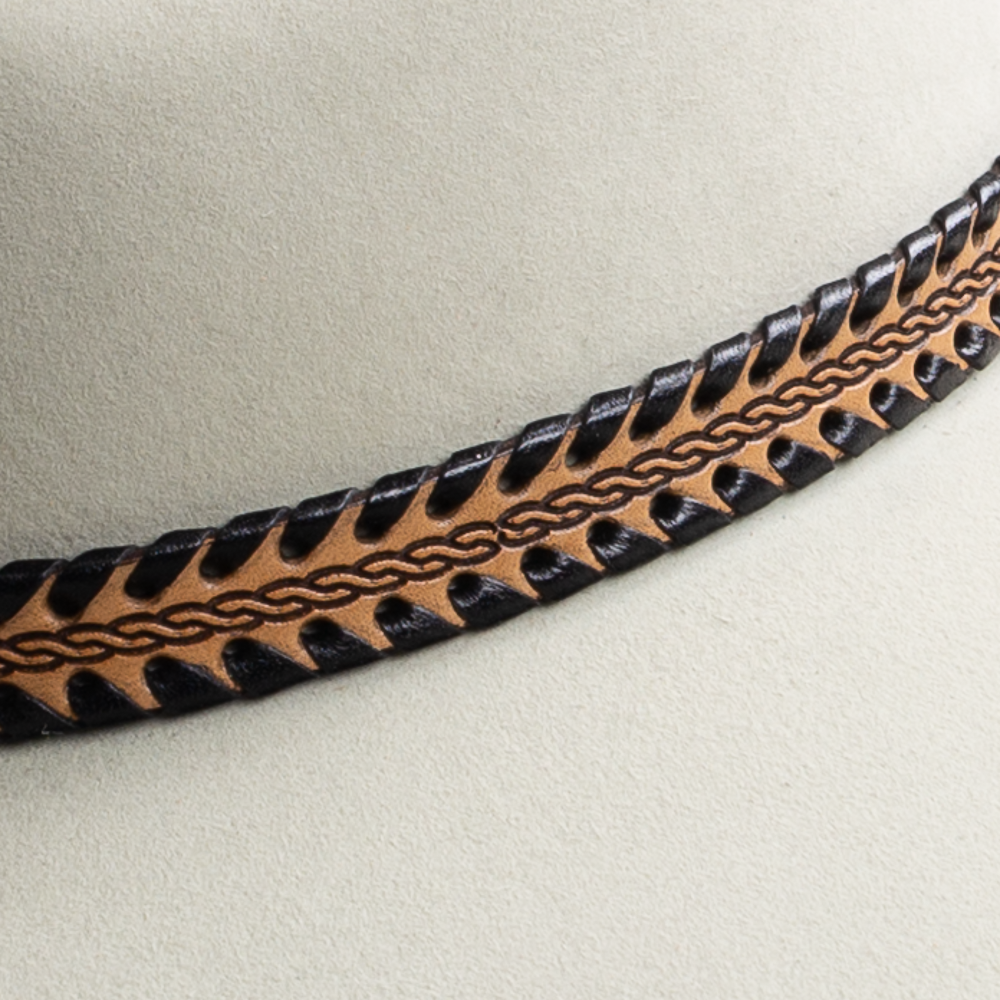 This classic leather band feels just the right amount of western with its whipstitch patterning, a motif frequently found in western wear, bags, belts, and all types of leather goods. Perfect for pairing with your brand new pair of boots, or just giving a nod to the old pair you’ve worn your way through, this band stands on its own but can always be given that extra elevated flair when paired with other accessories. Simply secure by pulling tight around your hat and tying with a square knot on either the left or in the back of your crown.