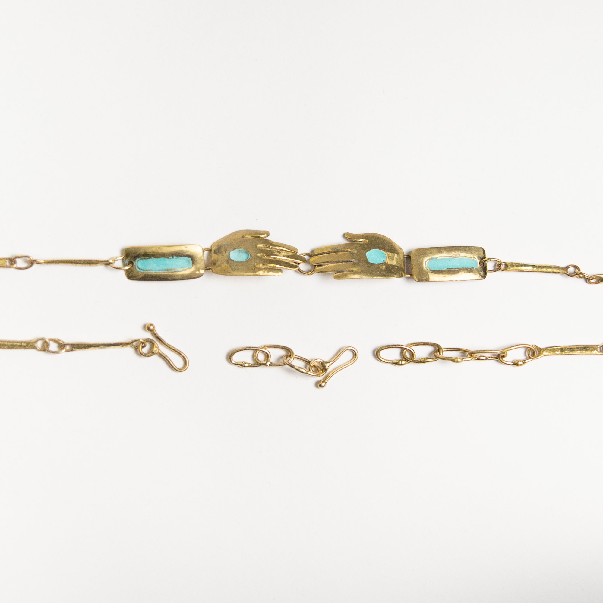 Handmade hand motif brass and turquoise hat band with adjustable links and hook closure. Each band comes with an extender for sized 7 1/8 and up!