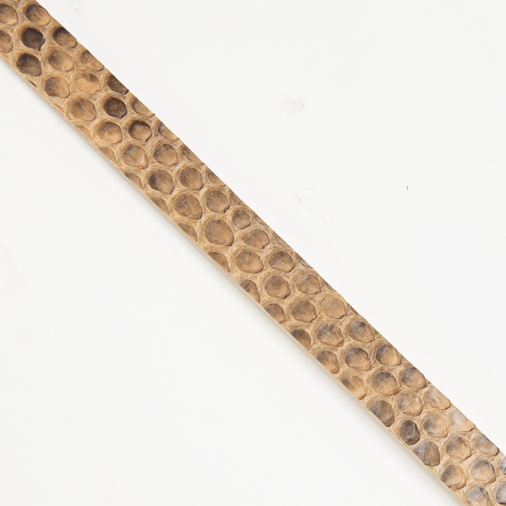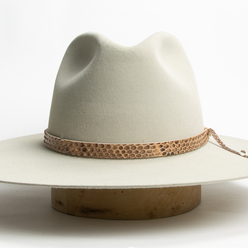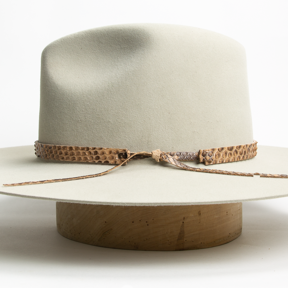 Python skin on veg tan leather to add a bit of "out there" to your hat styling. Each band is unique and varies from white to grey texture. You can secure the knot to the left side of the hat or to the back - whatever you please!