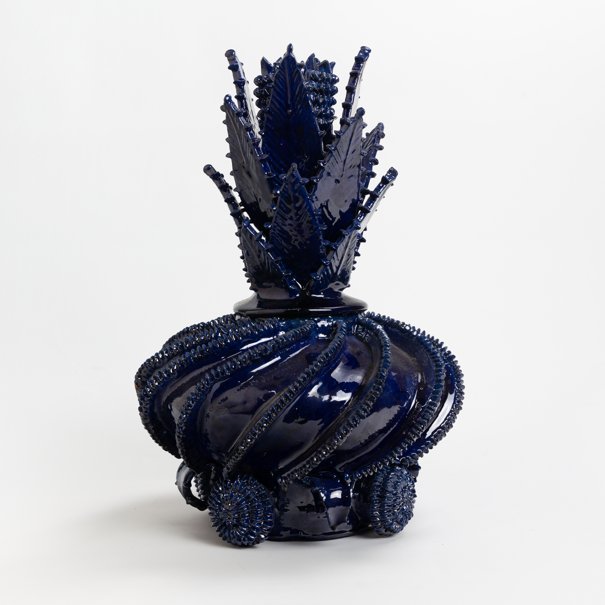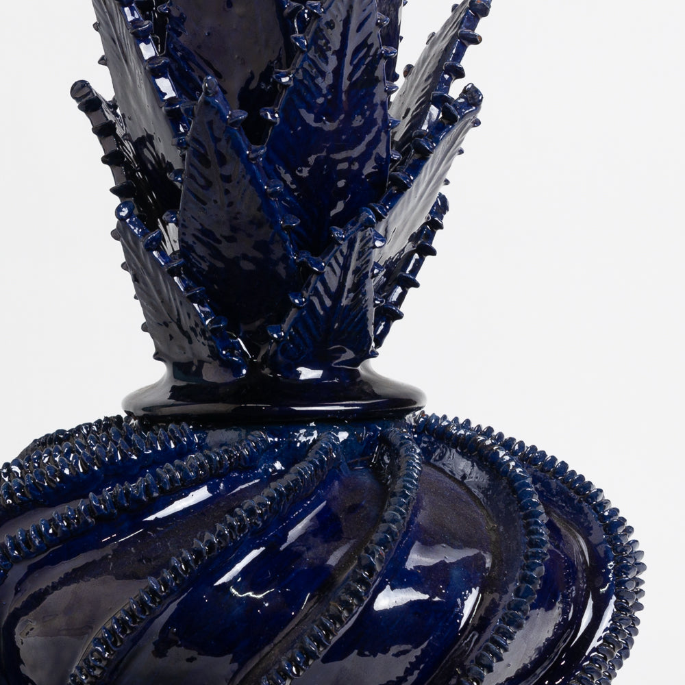 Navy glazed abstract pineapple sculpture. Handmade in Michoacán, Mexico.