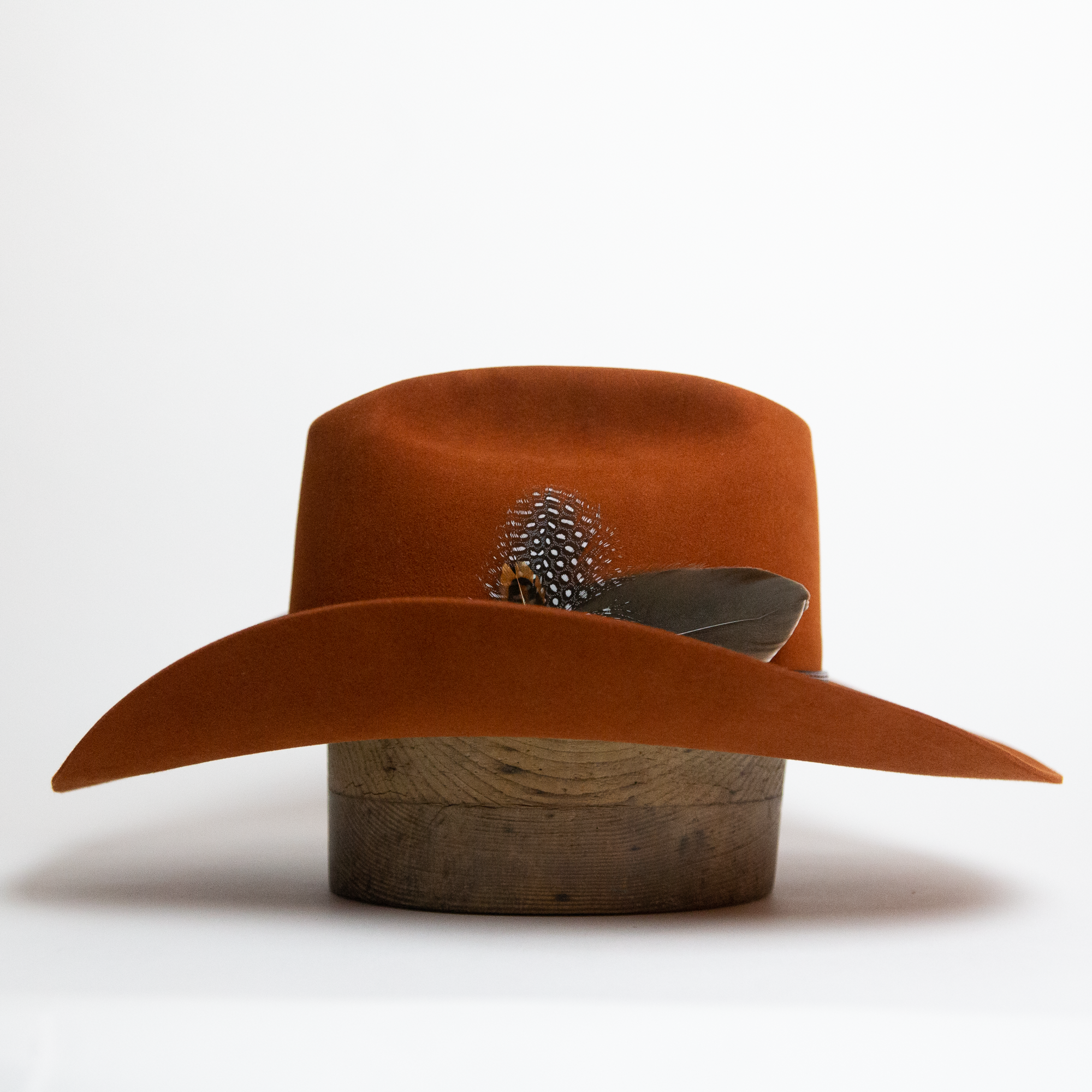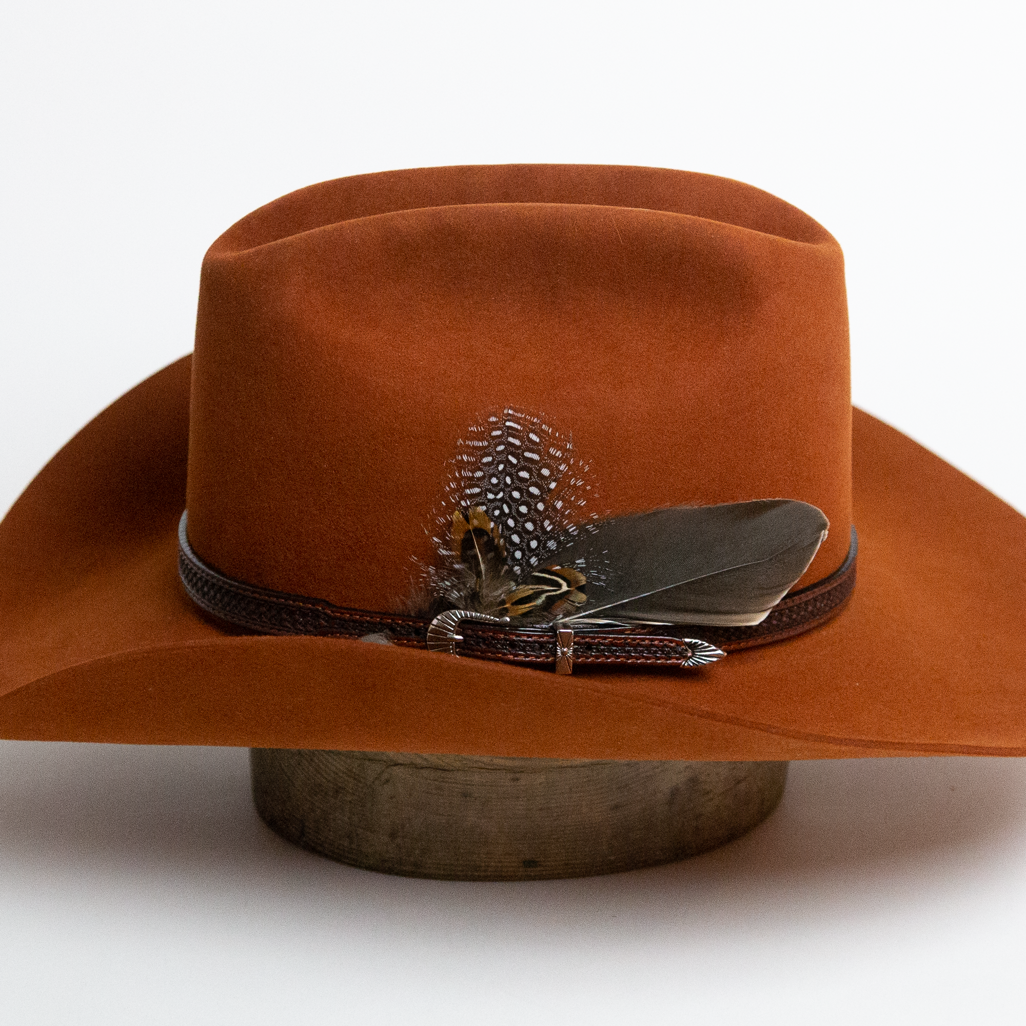 The styling on the Javalina Clay features a dark brown tonal carved leather with silver buckle band tucked with a goose, guinea and reeve feather bundle.