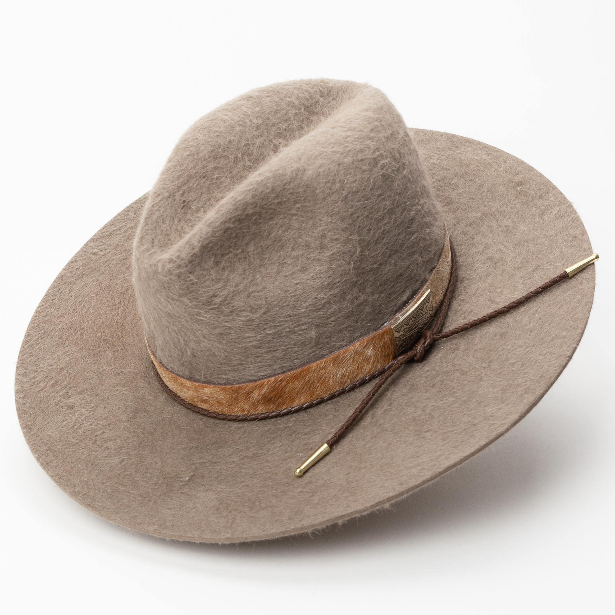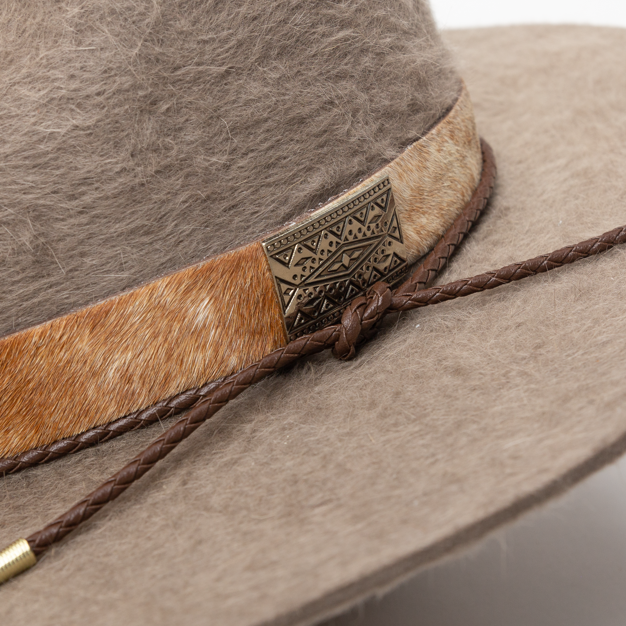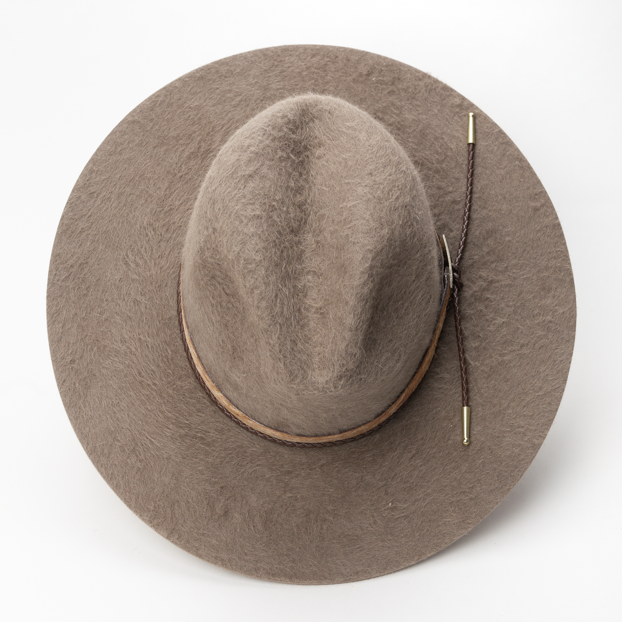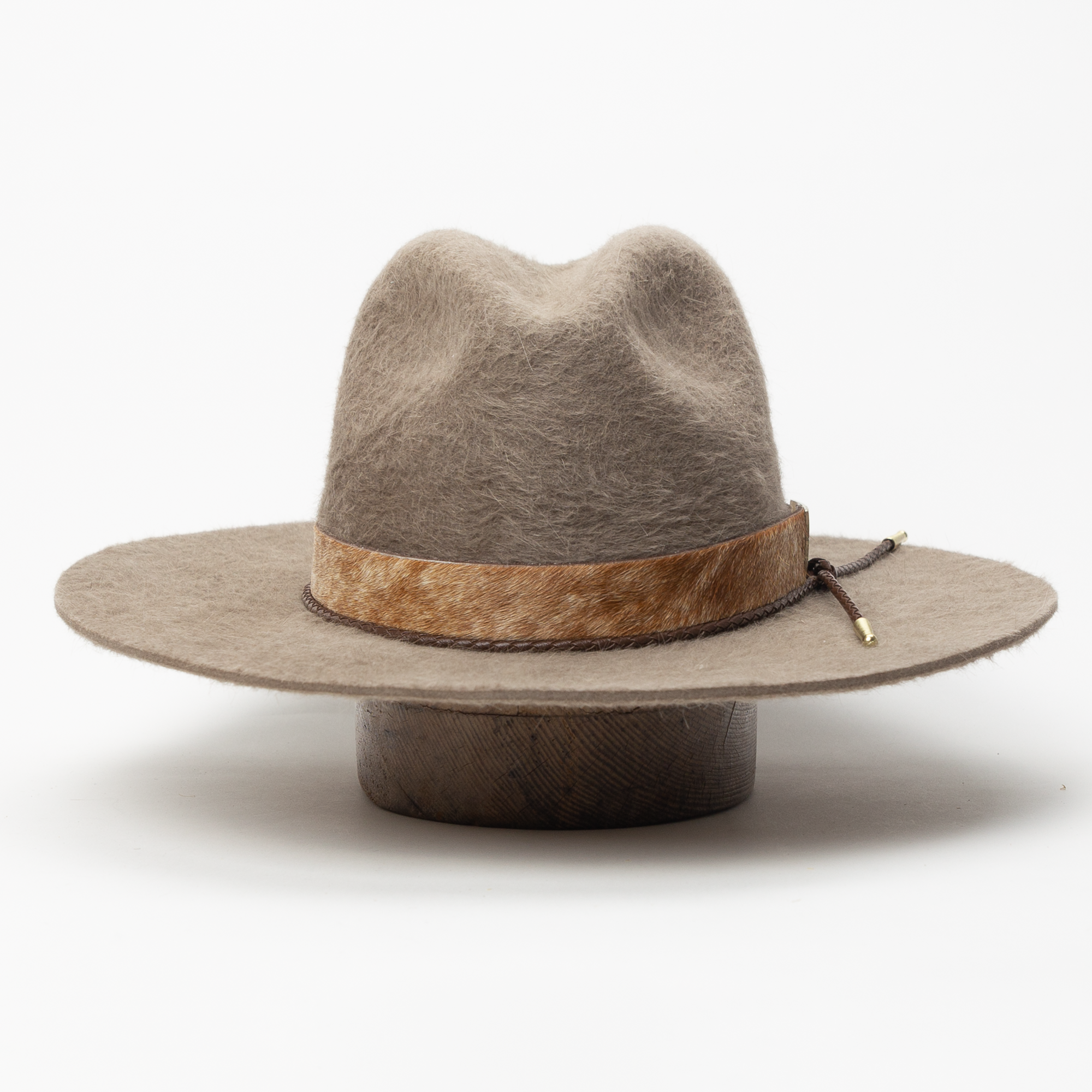 The styling on the Riverbed features a thick cowhide leather hat band with silver buckle and is grounded with a leather braided cord. Texture on texture. It speaks for itself.
