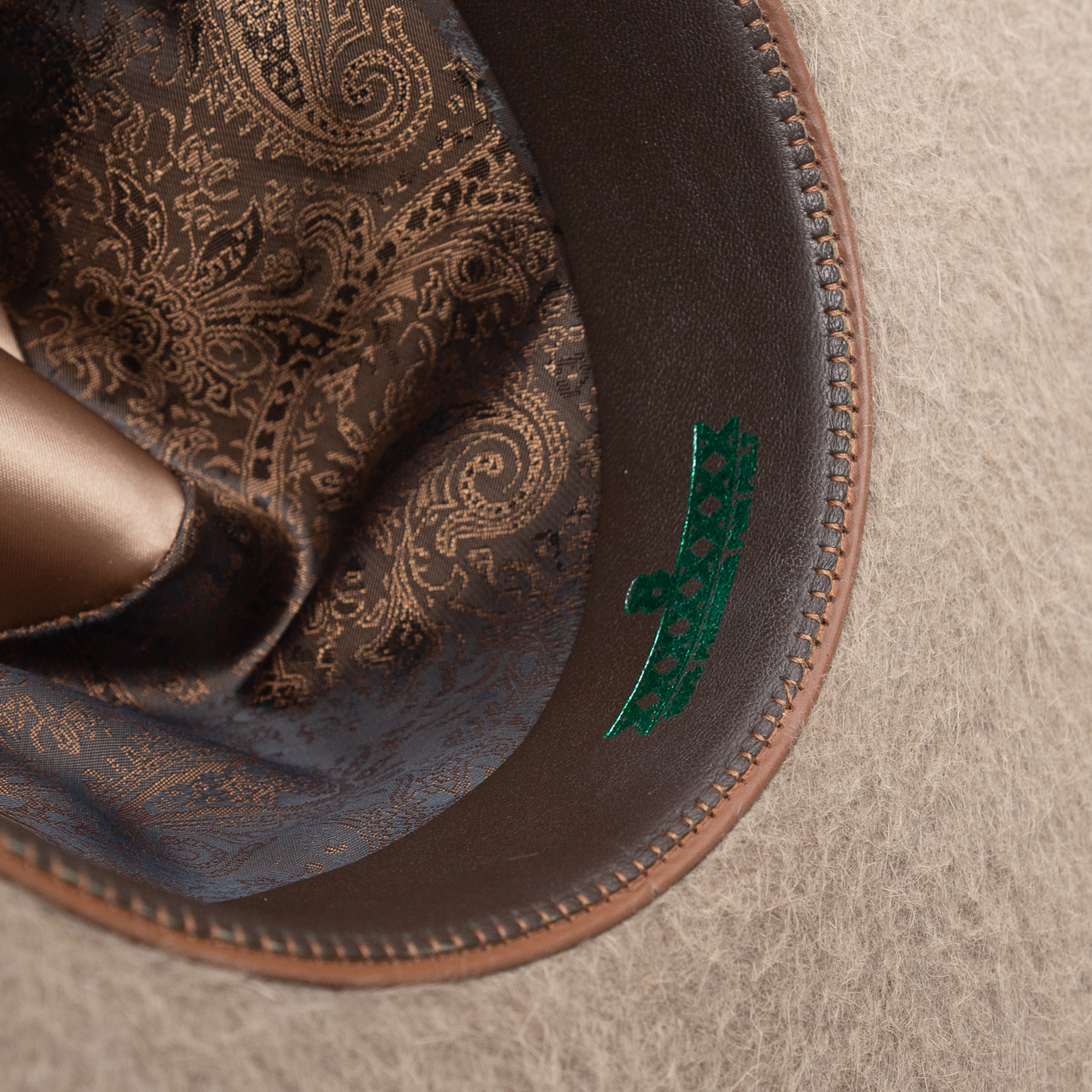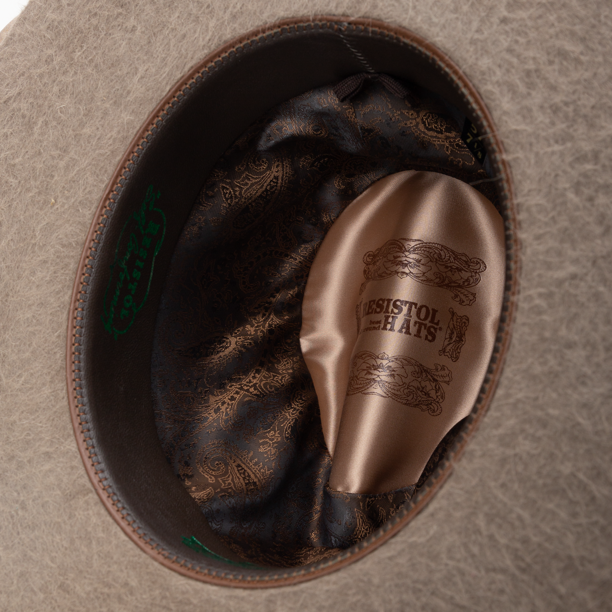 Inside the crown sits a brown satin liner featuring the Resistol crest. The sheepskin sweatband will naturally conform to the shape of your head over time.