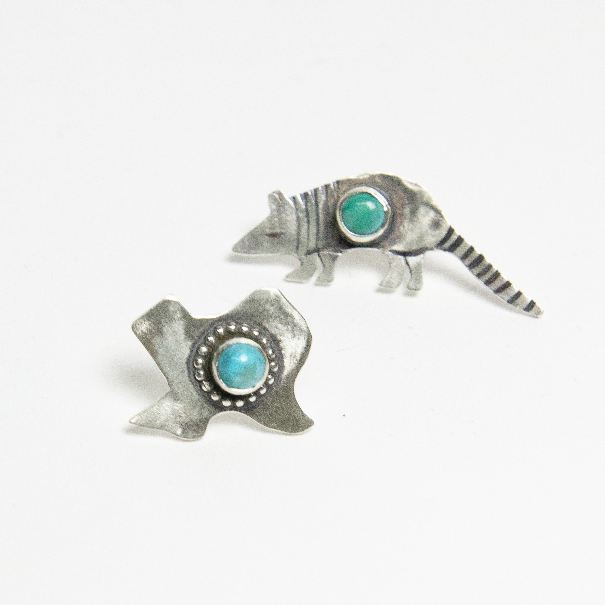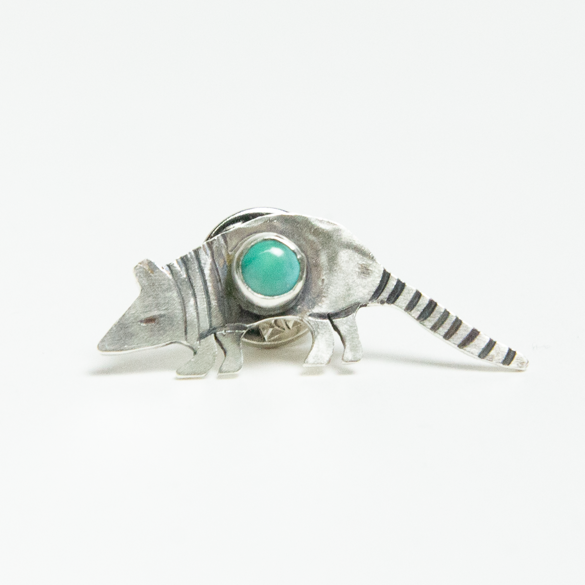 Sleeping Beauty Turquoise and Sterling Silver in the shape of one of the Texas state animals, an armadillo. Made by Station 19 exclusively for Maufrais.