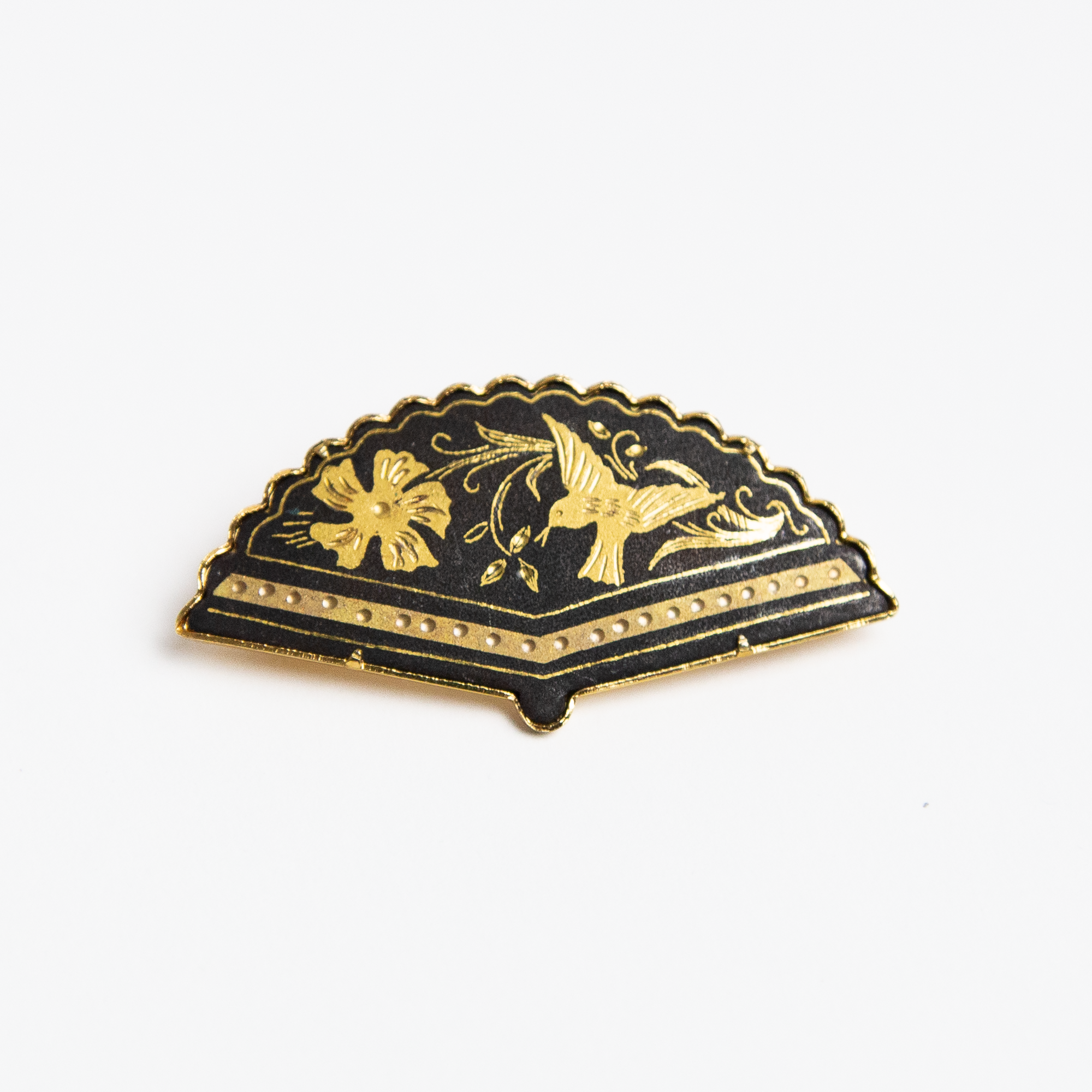 Vintage damascene pin with flowers and bird motifs. Brooch backing.