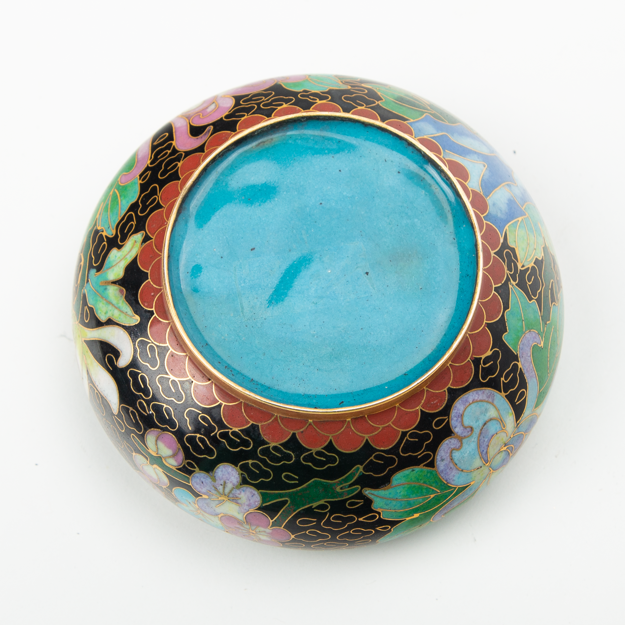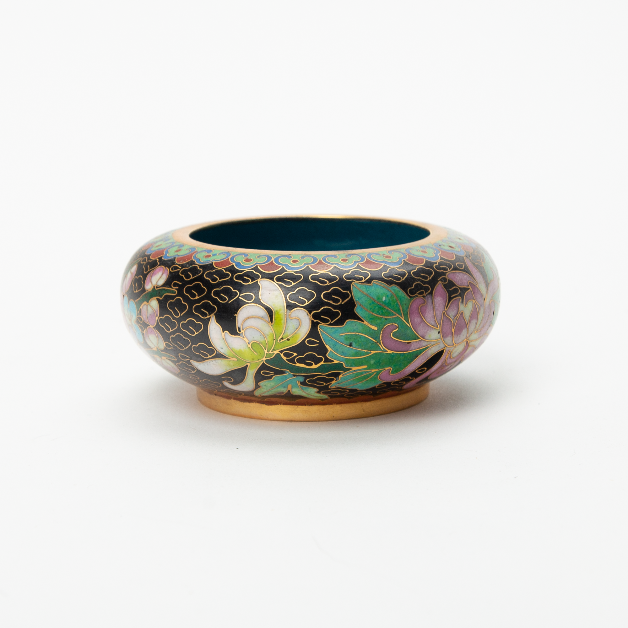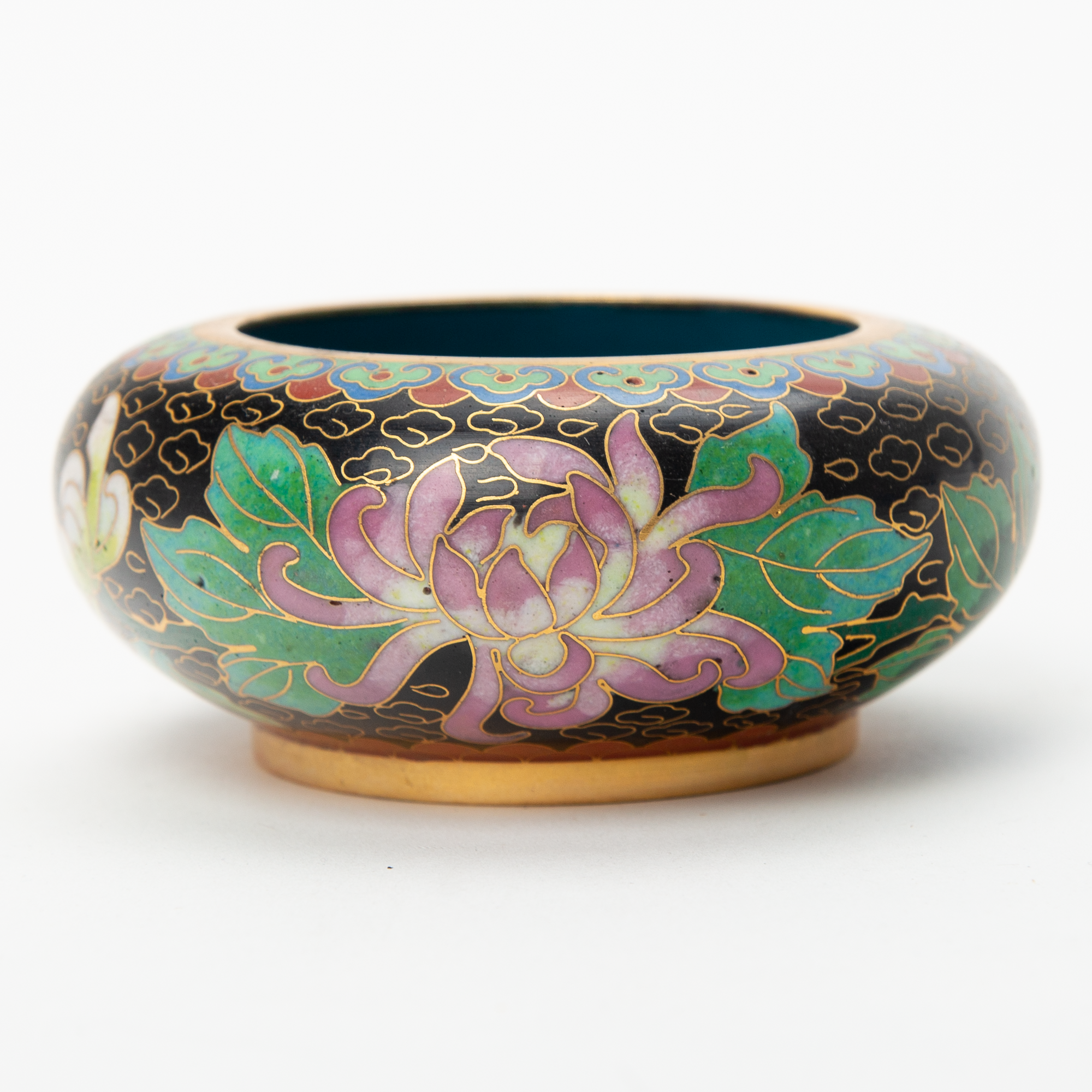 Small carved and painted floral bowl with teal base.