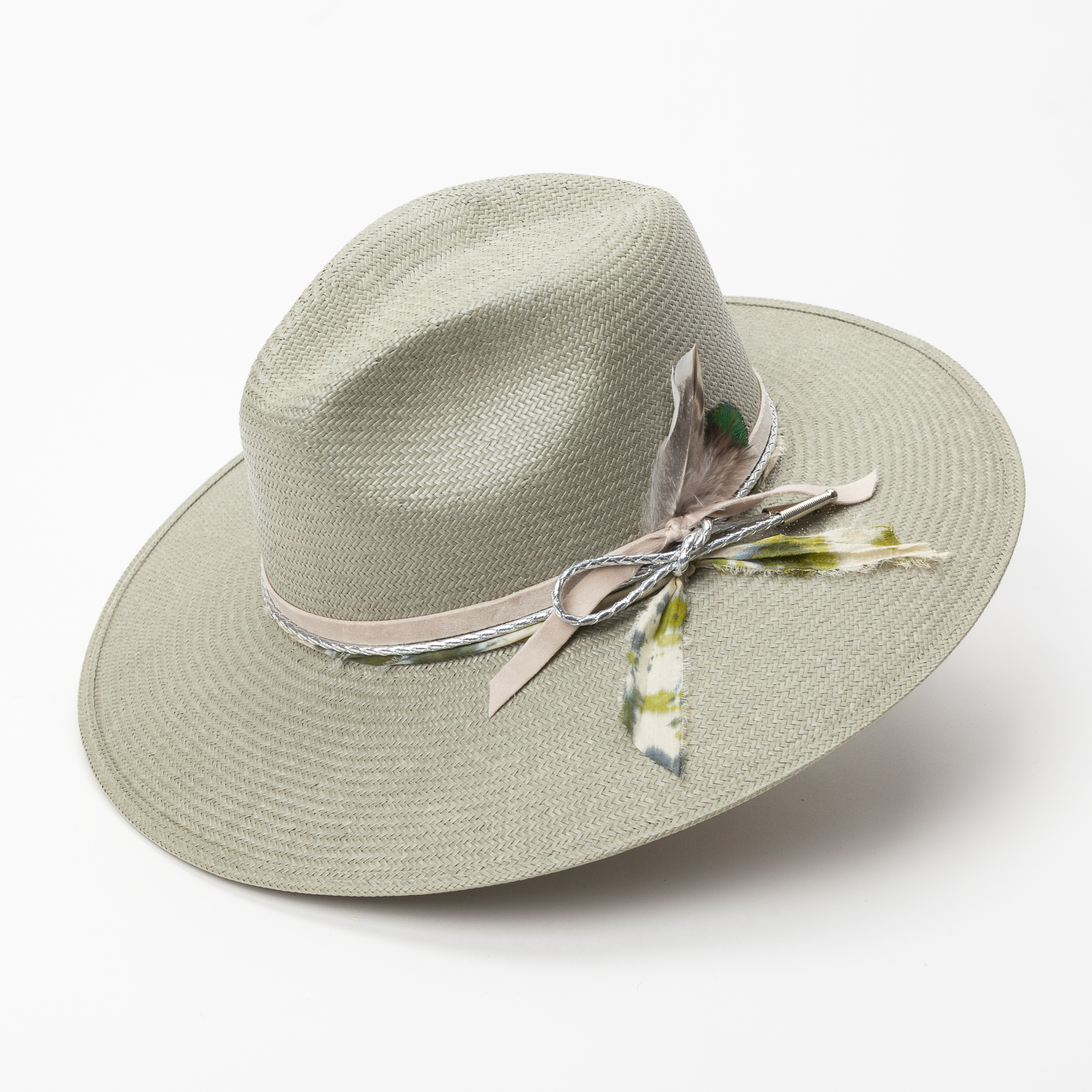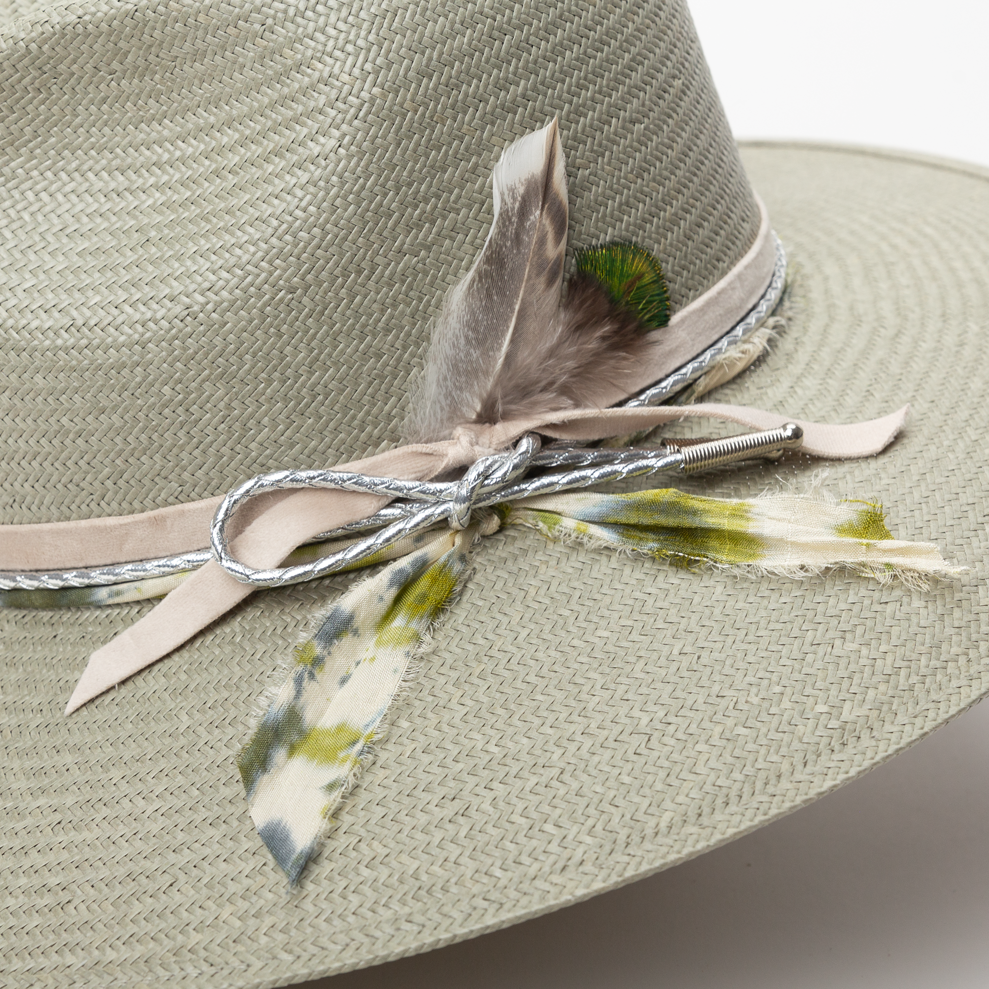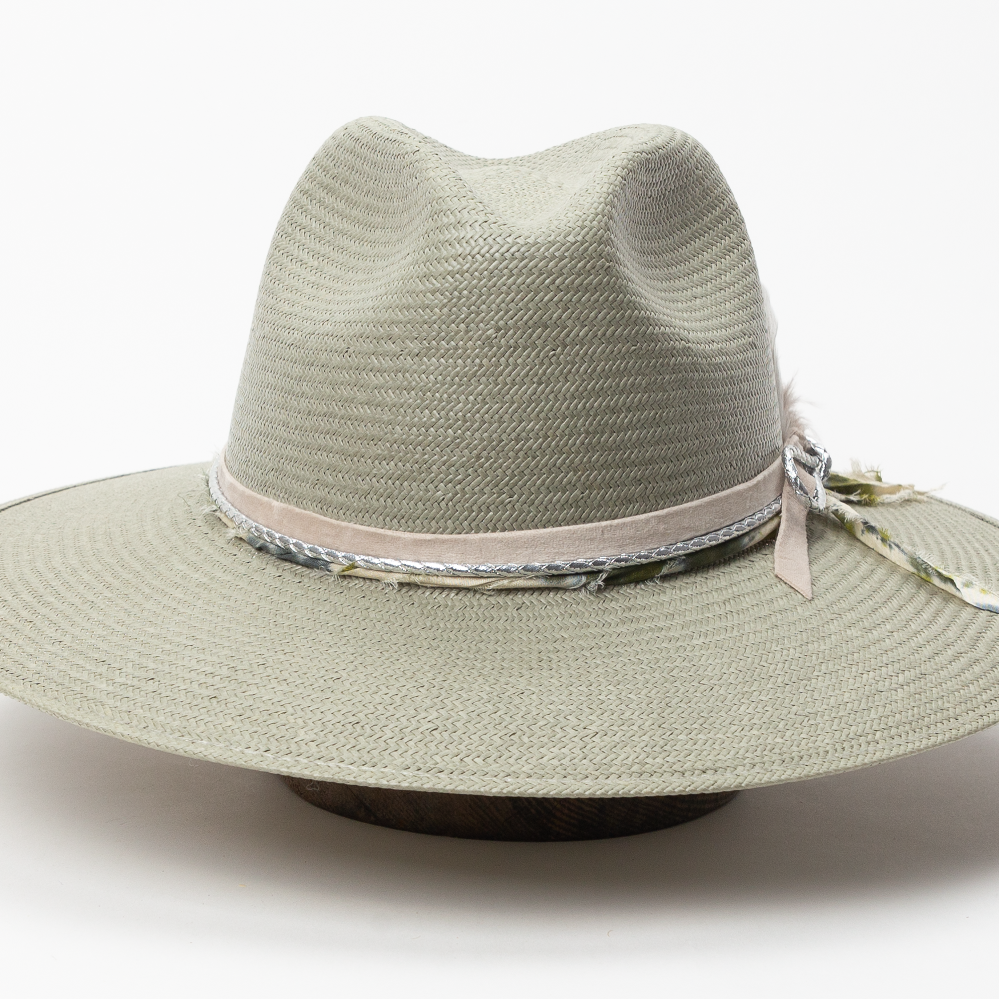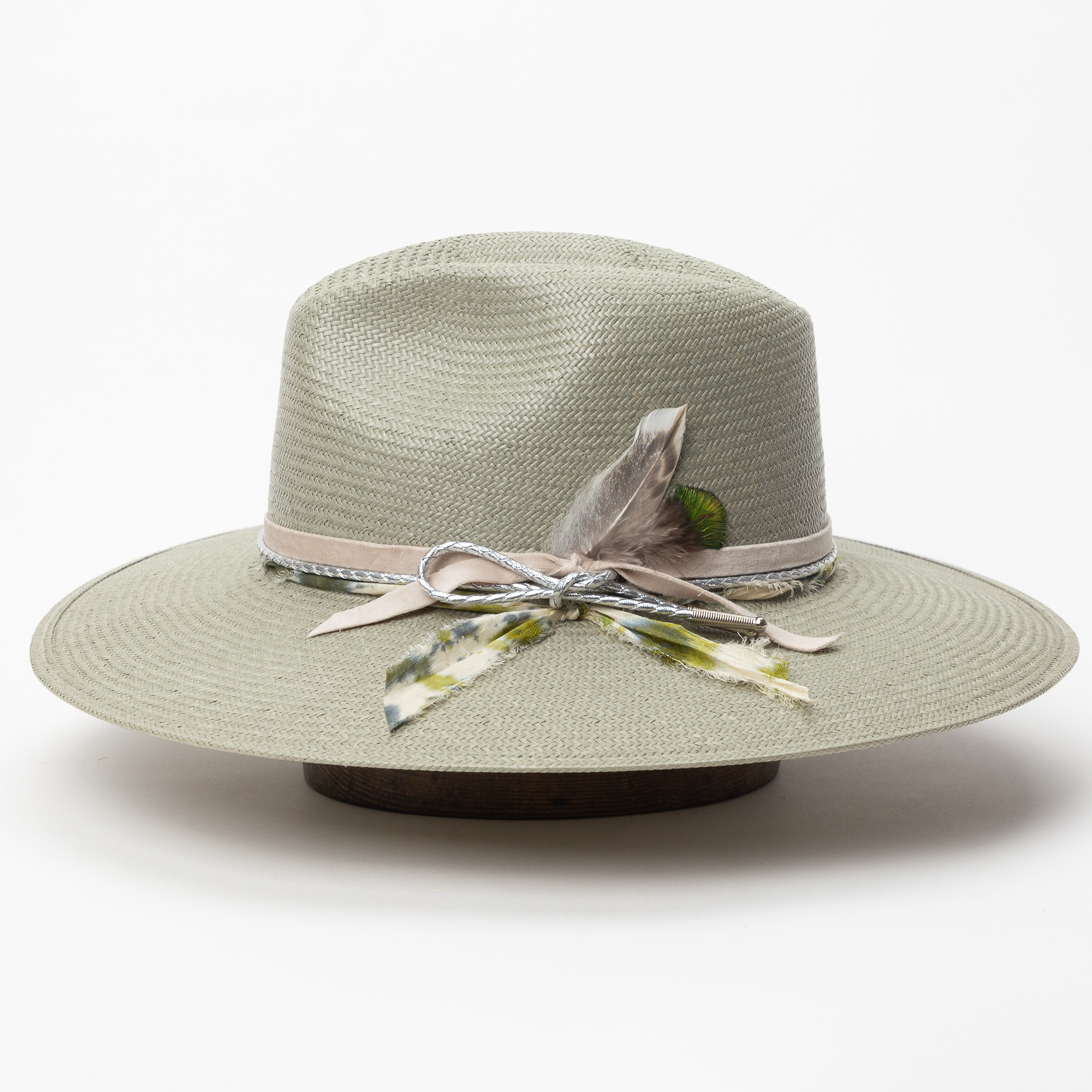 Inspired by the blooms after it rains here in Texas, the Rainlily hat is styled with a velvet ribbon, metallic leather cord, twisted silk, finished with a duck feather and peacock feather combo.