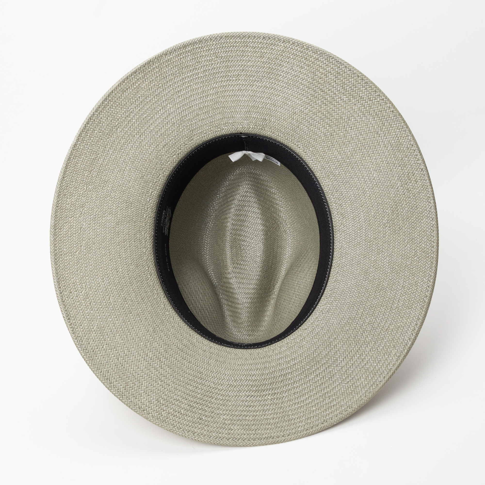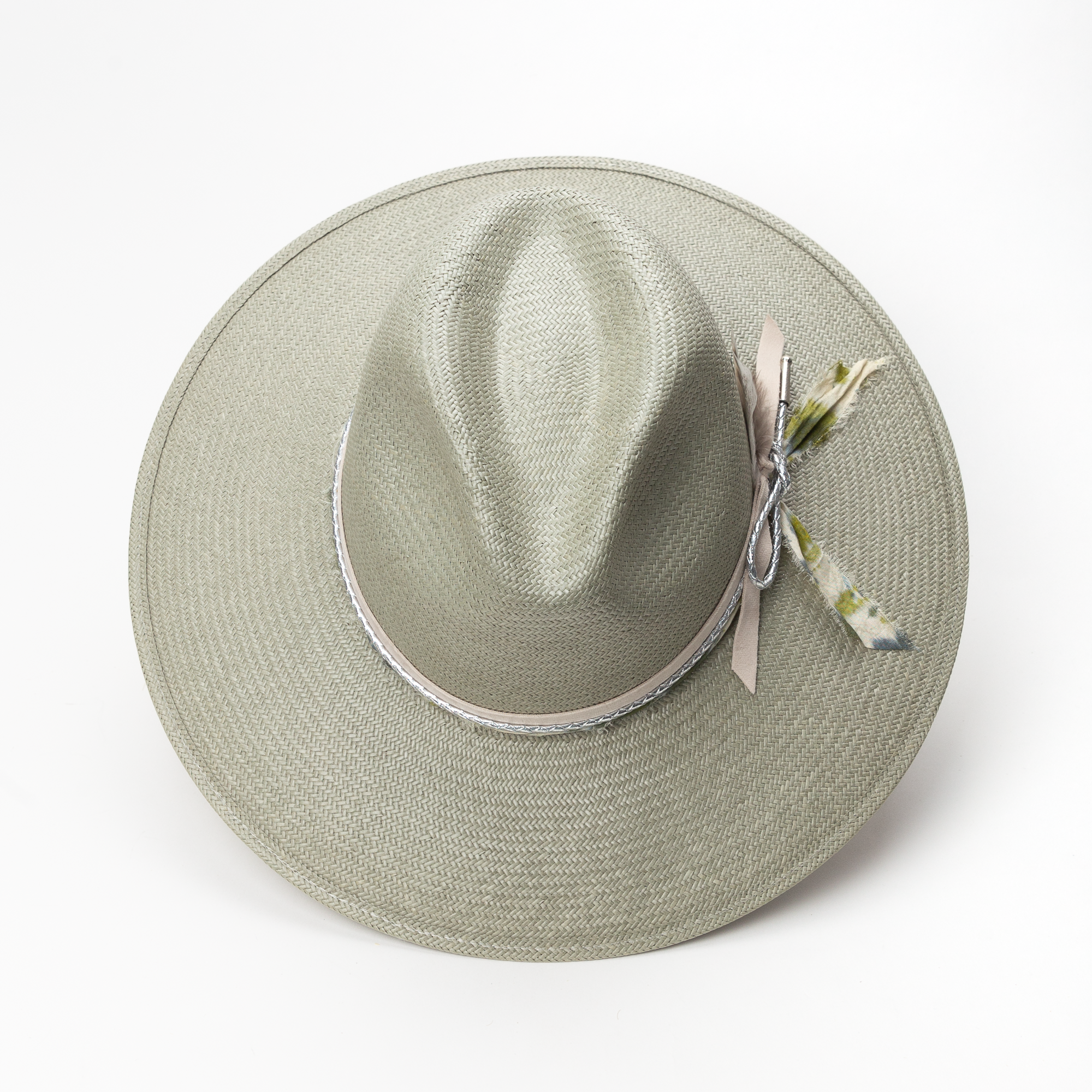 The Rainlily hat is a green-blue tone shantung straw hat in a pinch-front crown style and wide bowed brim. The unlined interior features a Dri-Lex sweatband for added comfort.