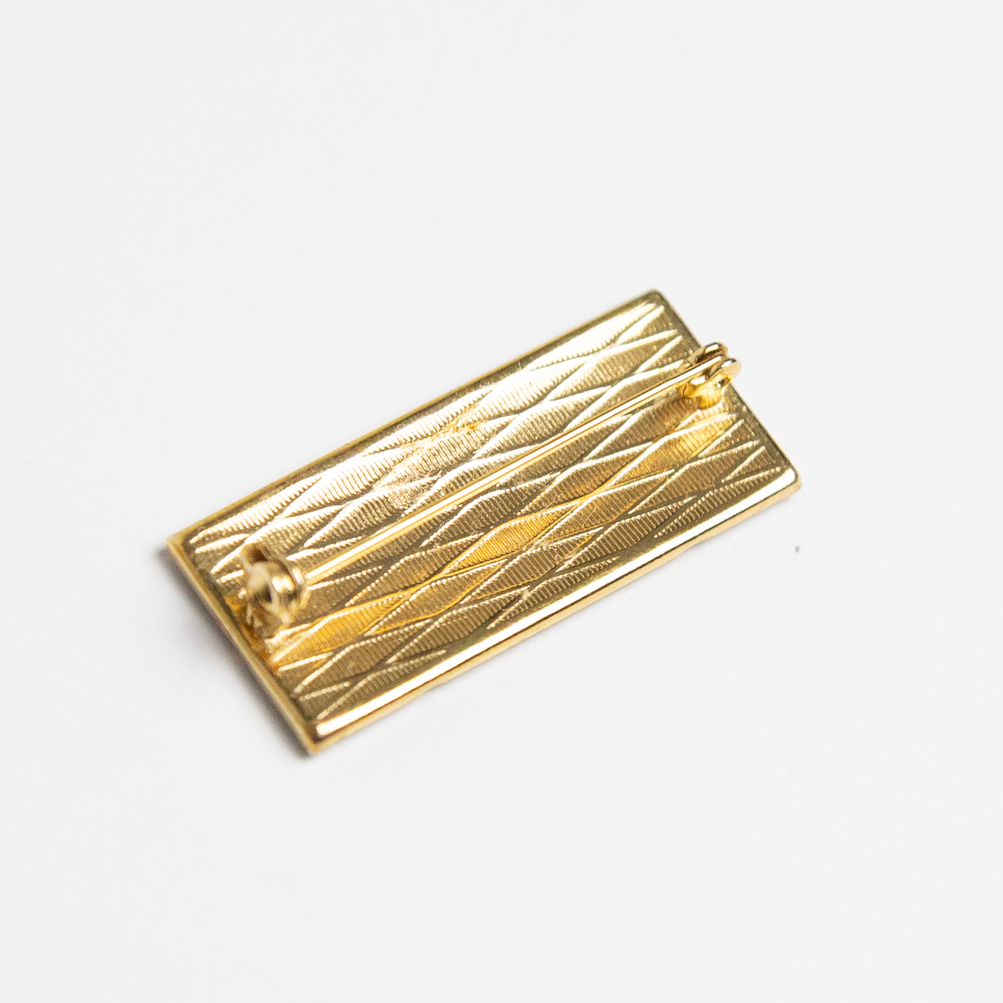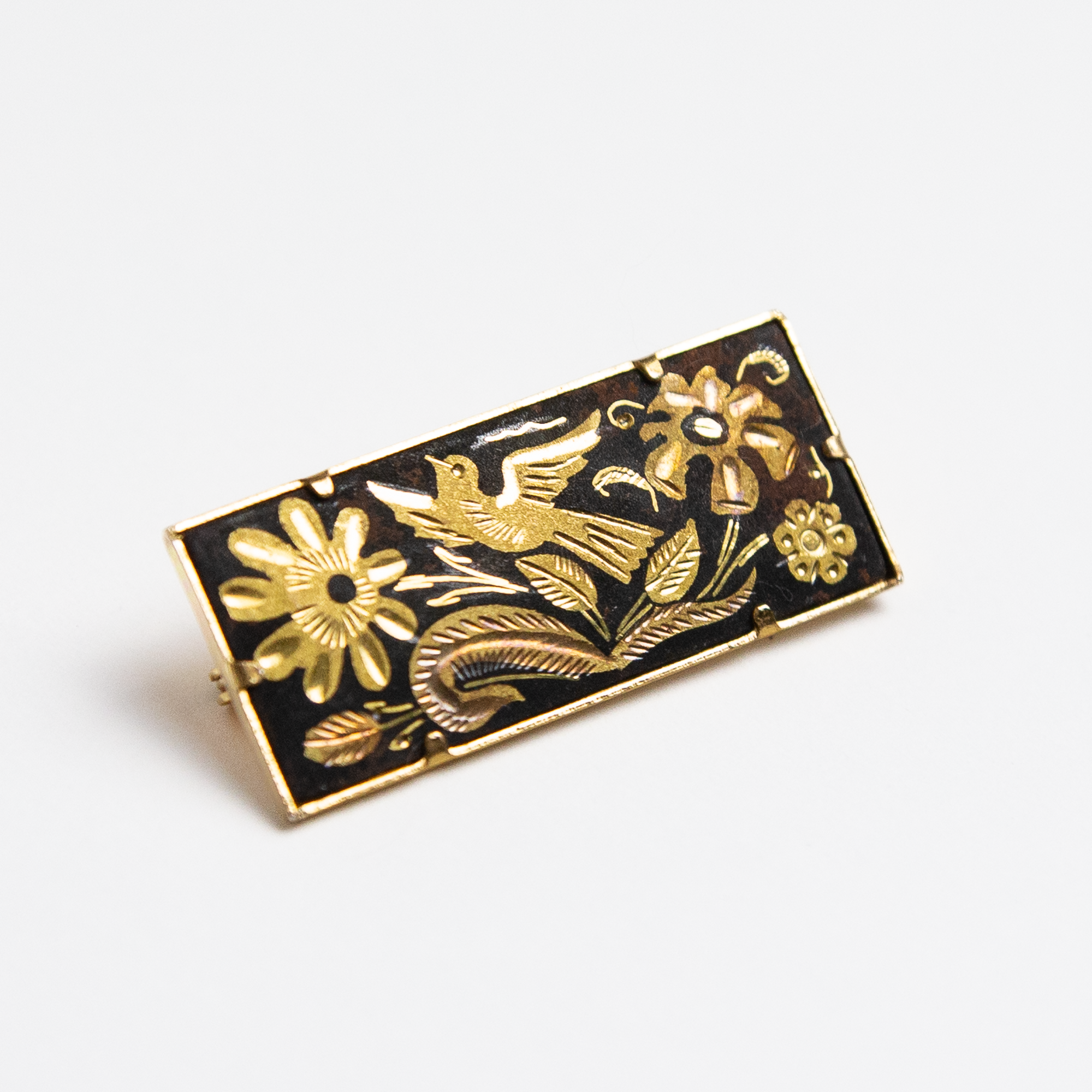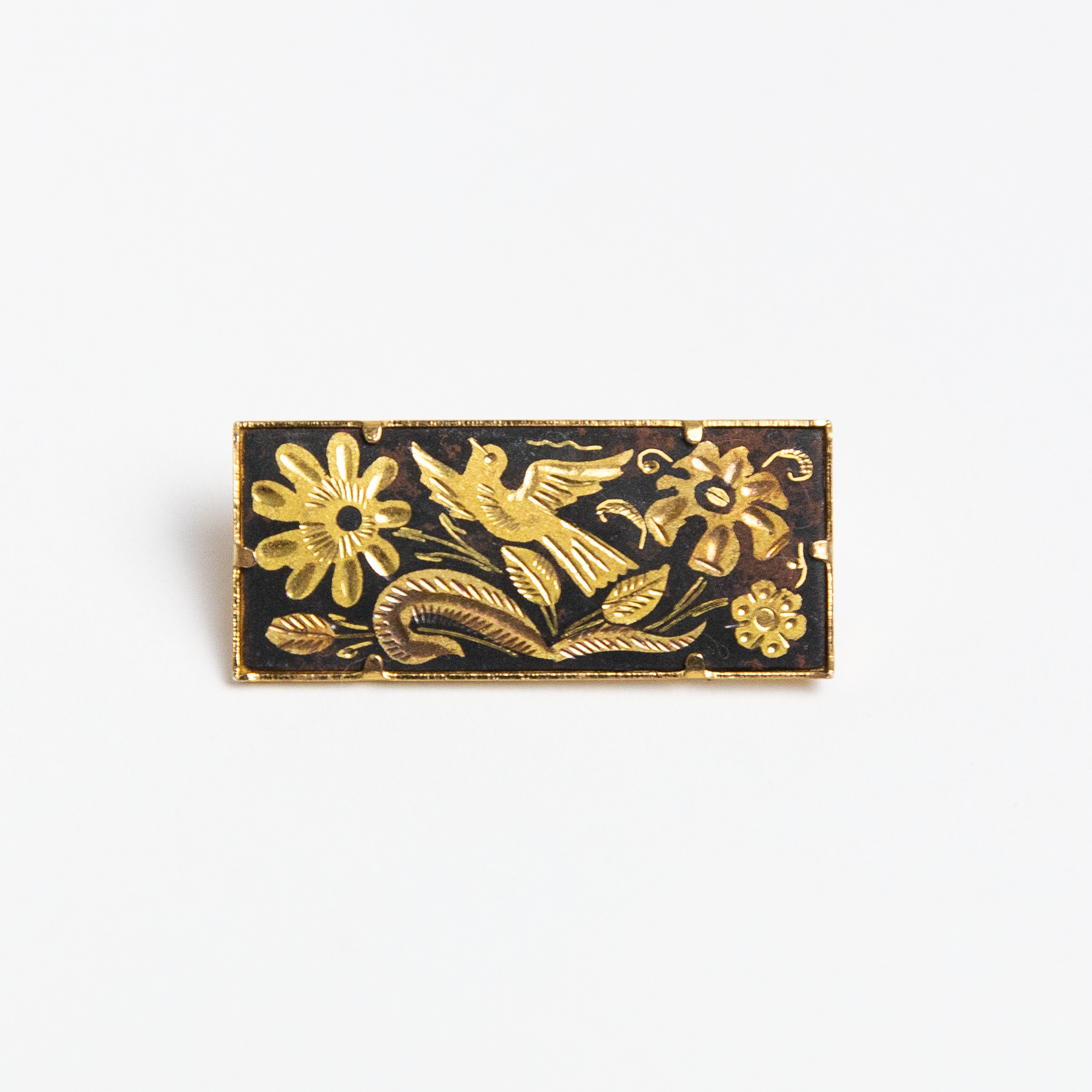Vintage damascene pin with flowers and bird motifs. Brooch backing.