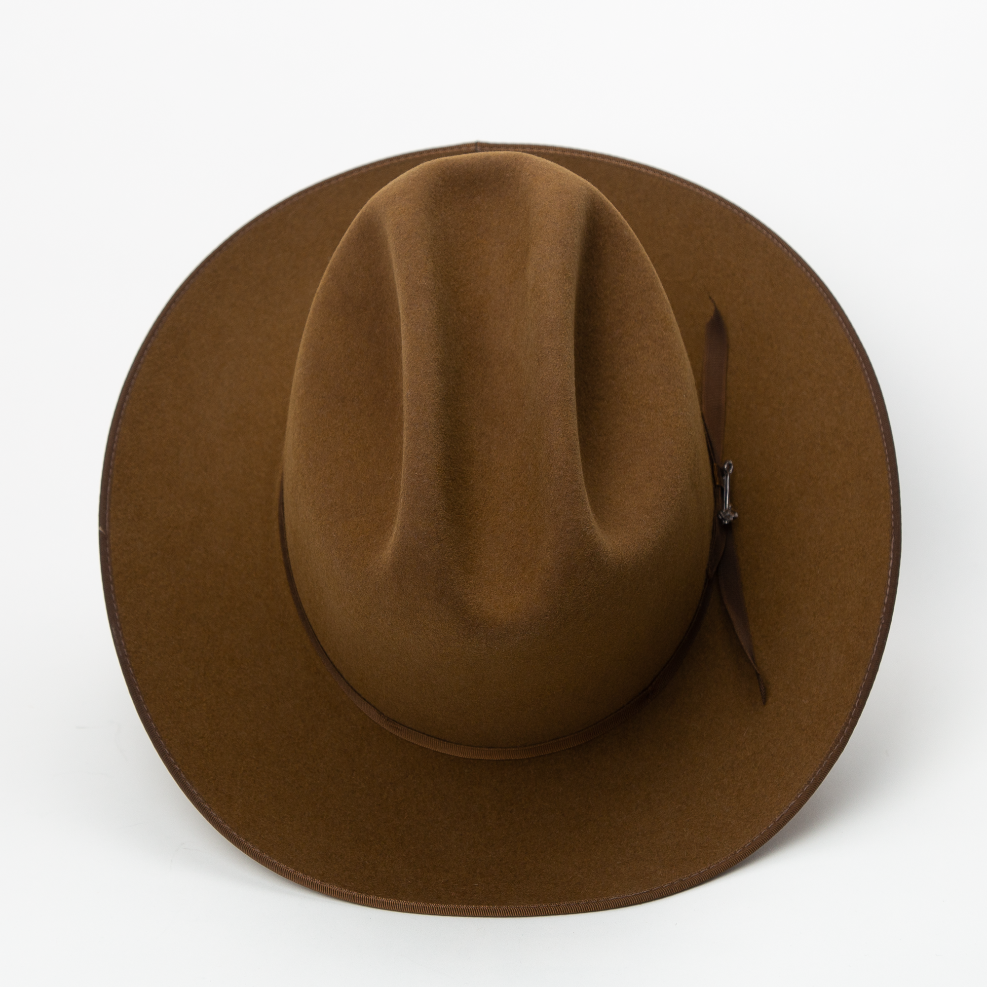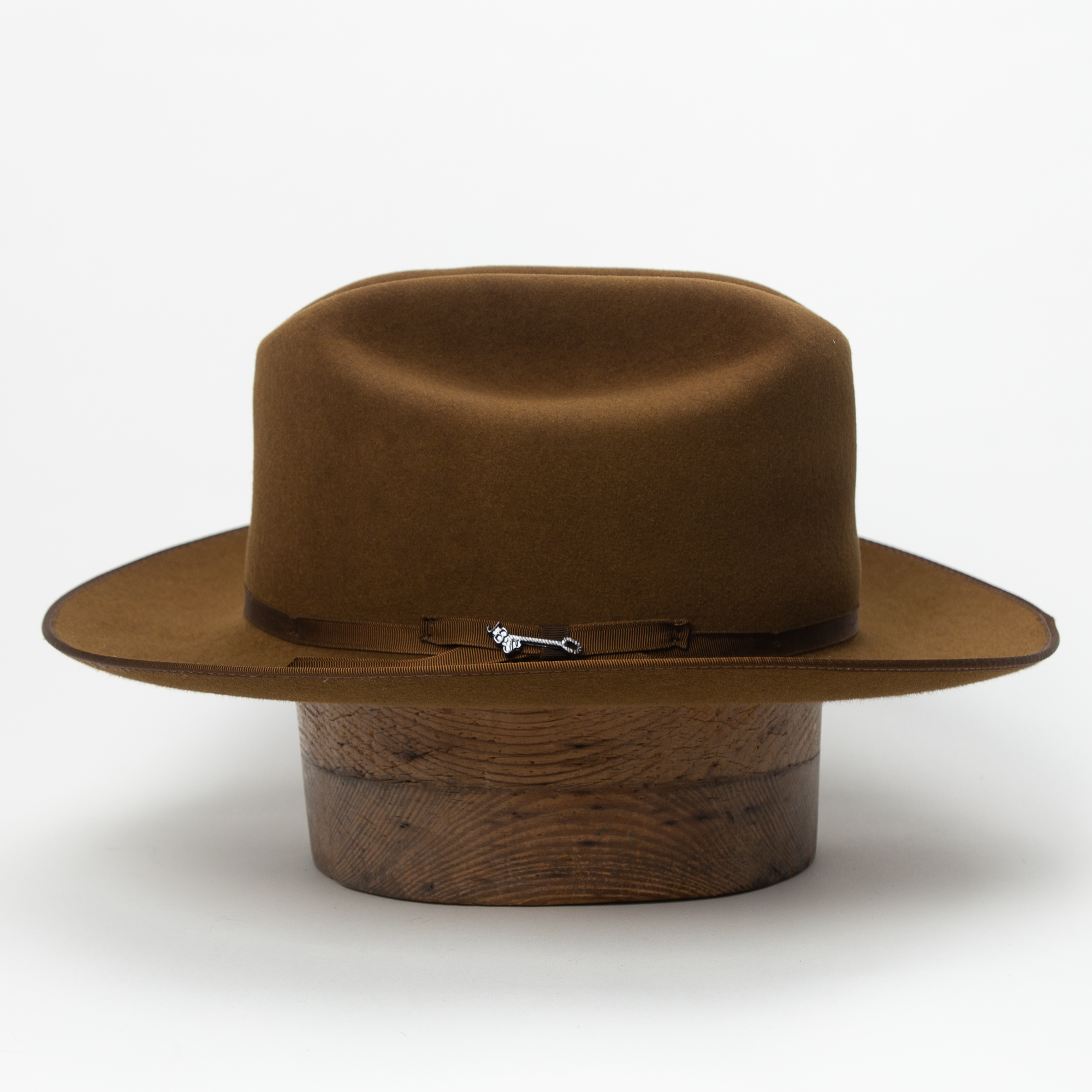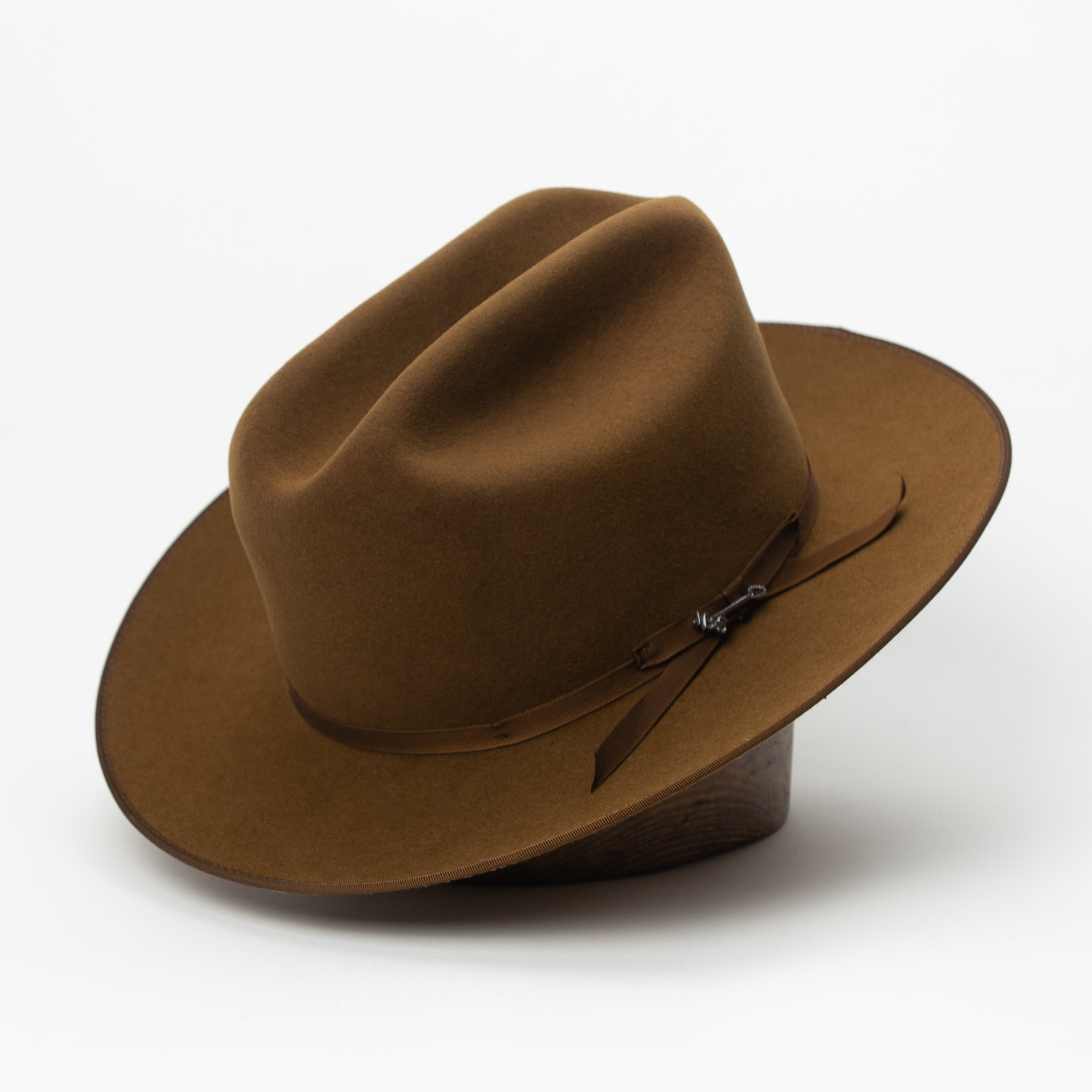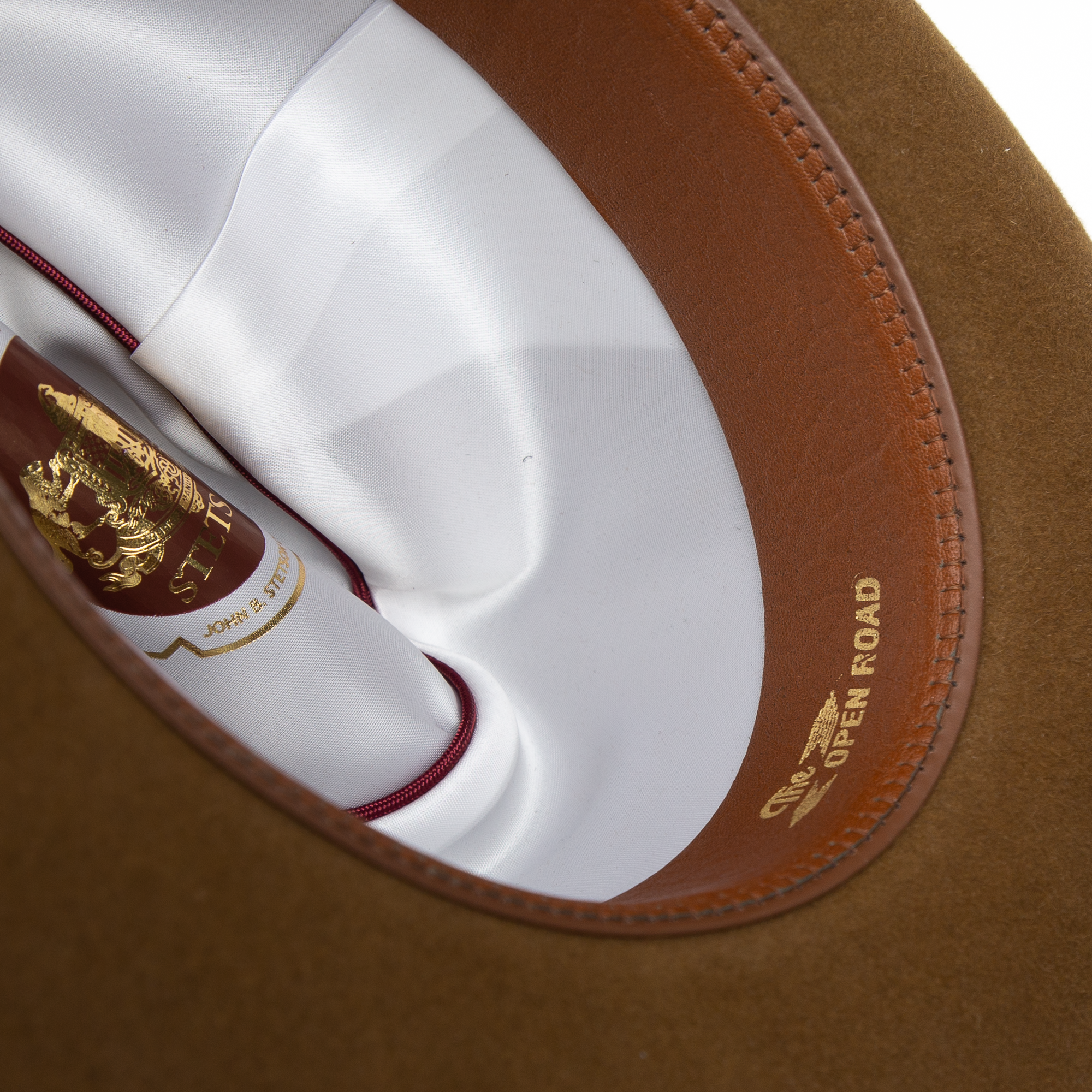The legendary Open Road Royal Deluxe Hat is constructed of high quality dress weight felt. Structured with a signature cattleman crown, matching slim grosgrain hat band, bound edge brim, interior roan leather sweatband and Stetson branded satin lining.