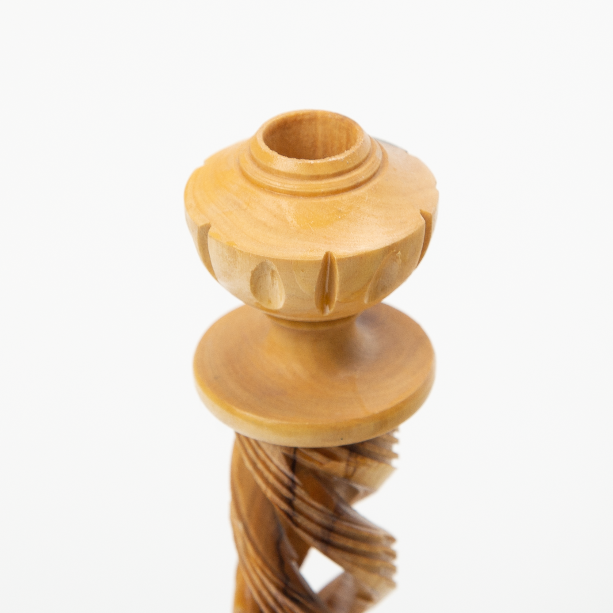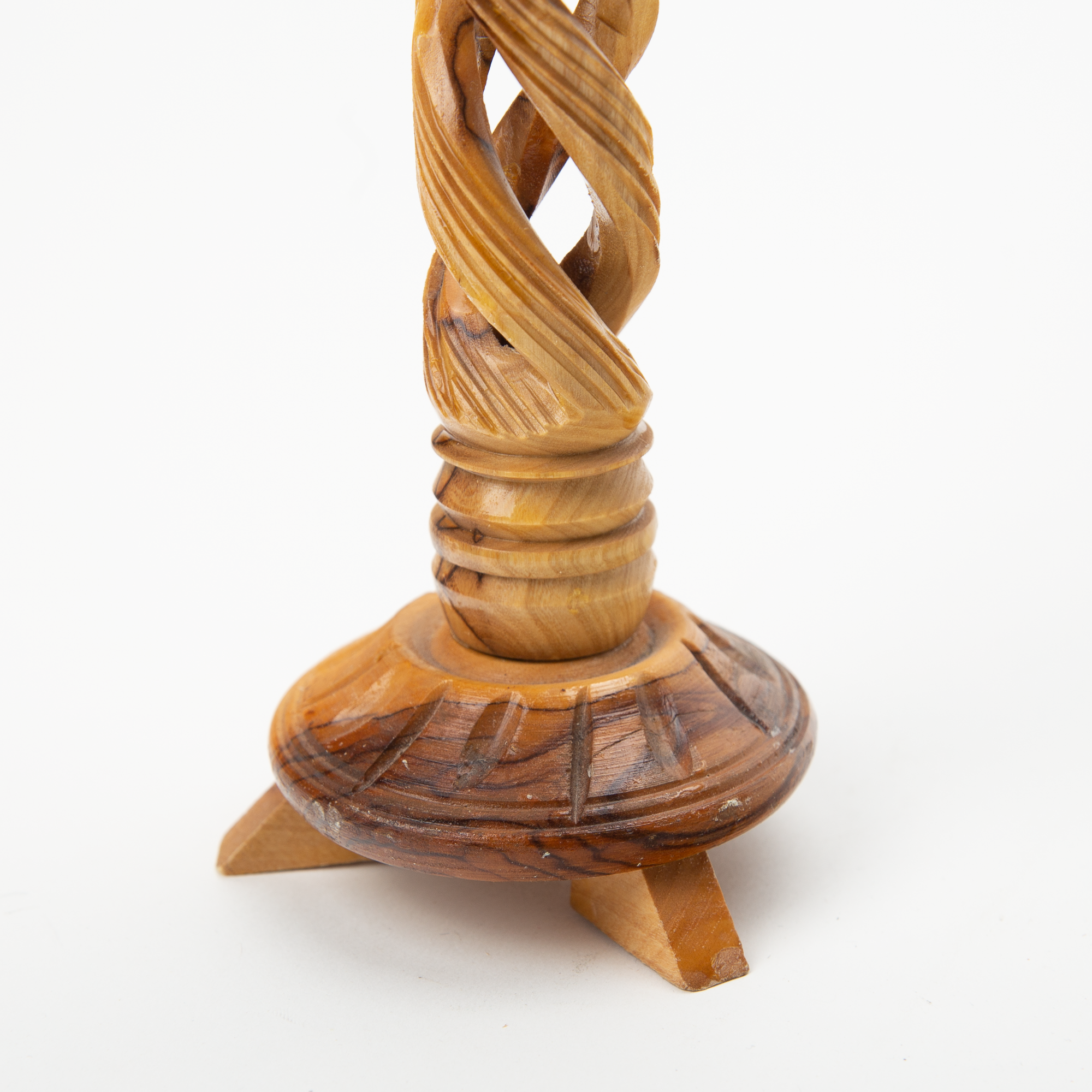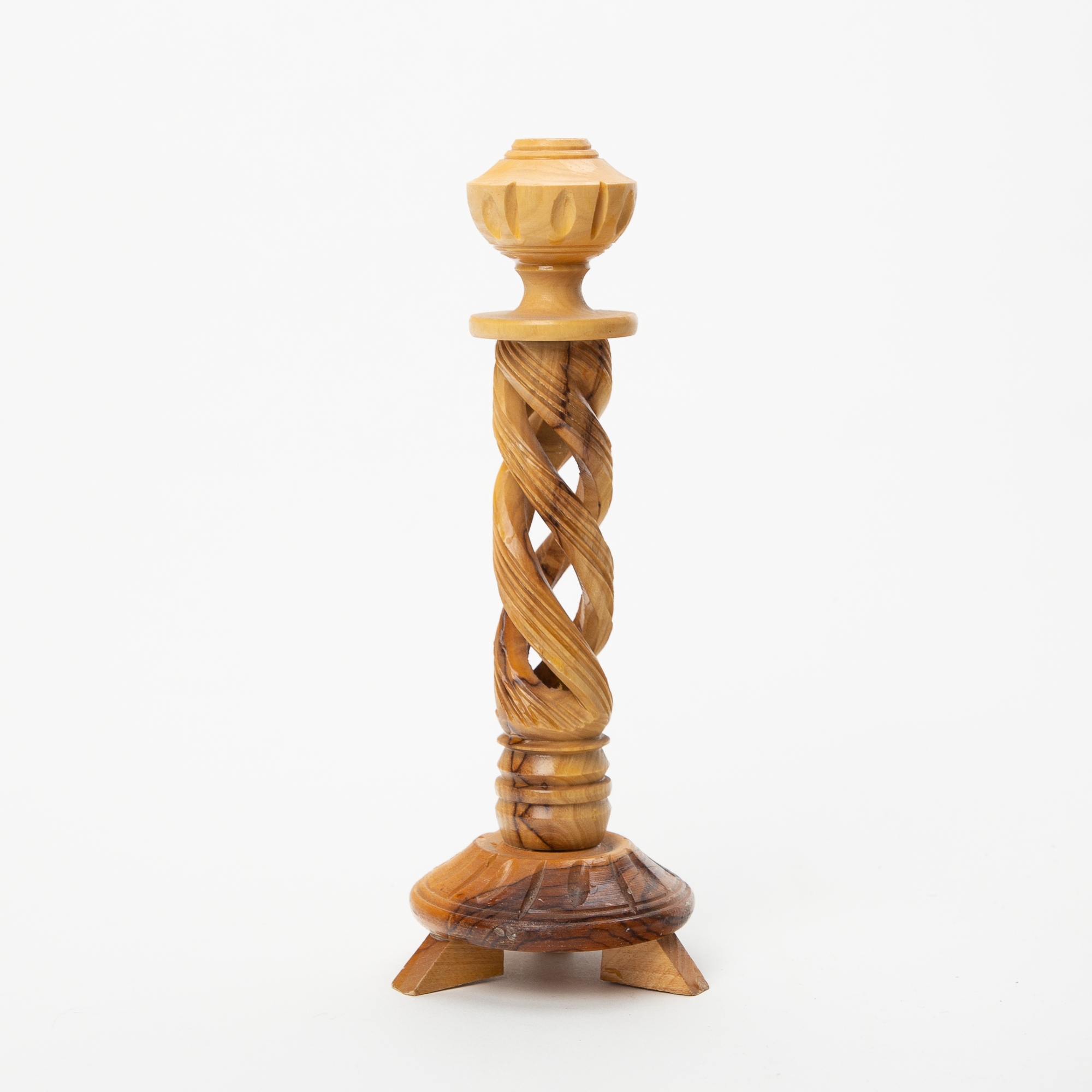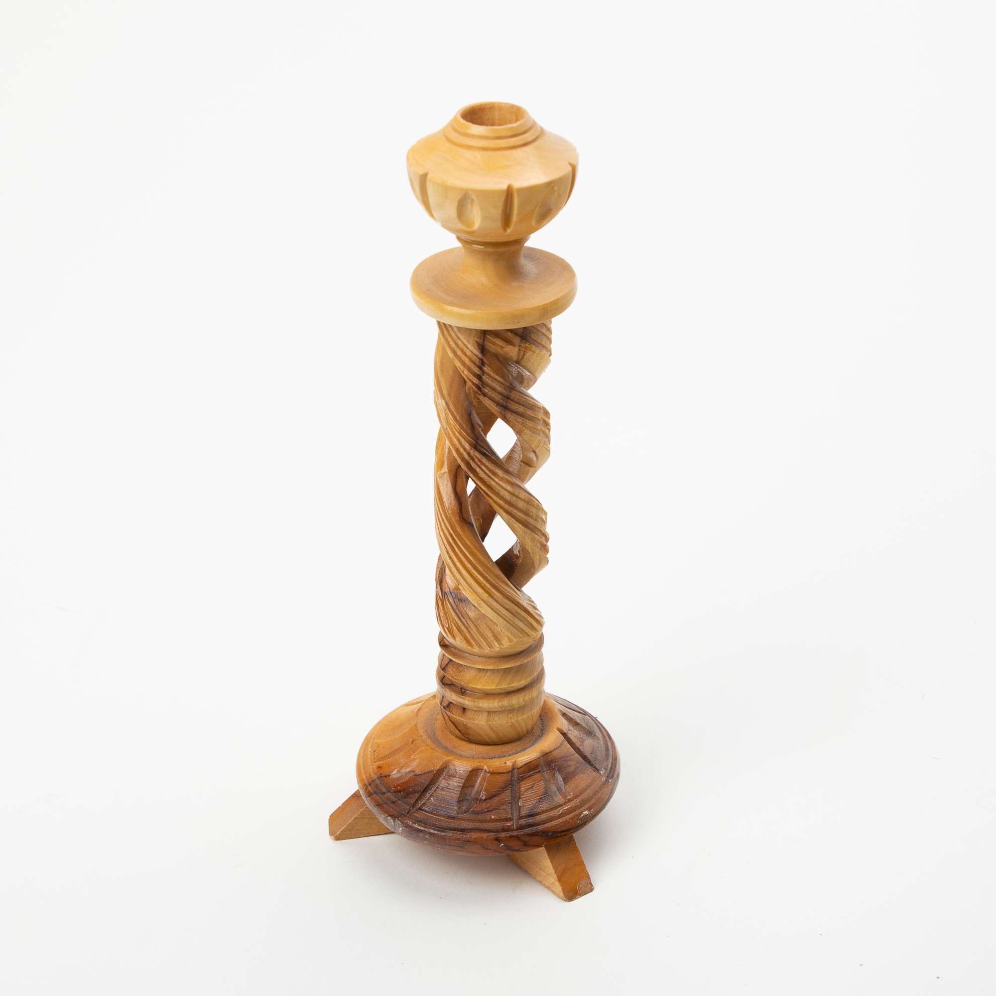 Hand carved olive wood candle stick with three legs for base. Holds .375" (3/8") candles