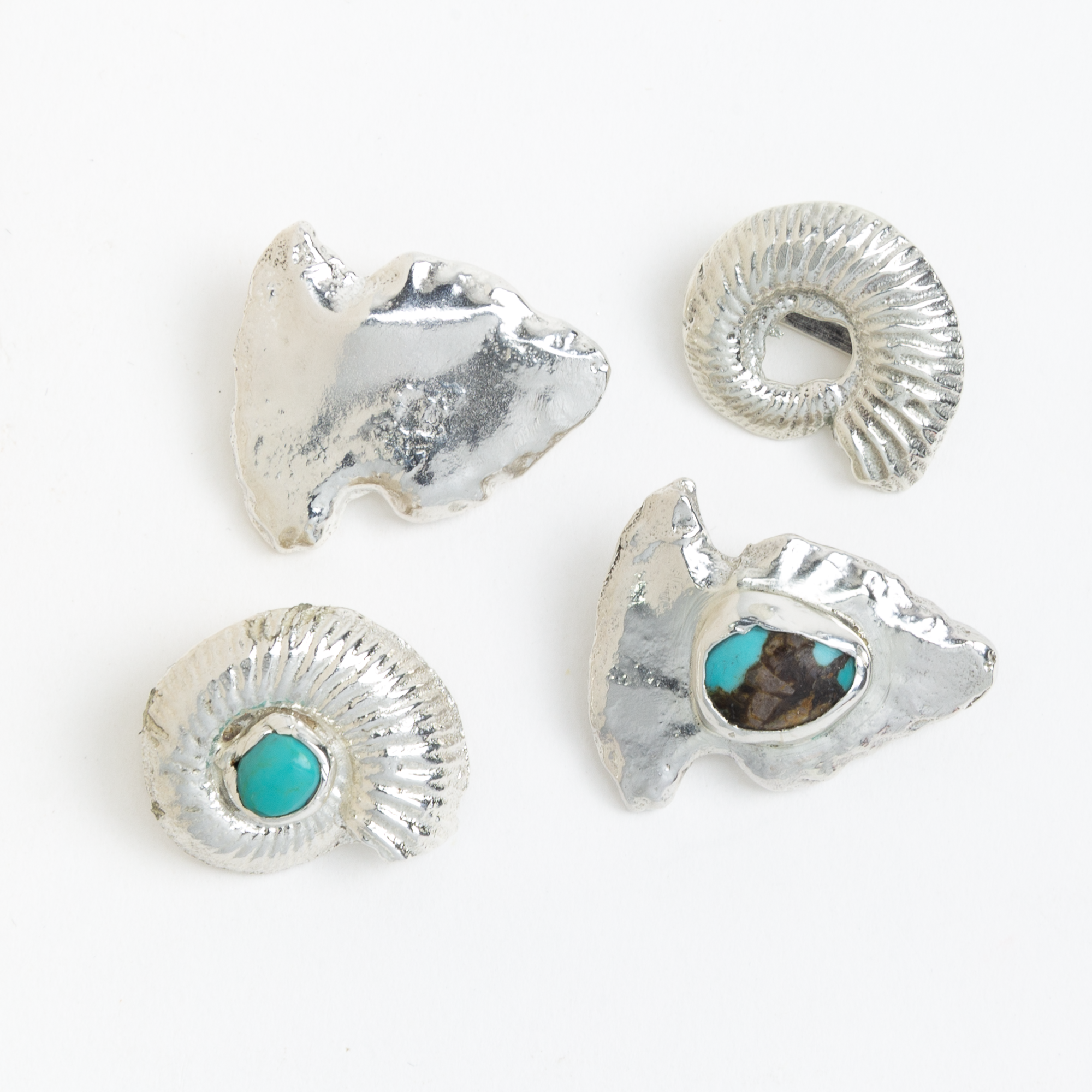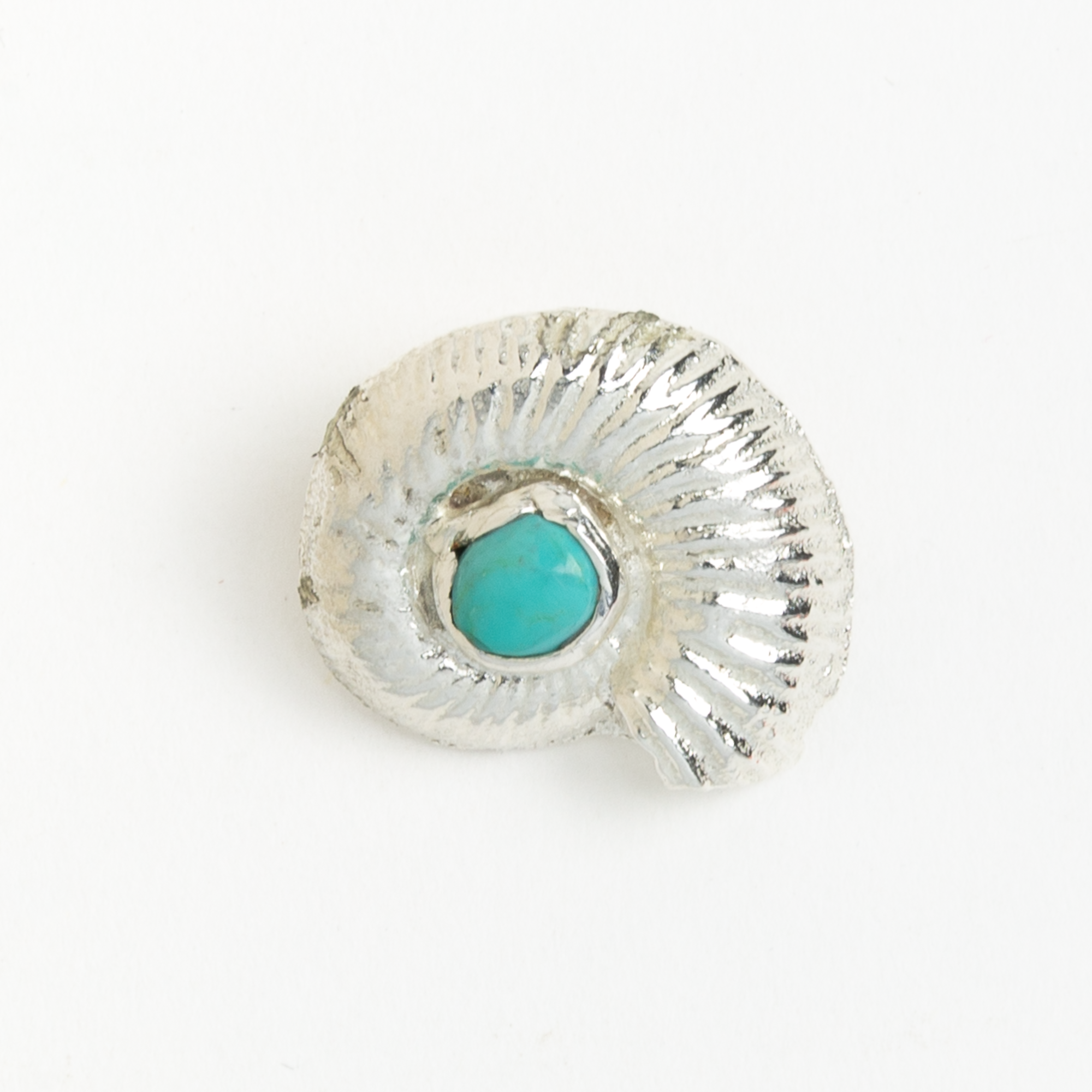 Handmade, sand-cast Ammonite with turquoise. Add an extra embellishment to your already existing hat band. Simply weave through the ribbon, leather, or any material band you have on your hat. Slide in place.
