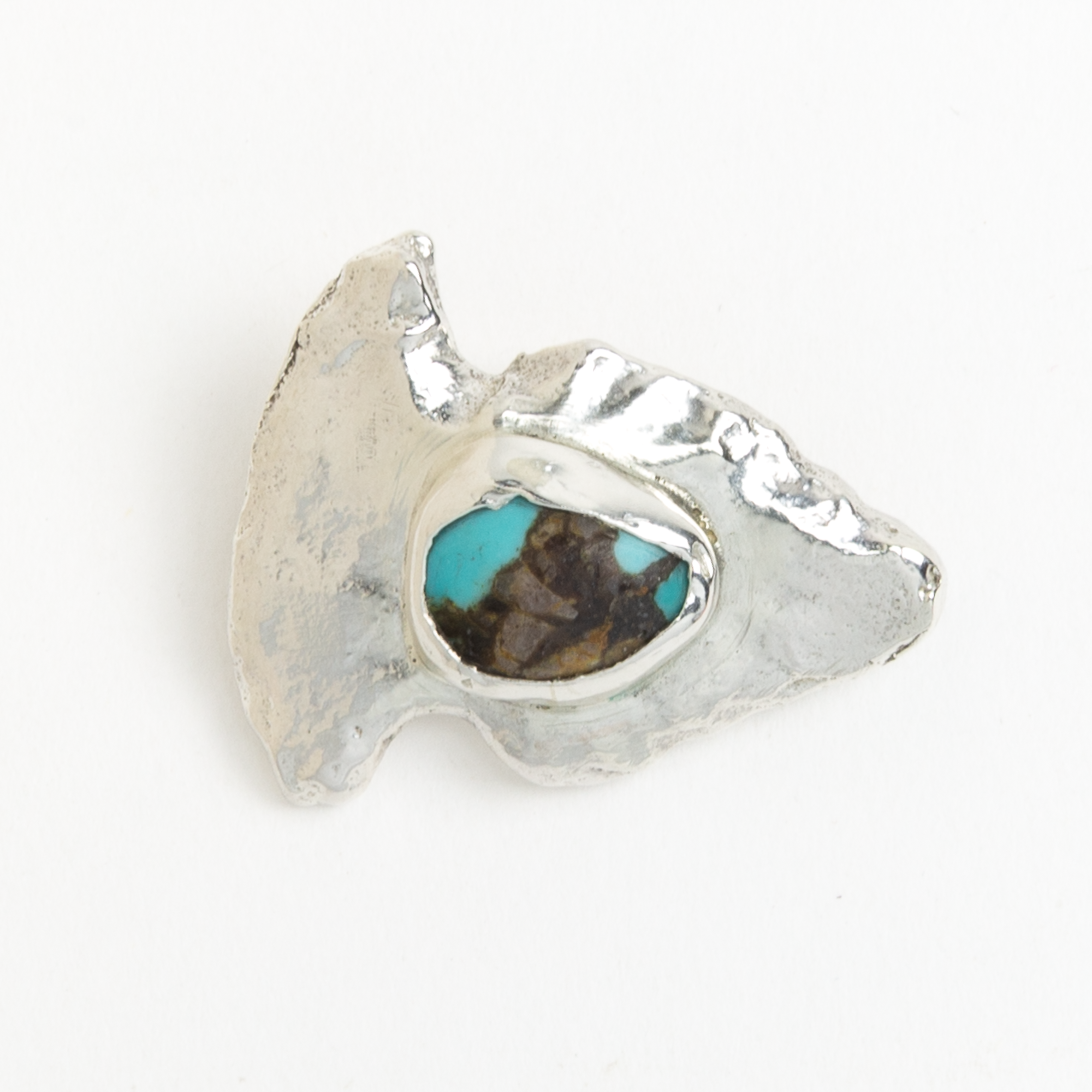 Handmade, sand-cast Arrowhead with turquoise. Add an extra embellishment to your already existing hat band. Simply weave through the ribbon, leather, or any material band you have on your hat. Slide in place.