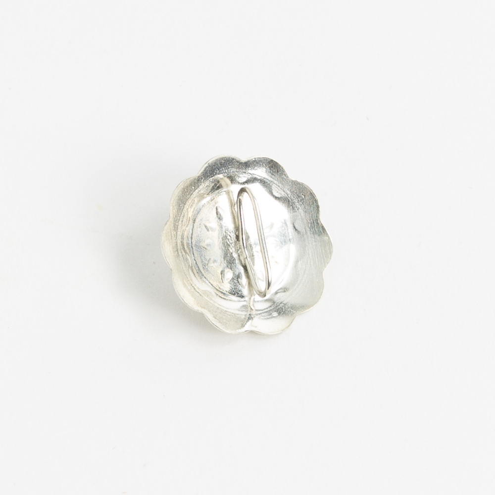 Stunning sterling silver flower concho by our friend Melissa at Rolling Stone Trading Co. This concho features a piece of Kingman Turquoise at its center. Thread any ribbon or leather tie through the loop on the back of the concho.