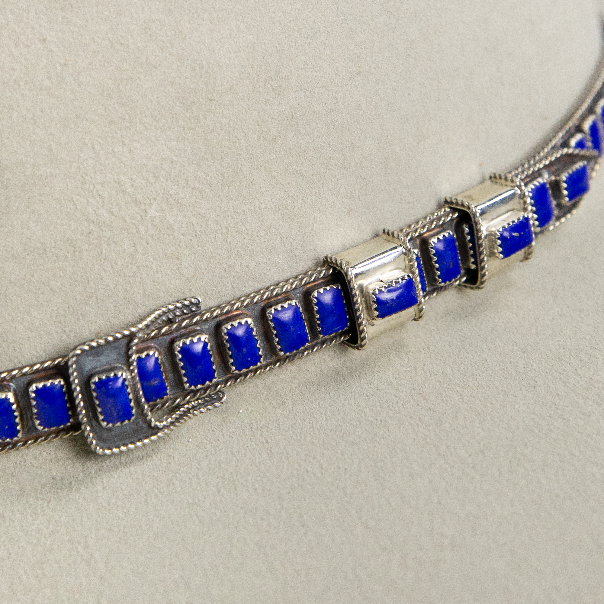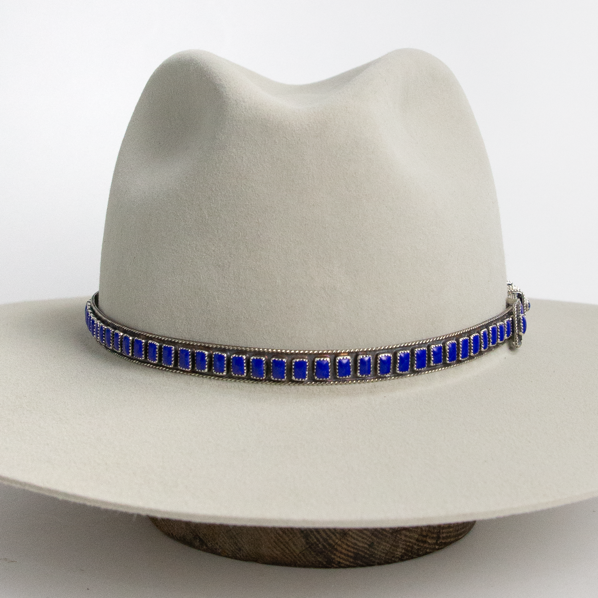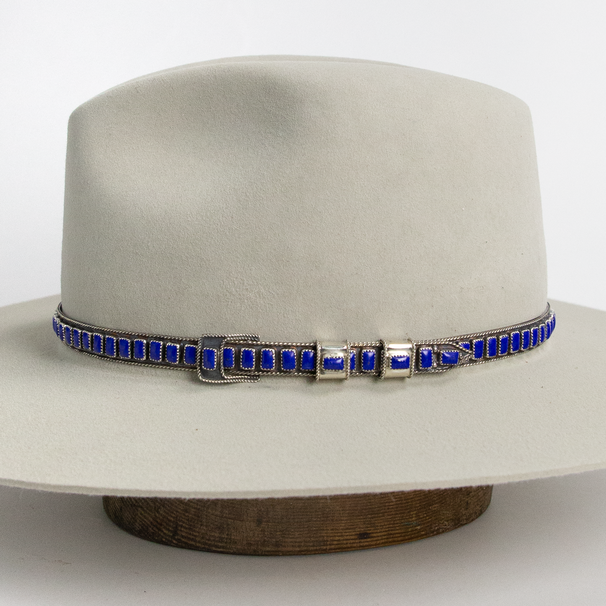 Intricately designed sterling silver and lapis lazuli hat band. Features individual pieces of hand inlaid lapis lazuli stone.