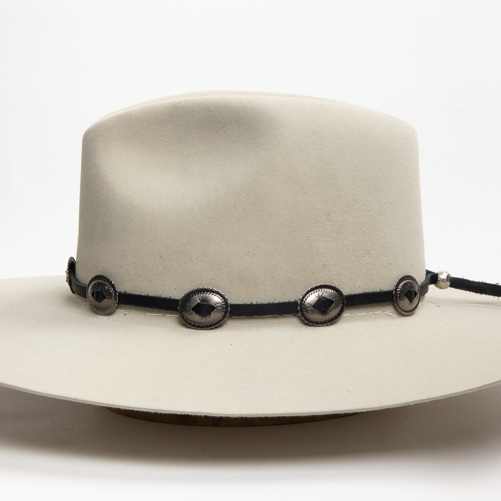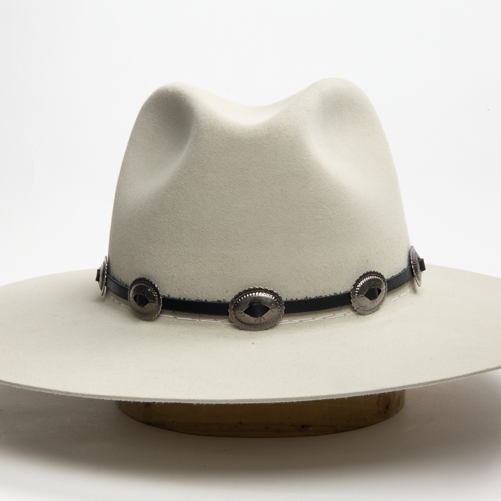 The Concho Leather Hat Band instantly adds a western twist to your hat styling. Typically does not cover any sweatband stitching on its own, so we recommend pairing with a ribbon or leather cord to ground everything to the hat. Each band features 9 conchos.