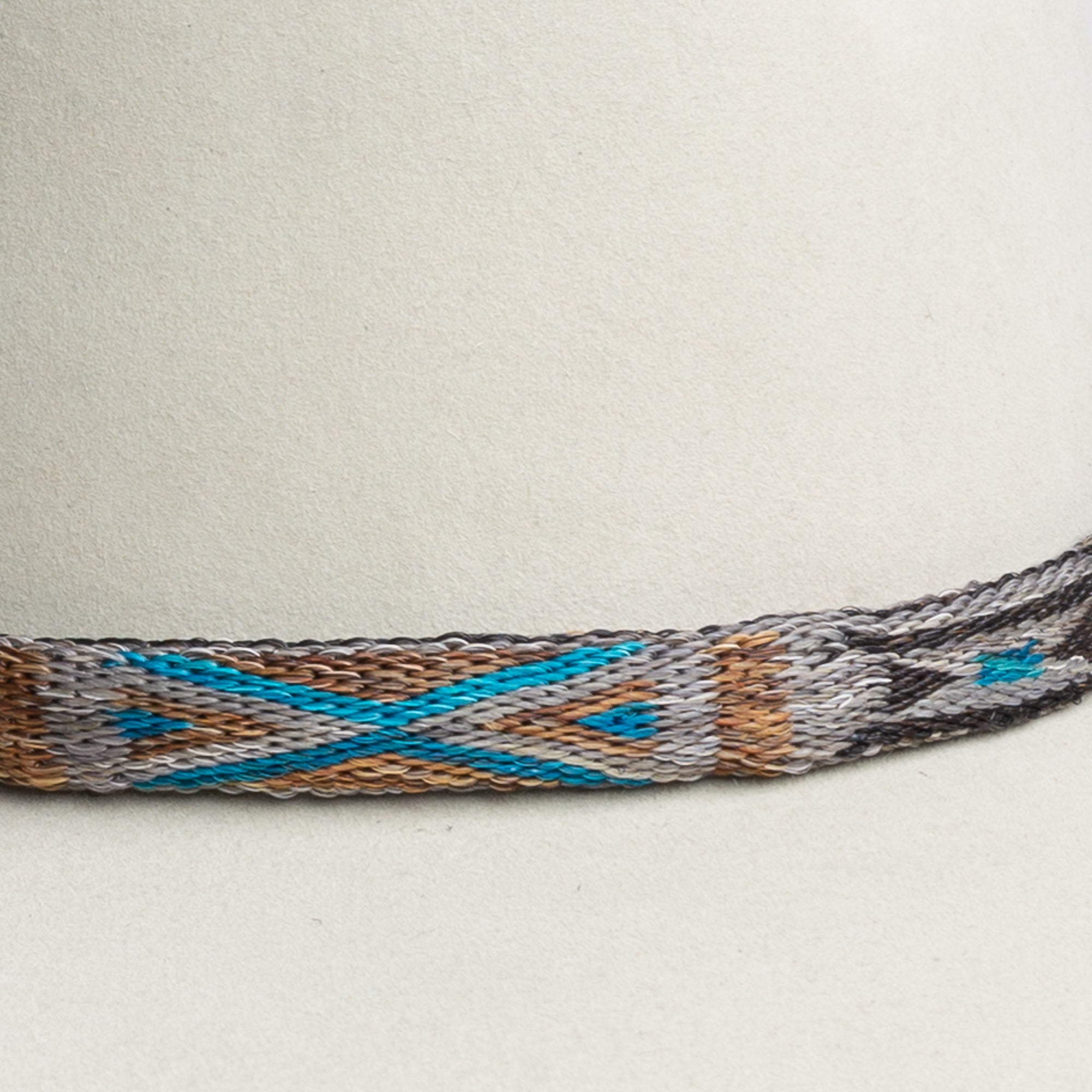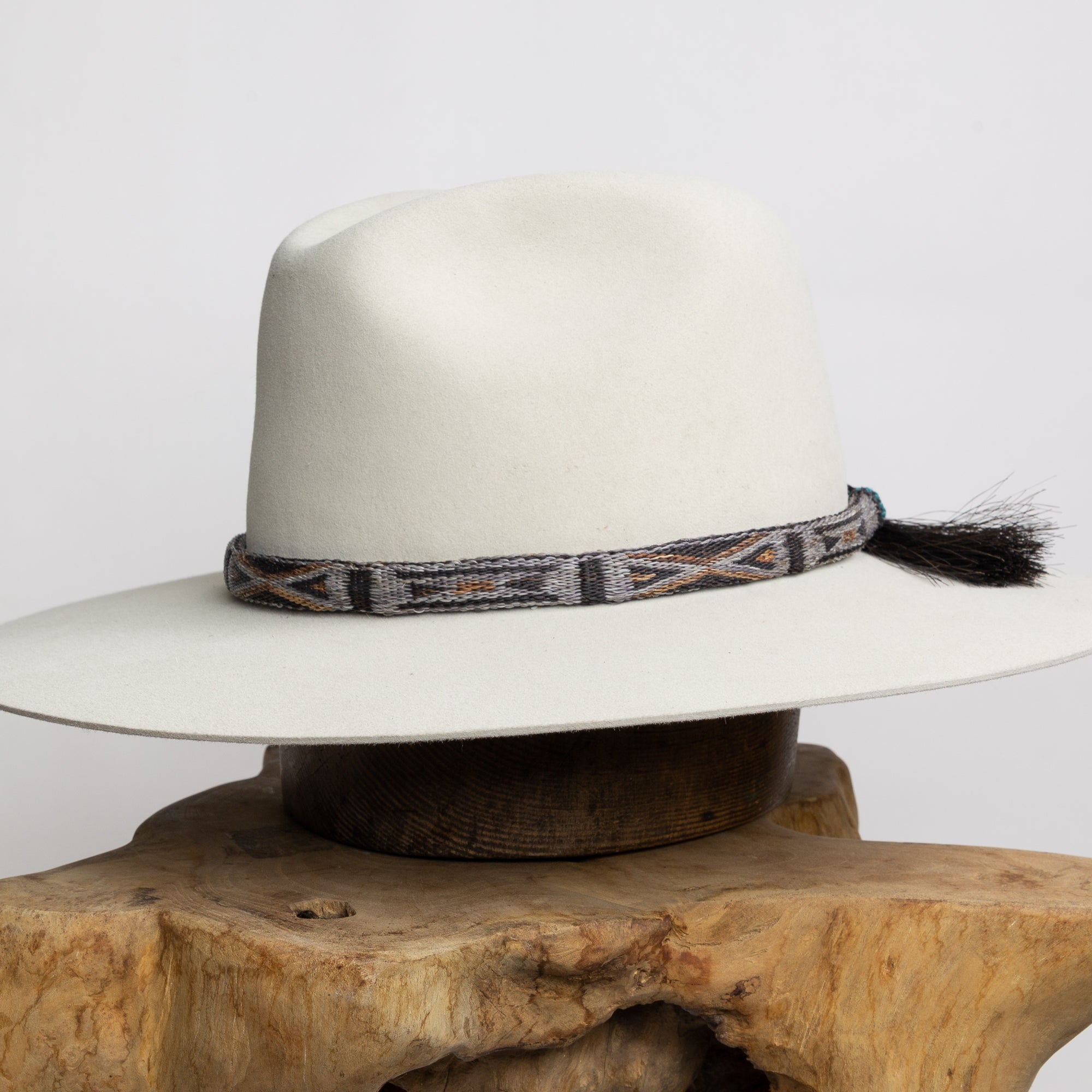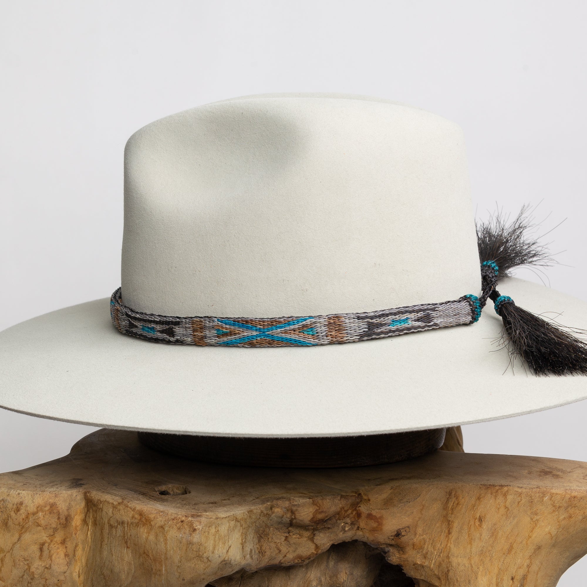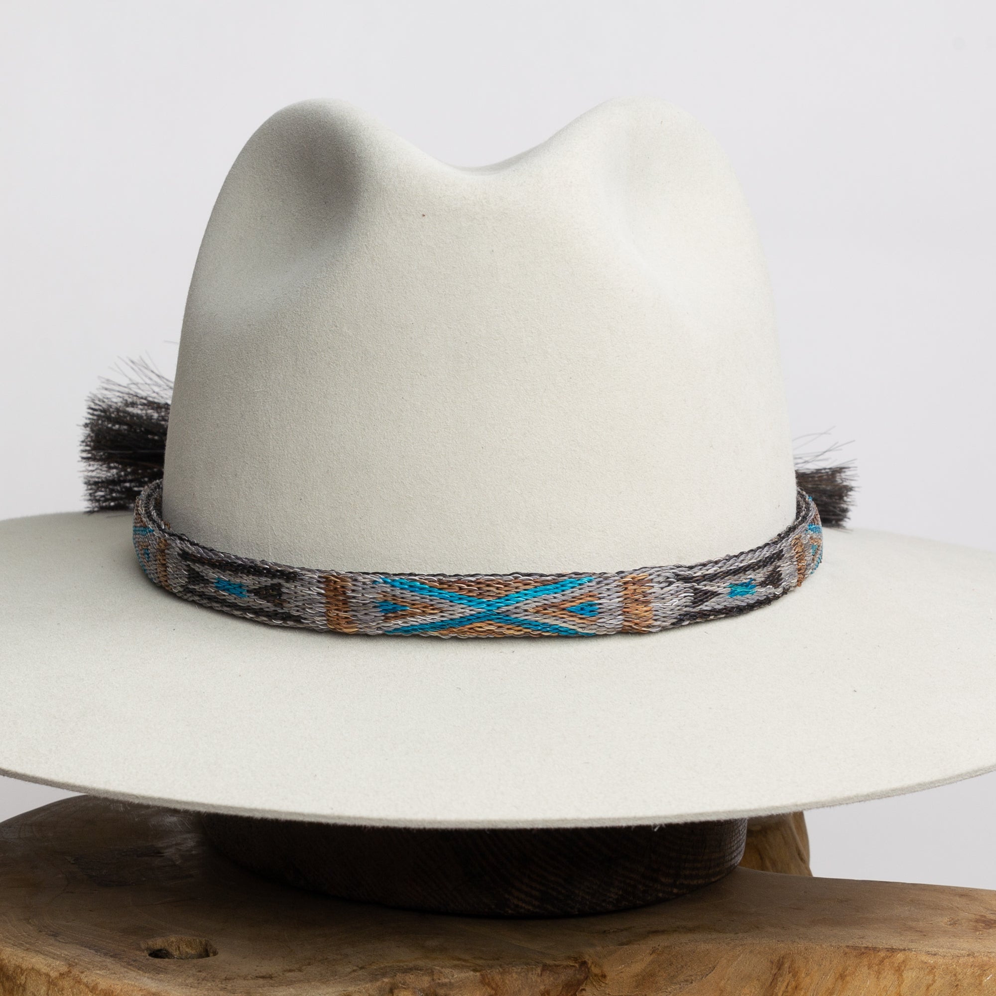 Turn heads with this hitched horsehair hat band. Hitching is the process of taking horse hair strands and knotting it into intricate geometric designs. Comes in a single tassel style and reversible double tassel style.