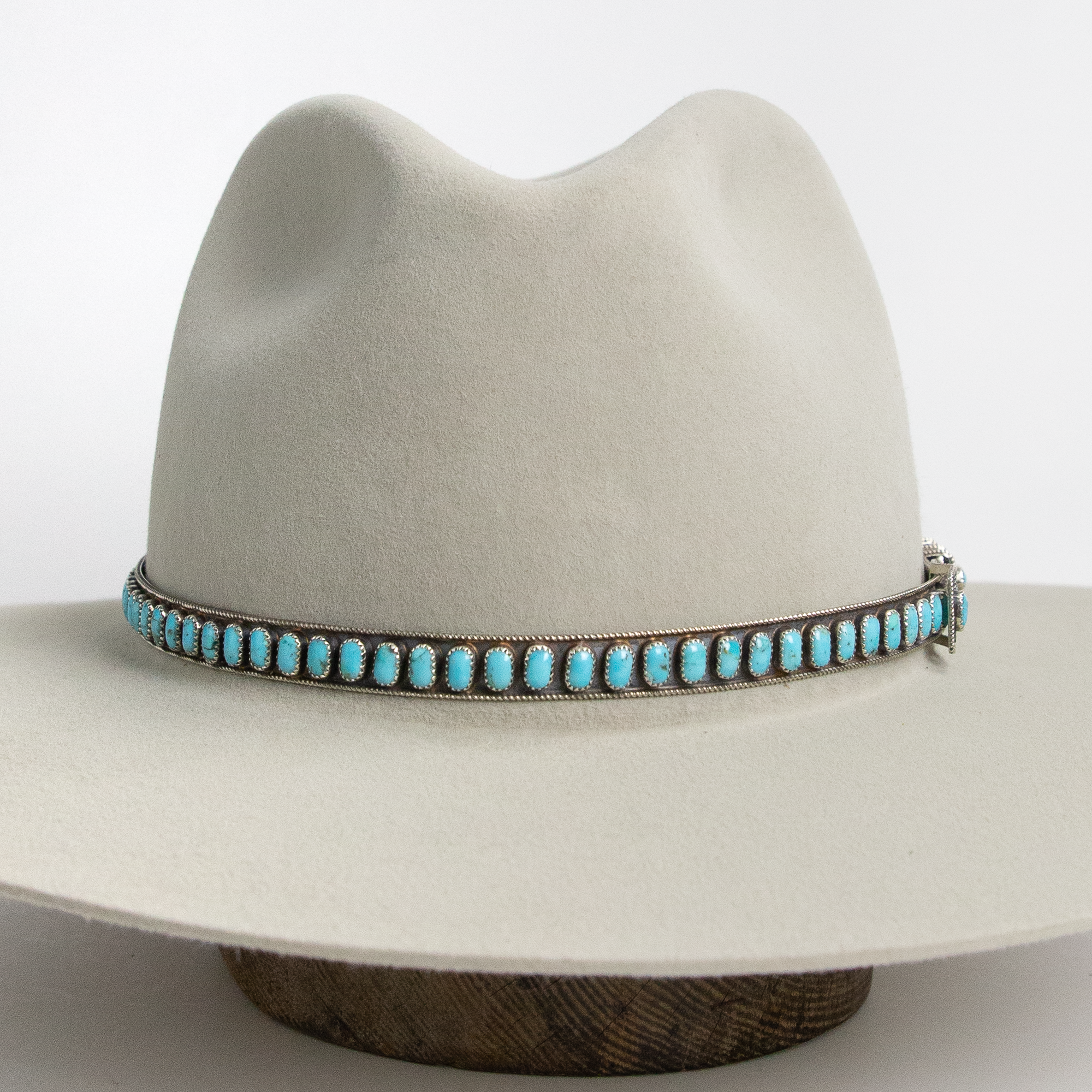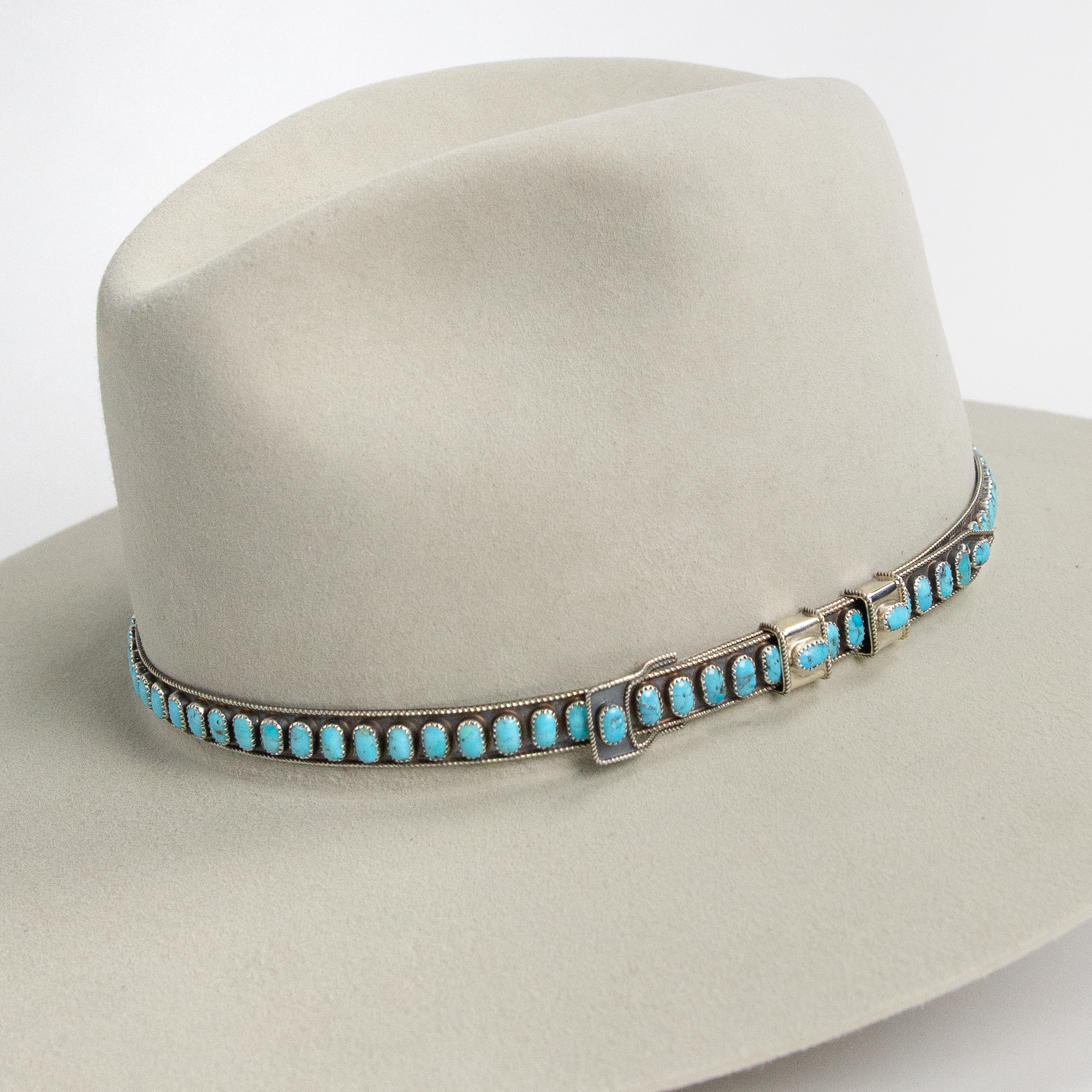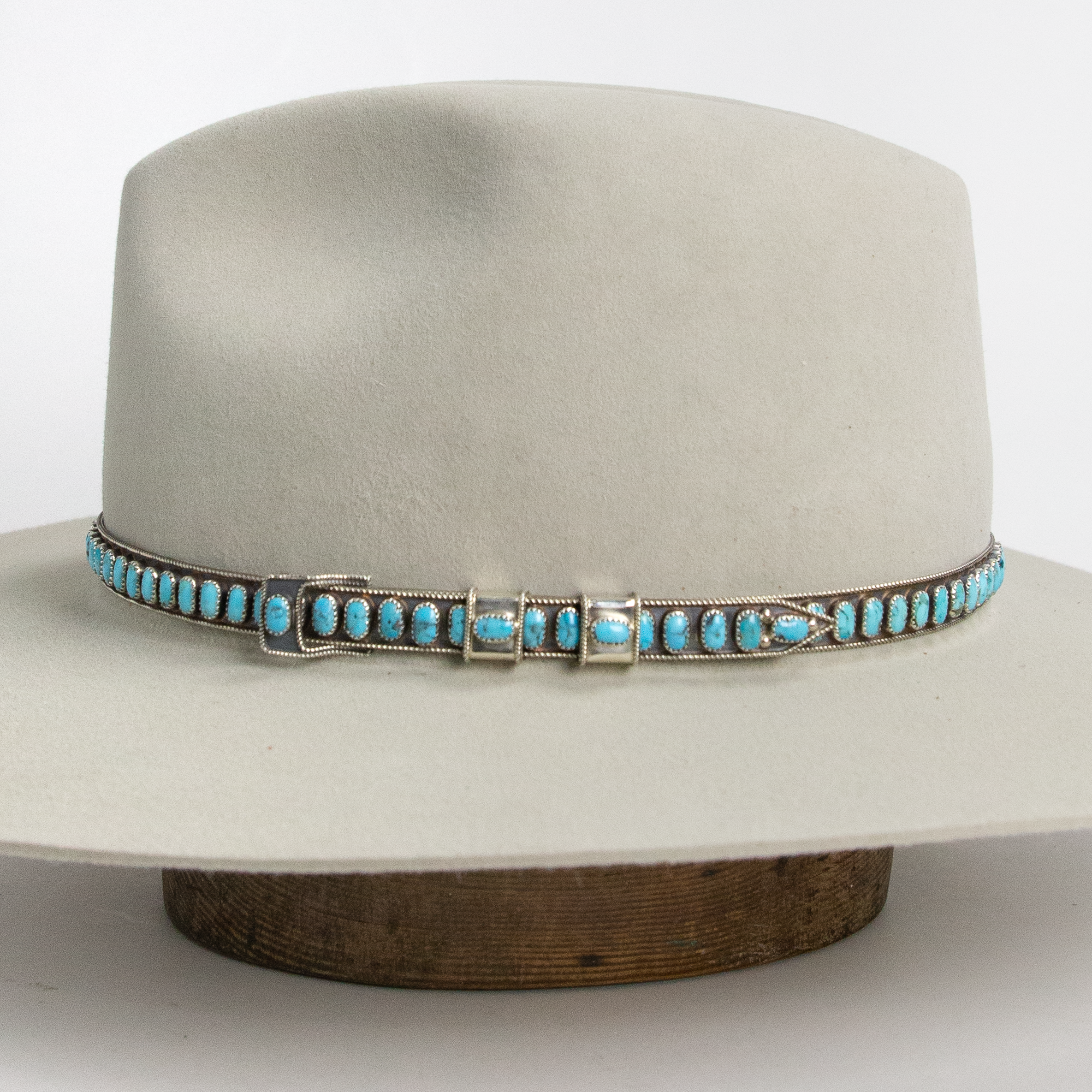 Intricately designed sterling silver and turquoise hat band. Features 87 individual pieces of hand turquoise gemstones.