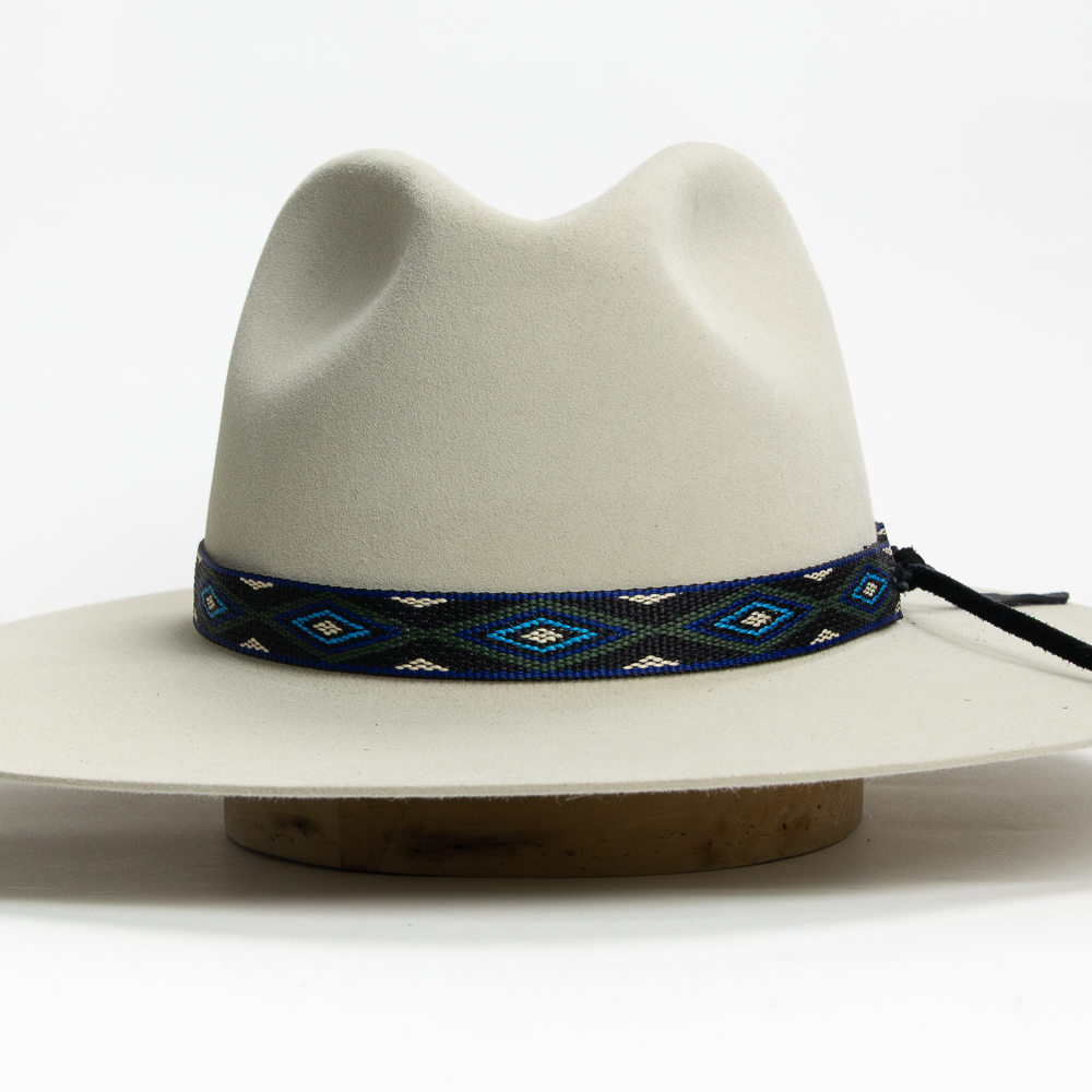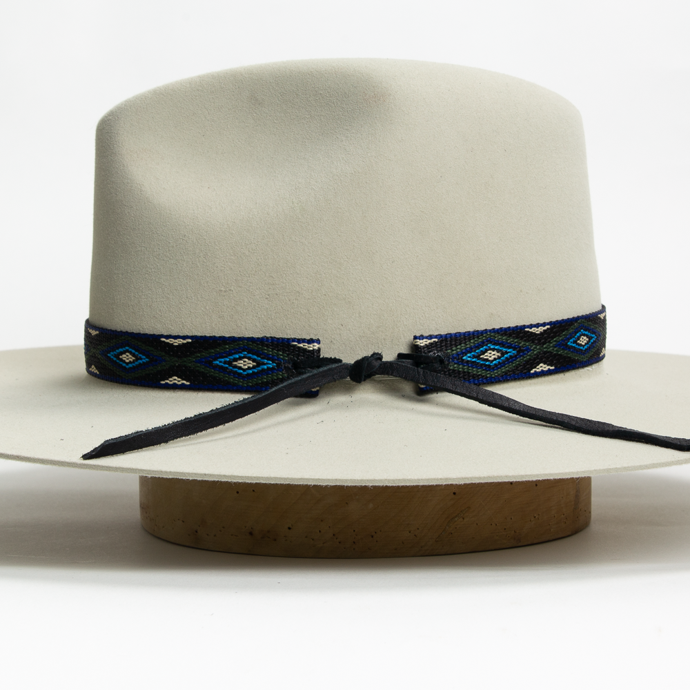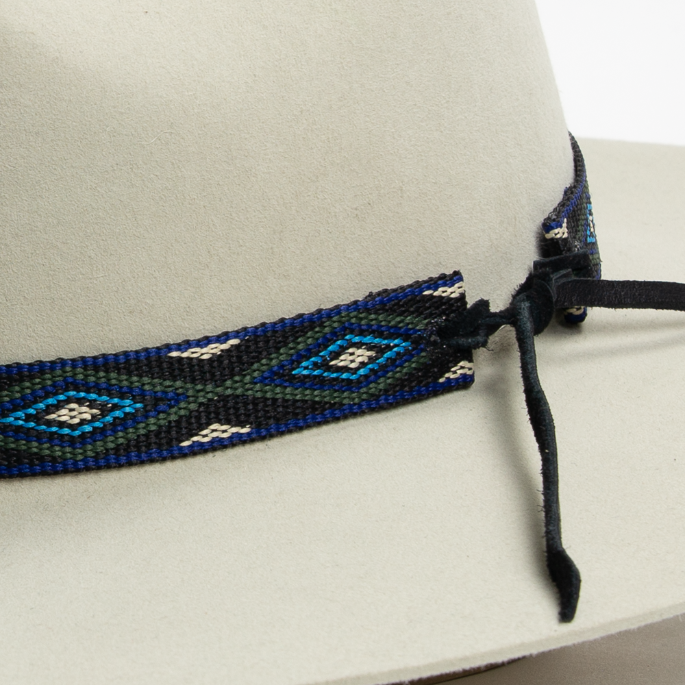 Muted greens and vibrant blues come together in this soft woven style hat band. You can secure the knot to the left side of the hat or to the back - whatever you please!