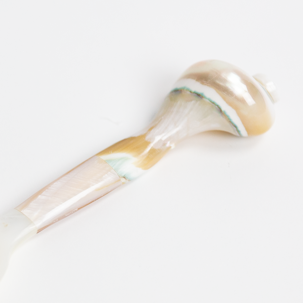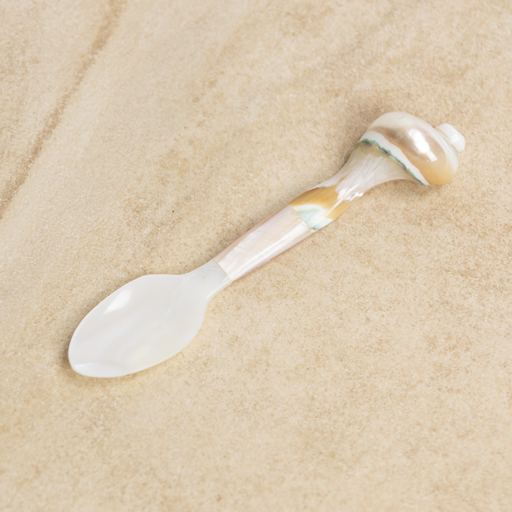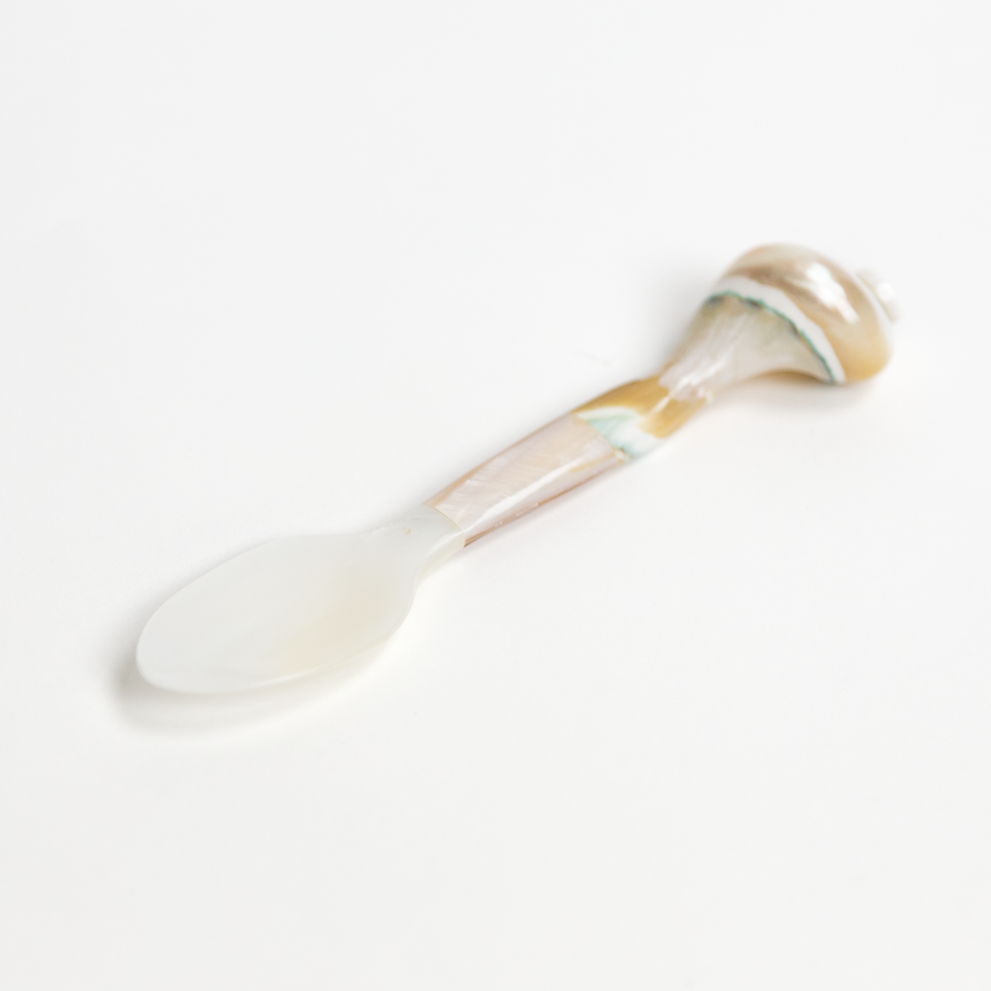 Add this spoon to an already eclectic mix of utensils. White shell spoon with multi-colored whorl base. Recommended use in cold dishes like caviar only.